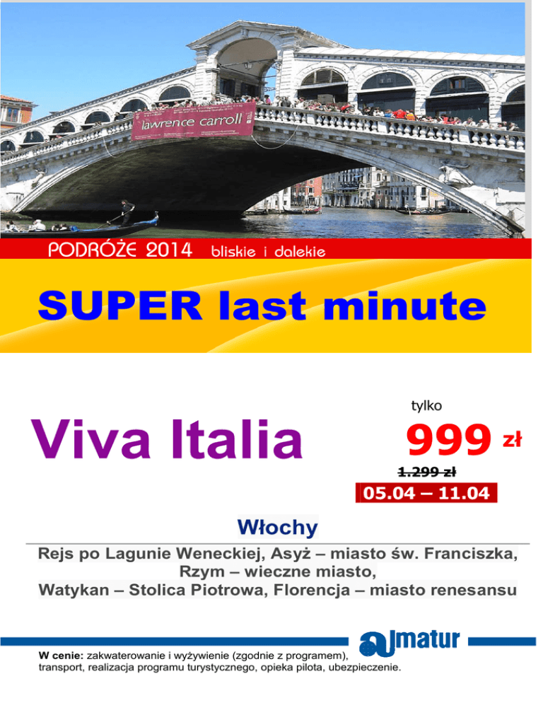 SUPER last minute tylko Viva Italia 999 zł 1.299 zł 05.04 – 11.04 Włochy Rejs po Lagunie Weneckiej, AsyŜ – miasto św. Franciszka, Rzym – wieczne miasto, Watykan – Stolica Piotrowa, Florencja – miasto renesansu W cenie: zakwaterowanie i wyŜywienie (zgodnie z programem), transport, realizacja programu turystycznego, opieka pilota, ubezpieczenie.