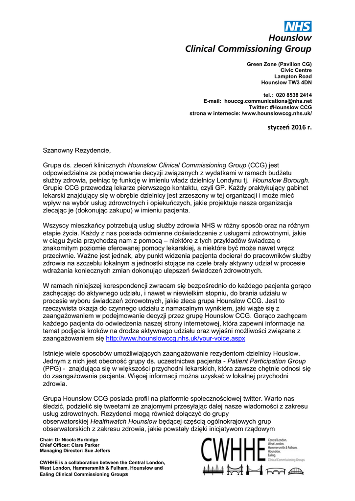 Green Zone (Pavilion CG) Civic Centre Lampton Road Hounslow TW3 4DN tel.: 020 8538 2414 E-mail: [email protected] Twitter: #Hounslow CCG strona w internecie: /www.hounslowccg.nhs.uk/ styczeń 2016 r. Szanowny Rezydencie, Grupa ds. zleceń klinicznych Hounslow Clinical Commissioning Group (CCG) jest odpowiedzialna za podejmowanie decyzji związanych z wydatkami w ramach budżetu służby zdrowia, pełniąc tę funkcję w imieniu władz dzielnicy Londynu tj. Hounslow Borough. Grupie CCG przewodzą lekarze pierwszego kontaktu, czyli GP. Każdy praktykujący gabinet lekarski znajdujący się w obrębie dzielnicy jest zrzeszony w tej organizacji i może mieć wpływ na wybór usług zdrowotnych i opiekuńczych, jakie projektuje nasza organizacja zlecając je (dokonując zakupu) w imieniu pacjenta. Wszyscy mieszkańcy potrzebują usług służby zdrowia NHS w różny sposób oraz na różnym etapie życia. Każdy z nas posiada odmienne doświadczenie z usługami zdrowotnymi, jakie w ciągu życia przychodzą nam z pomocą – niektóre z tych przykładów świadczą o znakomitym poziomie oferowanej pomocy lekarskiej, a niektóre być może nawet wręcz przeciwnie. Ważne jest jednak, aby punkt widzenia pacjenta docierał do pracowników służby zdrowia na szczeblu lokalnym a jednostki stojące na czele brały aktywny udział w procesie wdrażania koniecznych zmian dokonując ulepszeń świadczeń zdrowotnych. W ramach niniejszej korespondencji zwracam się bezpośrednio do każdego pacjenta gorąco zachęcając do aktywnego udziału, i nawet w niewielkim stopniu, do brania udziału w procesie wyboru świadczeń zdrowotnych, jakie zleca grupa Hounslow CCG. Jest to rzeczywista okazja do czynnego udziału z namacalnym wynikiem, jaki wiąże się z zaangażowaniem w podejmowanie decyzji przez grupę Hounslow CCG. Gorąco zachęcam każdego pacjenta do odwiedzenia naszej strony internetowej, która zapewni informacje na temat podjęcia kroków na drodze aktywnego udziału oraz wyjaśni możliwości związane z zaangażowaniem się http://www.hounslowccg.nhs.uk/your-voice.aspx Istnieje wiele sposobów umożliwiających zaangażowanie rezydentom dzielnicy Houslow. Jednym z nich jest obecność grupy ds. uczestnictwa pacjenta - Patient Participation Group (PPG) - znajdująca się w większości przychodni lekarskich, która zawsze chętnie odnosi się do zaangażowania pacjenta. Więcej informacji można uzyskać w lokalnej przychodni zdrowia. Grupa Hounslow CCG posiada profil na platformie społecznościowej twitter. Warto nas śledzić, podzielić się tweetami ze znajomymi przesyłając dalej nasze wiadomości z zakresu usług zdrowotnych. Rezydenci mogą również dołączyć do grupy obserwatorskiej Healthwatch Hounslow będącej częścią ogólnokrajowych grup obserwatorskich z zakresu zdrowia, jakie powstały dzięki inicjatywom rządowym Chair: Dr Nicola Burbidge Chief Officer: Clare Parker Managing Director: Sue Jeffers CWHHE is a collaboration between the Central London, West London, Hammersmith & Fulham, Hounslow and Ealing Clinical Commissioning Groups pozwalającym reprezentować interesy pacjentów. Więcej szczegółów można znaleźć na stronie internetowej http://www.healthwatchhounslow.co.uk/, do czego gorąco zachęcam. Ponadto rezydenci są zawsze chętnie widziani na comiesięcznych spotkaniach otwartych zarządu CCG. Szczegóły można znaleźć na ich stronach internetowych. Osoby chętne do zaangażowania się poprzez wyżej wymienione sposoby mogą wypełnić niewielki formularz załączony do niniejszej korespondencji odsyłając go w dołączonej kopercie na nasz adres, lub wysyłając nam maila na [email protected] (wysyłka nie wymaga znaczka pocztowego) Następnie adresat zostanie zaproszony do wzięcia udziału w rozmowie na temat wybranego rodzaju zaangażowania, oraz co będzie miało miejsce dalej. Z niecierpliwością oczekuję na Państwa korespondencję. Z wyrazami szacunku, Sue Jeffers Dyrektor wykonawczy