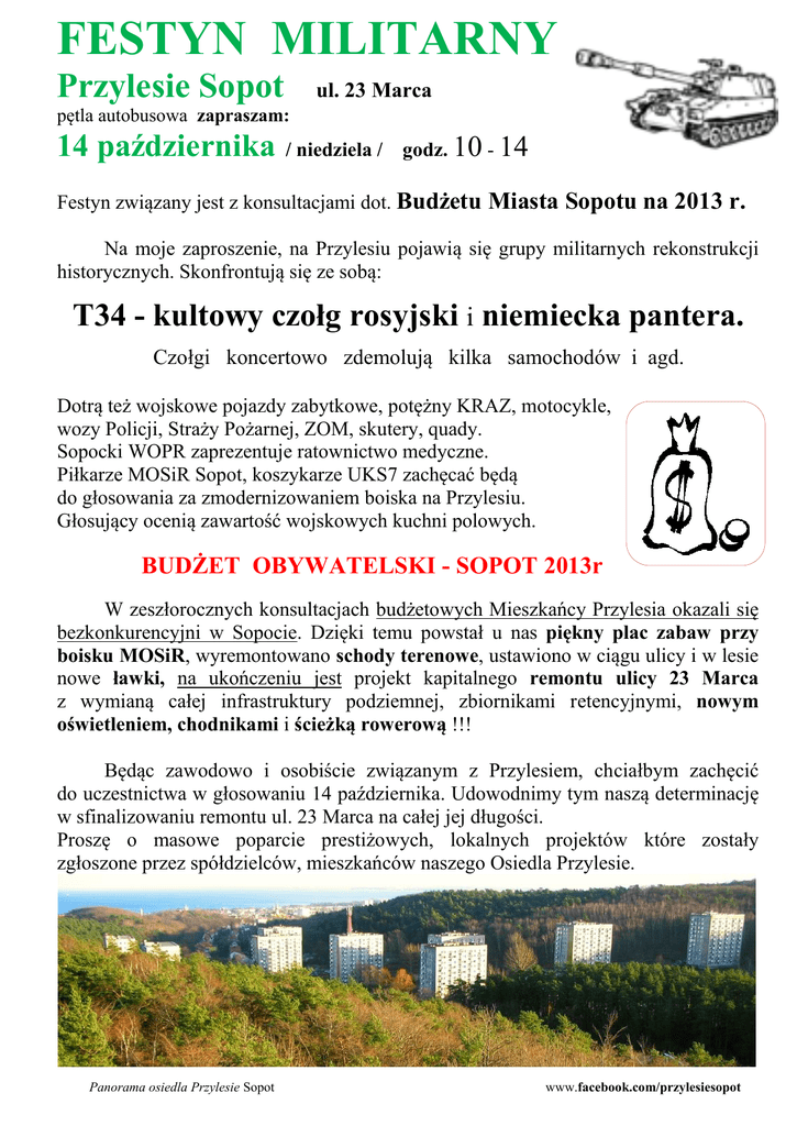 FESTYN MILITARNY Przylesie Sopot ul. 23 Marca pętla autobusowa zapraszam: 14 października / niedziela / godz. 10 - 14 Festyn związany jest z konsultacjami dot. Budżetu Miasta Sopotu na 2013 r. Na moje zaproszenie, na Przylesiu pojawią się grupy militarnych rekonstrukcji historycznych. Skonfrontują się ze sobą: T34 - kultowy czołg rosyjski i niemiecka pantera. Czołgi koncertowo zdemolują kilka samochodów i agd. Dotrą też wojskowe pojazdy zabytkowe, potężny KRAZ, motocykle, wozy Policji, Straży Pożarnej, ZOM, skutery, quady. Sopocki WOPR zaprezentuje ratownictwo medyczne. Piłkarze MOSiR Sopot, koszykarze UKS7 zachęcać będą do głosowania za zmodernizowaniem boiska na Przylesiu. Głosujący ocenią zawartość wojskowych kuchni polowych. BUDŻET OBYWATELSKI - SOPOT 2013r W zeszłorocznych konsultacjach budżetowych Mieszkańcy Przylesia okazali się bezkonkurencyjni w Sopocie. Dzięki temu powstał u nas piękny plac zabaw przy boisku MOSiR, wyremontowano schody terenowe, ustawiono w ciągu ulicy i w lesie nowe ławki, na ukończeniu jest projekt kapitalnego remontu ulicy 23 Marca z wymianą całej infrastruktury podziemnej, zbiornikami retencyjnymi, nowym oświetleniem, chodnikami i ścieżką rowerową !!! Będąc zawodowo i osobiście związanym z Przylesiem, chciałbym zachęcić do uczestnictwa w głosowaniu 14 października. Udowodnimy tym naszą determinację w sfinalizowaniu remontu ul. 23 Marca na całej jej długości. Proszę o masowe poparcie prestiżowych, lokalnych projektów które zostały zgłoszone przez spółdzielców, mieszkańców naszego Osiedla Przylesie. Panorama osiedla Przylesie Sopot www.facebook.com/przylesiesopot BUDŻET OBYWATELSKI MIASTA SOPOTU - Przylesie 2013r Do prestiżowych projektów lokalnych z listy Przylesia zaliczają się: projekt nr 3 - budowa boiska treningowego ze sztuczną nawierzchnią przy 23 Marca. Inwestycja prestiżowa dla całej dzielnicy i Sopotu, stąd przeznaczono na jej realizację w naszym okręgu aż ponad 1,2 mln zł z budżetu Miasta Sopotu. projekt nr 8 - „Aktywność sportowa szansą dla Twojego zdrowia” – popularyzacja grupowych zajęć rekreacyjno - sportowych nordic walking z instruktorem. Projekt nr 8 to jedyny zgłoszony w całym Sopocie projekt tzw. miękki, niezwiązany z budową czy remontem infrastruktury technicznej. Dlatego, tym bardziej warty jest Państwa poparcia i głosów. Duża frekwencja w zbliżającym się głosowaniu i skoncentrowanie głosów na zaproponowanych powyżej inicjatywach, pozwoli mi jeszcze efektywniej reprezentować w Radzie Miasta Sopotu Was - Mieszkańców Przylesia. Niska frekwencja, rozbicie głosów na różne inicjatywy to strata dla Przylesia ponad 1,2 mln zł przewidzianych na infrastrukturę sportową i czynny sport w 2013r !!! Analiza dokumentacji remontu ulicy 23 Marca, VI 2012r. Zarząd SM Przylesie Piotr Kurdziel i Barbara Lechman. Zadecydujmy o przeznaczeniu środków z budżetu Sopotu na naszym Przylesiu w 2013r. Piotr Kurdziel Radny Miasta Sopotu Przewodniczący Komisji Rewizyjnej www.smprzylesie.pl www.facebook.com/przylesiesopot ….……………………………………………………………………………………………… Przyjdź do punktu wyborczego z tym zaproszeniem. Załączony kupon uprawnia do degustacji frontowego posiłku z kuchni polowych do ostatniej porcji. Życzę dobrej zabawy Gratulujemy dobrych dla Przylesia decyzji. Potwierdzenie głosowania i kuponu przez komisję wyborczą.