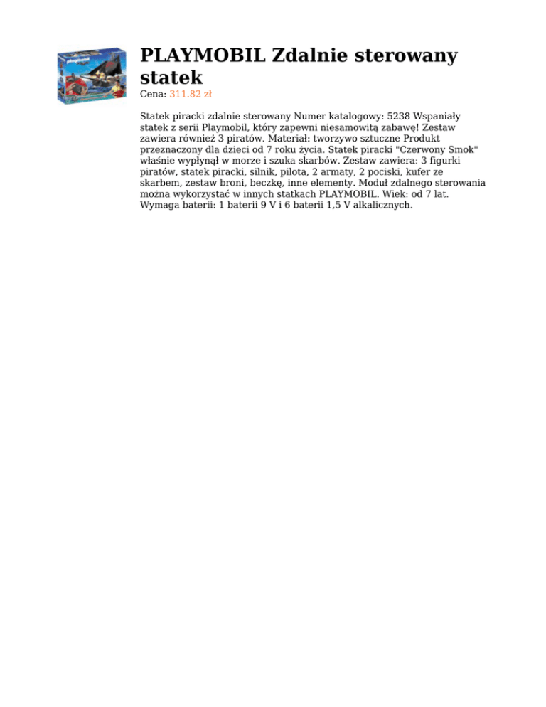 PLAYMOBIL Zdalnie sterowany statek Cena: 311.82 zł Statek piracki zdalnie sterowany Numer katalogowy: 5238 Wspaniały statek z serii Playmobil, który zapewni niesamowitą zabawę! Zestaw zawiera również 3 piratów. Materiał: tworzywo sztuczne Produkt przeznaczony dla dzieci od 7 roku życia. Statek piracki "Czerwony Smok" właśnie wypłynął w morze i szuka skarbów. Zestaw zawiera: 3 figurki piratów, statek piracki, silnik, pilota, 2 armaty, 2 pociski, kufer ze skarbem, zestaw broni, beczkę, inne elementy. Moduł zdalnego sterowania można wykorzystać w innych statkach PLAYMOBIL. Wiek: od 7 lat. Wymaga baterii: 1 baterii 9 V i 6 baterii 1,5 V alkalicznych.