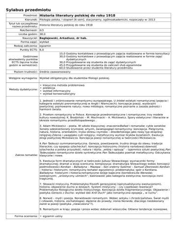 Sylabus przedmiotu Przedmiot: Historia literatury polskiej do roku 1918 Kierunek: Filologia polska, I stopień [6 sem], stacjonarny, ogólnoakademicki, rozpoczęty w: 2013 Tytuł lub szczegółowa Historia literatury polskiej do roku 1918 nazwa przedmiotu: Rok/Semestr: II/3 Liczba godzin: 30,0 Nauczyciel: Bagłajewski, Arkadiusz, dr hab. Forma zajęć: wykład Rodzaj zaliczenia: egzamin Punkty ECTS: 6,0 15,0 Godziny kontaktowe z prowadzącym zajęcia realizowane w formie konsultacji 30,0 Godziny kontaktowe z prowadzącym zajęcia realizowane w formie zajęć dydaktycznych 30,0 Przygotowanie się studenta do zajęć dydaktycznych 45,0 Przygotowanie się studenta do zaliczeń i/lub egzaminów 60,0 Studiowanie przez studenta literatury przedmiotu Godzinowe ekwiwalenty punktów ECTS (łączna liczba godzin w semestrze): Poziom trudności: średnio zaawansowany Wstępne wymagania: Wykład obligatoryjny dla studentów filologii polskiej. • • Metody dydaktyczne: • • klasyczna metoda problemowa prelekcja wykład informacyjny wykład konwersatoryjny 1. Jedność i zróżnicowanie romantyzmu europejskiego. U źródeł estetyki romantycznej (pojęcia i kategorie estetyki preromantycznej w Anglii i Niemczech); koncepcje poezji, wyobraźni poetyckiej; pojmowanie natury; nowa mitologia; romantyczne poznanie a zasada jedności i harmonii świata. 2. Przełom romantyczny w Polsce. Koncepcje przedromantyczne i romantyczne; trzy modele kultury nowożytnej: K. Brodziński – M. Mochnacki – A. Mickiewicz. Spory estetyczne i literackie w okresie romantyzmu przedlistopadowego . 3. Adam Mickiewicz – poeta. W szkole klasycznej; znaczenie Ballad i romansów; cykle sonetów: Sonety odeskieiSonety krymskie; artyzm, światopogląd romantyczny: koncepcja. Pielgrzyma, natura, historia, orientalizm; liryka okresu rzymsko – drezdeńskiego jako nowy typ ekspresji religijnej;Zdania i uwagijako cykl religijny; metafizyczny wymiar liryków lozańskich. Ewolucja drogi poetyckiej Mickiewicza. Koncepcja poezji romantycznej w twórczości Mickiewicza. 4.Pan Tadeusz–summaromantyczna. Geneza, powstawanie, trudna droga do sławy; tradycje literackie; czy epopeja szlachecka?; koncepcja historyzmu (historia narodowa);dawność szlachecka a polska przyszłość; natura i idylla; „widzę i opisuję” – tajemnice sztuki poetyckiej ;Pan Tadeuszjako romantyczne dzieło synkretyczne.Pan Tadeuszjako poemat metafizyczny. Odczytania Zakres tematów: klasyczne i nowe. 5. Ewolucja form dramatycznych w twórczości Juliusz Słowackiego; wyznaczniki formy dramatycznej; dramat a wizja sceniczna; kompozycja; dramaturgia Słowackiego wobec koncepcji podmiotowości;Kordian – Balladyna – Mazepa – Sen srebrny Salomei – Samuel Zborowski .Kordian – historia i historyzm; romantyczny bohater egzystencji; problematyka; spór o Kordiana. Balladyna– historyzm i historia;romantyczne dzieje bajeczne (kontekst Lilla Weneda); szekspiryzm; „ariostyczny uśmiech”; baśniowość jako kategoria estetyczna; koncepcja ironii tragicznej. 7. Słowacki mistyczny. Problematyka filozofii genezyjskiej (spirytualistyczny ewolucjonizm), historia; objawienie ducha w dziejach. System mistyczny – czy cząstkowe rewelacje? Problematyka filologiczna dzieła mistycznego. Koncepcja dzieła fragmentarycznego. Objawienie i poetyka.Genezis z Ducha– wykład idei.Król Duch” jako romantyczna epopeja „ w ruchu”. 8. Norwid – myśl i poezja. Norwidowski romantyzm. Wobec antyku i chrześcijaństwa. Świat myśli ( człowiek, historia, eschatologia); dążenie do prawdy; ironia Norwida; dlaczego niedokonany zwrot w poezji (poetyka „niewczesna”?). 9. Romantyzm w kraju: poezja i proza wobec dokonań wieszczów. Główne tendencje rozwojowe. Forma oceniania: • egzamin ustny Spis lektur podstawowych:Idee programowe romantyków polskich, opr. A. Kowalczykowa, Wrocław 1991, BN I 261 (orientacja w całości);Malczewski A. , Maria, opr. R. Przybylski, Wrocław 1958, BN I 46; Mickiewicz A.,Wybór poezyj, t. 1-2, opr. Cz. Zgorzelski, Wrocław 1974 – 1986, BN I 6, 66; Mickiewicz A., Konrad Wallenrod, opr. S. Chwin, Wrocław 1991, BN I 72; Mickiewicz A. , Dziady. Część II, IV i I,opr. S. Pigoń, posł. Z. Stefanowska, Warszawa 1977.;Mickiewicz A., Dziady. Część III, opr. S. Pigoń, posł. Z. Stefanowska, Warszawa 1984; Mickiewicz A., Księgi narodu polskiego i pielgrzymstwa polskiego, opr. Z. Stefanowska, Wrocław 1956, BN I 17;Mickiewicz A., Pan Tadeusz czyli Ostatni zajazd na Litwie, opr. S. Pigoń, Wrocław 1971, BN I 83 ; Słowacki J., Dzieł a, pod red. J. Krzyżanowskiego, Wrocław 1959, t. 1 : Liryki i inne wiersze ;Słowacki J.,Powieści poetyckie, opr. M. Ursel, Wrocław 1987, BN I 47 (Lambro); Słowacki J.,Kordian,opr. M. Inglot, Wrocław 1986, BN I 2 ; Słowacki J.,Balladyna, opr. M. Inglot, Wrocław 1984, BN I 51; Słowacki J. , Beniowski, opr. A. Kowalczykowa, Wrocław 1998, BN I ; Słowacki J. , Ksiądz Marek, opr. M. Piwińska, Wrocław 1991, BN I 29 lub Słowacki J., Sen srebrny Salomei, opr. A. Kowalczykowa, Wrocław 1992, BN I 57;Krasiński Z., Nie – Boska komedia, opr. M. Janion i M. Grabowska, Wrocław 1974, BN I 24; Krasiński Z., Irydion, opr. W. Kubacki, Wrocław 1967, BN I 42; Fredro A., Śluby panieńskie, opr. M. Inglot, Wrocław 1972, BN I 22; Fredro A., Zemsta, opr. M. Inglot, Wrocław 1967, BN I 32; Norwid C.K.,Vade – mecum, opr. J. Fert, Wrocław 1990, BN I 271.; Norwid C.K , Pierścień Wielkiej Damy, opr. S. Świontek, Wrocław 1990, BN I 274;Norwid C.K., Pisma wybrane, opr. J. W. Gomulicki, Warszawa 1968 : t. 2 : Promethidion;,t. 4: Czarne kwiaty, Białe kwiaty,Stygmat, „Ad leones!”,;Rzewuski H.,Pamiątki Soplicy, opr.Z. Lewinówna, wstęp M. Żmigrodzka, Warszawa 1961; Żmichowska N., Poganka, opr. T. Żeleński – Boy, Wrocław 1950, BN I 121; Kraszewski J. I.,Stara Baśń, opr. W. Danek, Wrocław 1988, BN I 53; Lektury zalecane:Goszczyński S.,Zamek kaniowski,opr. M. Janion, Warszawa 1958; Mochn