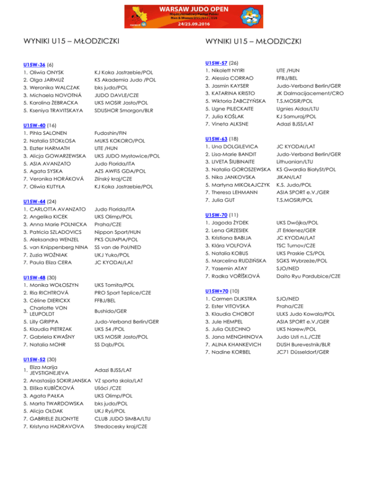 WYNIKI U15 – MŁODZICZKI WYNIKI U15 – MŁODZICZKI U15W-36 (6) U15W-57 (26) KJ Koka Jastrzebie/POL 1. Nikolett NYIRI UTE /HUN KS Akademia Judo /POL 2. Alessia CORRAO FFBJ/BEL 3. Weronika WALCZAK bks judo/POL 3. Jasmin KAYSER Judo-Verband Berlin/GER 3. Michaela NOVOTNÁ JUDO DAVLE/CZE 3. KATARINA KRISTO JK Dalmacijacement/CRO 5. Karolina ŻEBRACKA UKS MOSiR Jasło/POL 5. Wiktoria ŻABCZYŃSKA T.S.MOSiR/POL SDUSHOR Smorgon/BLR 5. Ugne PILECKAITE Ugnies Aidas/LTU 7. Julia KOŚLAK KJ Samuraj/POL 7. Vineta ALKSNE Adazi BJSS/LAT 1. Oliwia ONYSK 2. Olga JARMUŻ 5. Kseniya TRAVITSKAYA U15W-40 (16) 1. Pihla SALONEN Fudoshin/FIN 2. Natalia STOKŁOSA MUKS KOKORO/POL U15W-63 (18) 3. Eszter HARMATH UTE /HUN 1. Una DOLGILEVICA JC KYODAI/LAT 3. Alicja GOWARZEWSKA UKS JUDO Mysłowice/POL 2. Lisa-Marie BANDIT Judo-Verband Berlin/GER 5. ASIA AVANZATO Judo Florida/ITA 3. LIVETA ŠIUBINAITE Lithuanian/LTU 5. Agata SYSKA AZS AWFiS GDA/POL 3. Natalia GOROSZEWSKA KS Gwardia BiałySt/POL 7. Veronika HORÁKOVÁ Zlínský kraj/CZE 5. Nika JANKOVSKA JIKAN/LAT KJ Koka Jastrzebie/POL 5. Martyna MIKOŁAJCZYK K.S. Judo/POL 7. Theresa LEHMANN ASIA SPORT e.V./GER 7. Julia GUT T.S.MOSiR/POL 7. Oliwia KUTYŁA U15W-44 (24) 1. CARLOTTA AVANZATO Judo Florida/ITA 2. Angelika KICEK UKS Olimp/POL U15W-70 (11) 3. Anna Marie POLNICKA Praha/CZE 1. Jagoda ŻYDEK UKS Dwójka/POL Nippon Sport/HUN 2. Lena GRZESIEK JT Erklenez/GER PKS OLIMPIA/POL 3. Kristiana BABIJA JC KYODAI/LAT SS van de Pol/NED 3. Klára VOLFOVÁ TSC Turnov/CZE 7. Zuzia WOŹNIAK UKJ Yuko/POL 5. Natalia KOBUS UKS Praskie CS/POL 7. Paula Eliza CERA JC KYODAI/LAT 5. Marcelina RUDZIŃSKA SGKS Wybrzeże/POL 7. Yasemin ATAY SJO/NED 7. Radka VOŘÍŠKOVÁ Daito Ryu Pardubice/CZE 3. Patricia SZLADOVICS 5. Aleksandra WENZEL 5. van Knippenberg NINA U15W-48 (30) 1. Monika WOŁOSZYN UKS Tomita/POL 2. Ria RICHTROVÁ PRO Sport Teplice/CZE U15W+70 (10) 3. Céline DIERICKX FFBJ/BEL 1. Carmen DIJKSTRA SJO/NED Charlotte VON 3. LEUPOLDT Bushido/GER 2. Ester VITOVSKA Praha/CZE 3. Klaudia CHOBOT ULKS Judo Kowala/POL 5. Lilly GRIPPA Judo-Verband Berlin/GER 3. Jule HEMPEL ASIA SPORT e.V./GER 5. Klaudia PIETRZAK UKS 54 /POL 5. Julia OLECHNO UKS Narew/POL 7. Gabriela KWAŚNY UKS MOSiR Jasło/POL 5. Jana MENGHINOVA Judo Usti n.L./CZE 7. Natalia MOHR SS Dąb/POL 7. ALINA KHANKEVICH DUSH Burevestnik/BLR 7. Nadine KORBEL JC71 Düsseldorf/GER U15W-52 (30) 1. Eliza Marija JEVSTIGNEJEVA Adazi BJSS/LAT 2. Anastasija SOKIRJANSKA VZ sporta skola/LAT 3. Eliška KUBÍČKOVÁ Ušáci /CZE 3. Agata PAŁKA UKS Olimp/POL 5. Marta TWARDOWSKA bks judo/POL 5. Alicja OŁDAK UKJ Ryś/POL 7. GABRIELE ZILIONYTE CLUB JUDO SIMBA/LTU 7. Kristyna HADRAVOVA Stredocesky kraj/CZE
