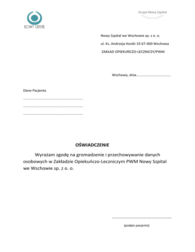 Nowy Szpital we Wschowie sp. z o. o. ul. Ks. Andrzeja Kostki 33 67-400 Wschowa ZAKŁAD OPIEKUŃCZO-LECZNICZY/PWM Wschowa, dnia................................... Dane Pacjenta .................................................................. .................................................................. .................................................................. OŚWIADCZENIE Wyrażam zgodę na gromadzenie i przechowywanie danych osobowych w Zakładzie Opiekuńczo-Leczniczym PWM Nowy Szpital we Wschowie sp. z o. o. ............................................. (podpis pacjenta)