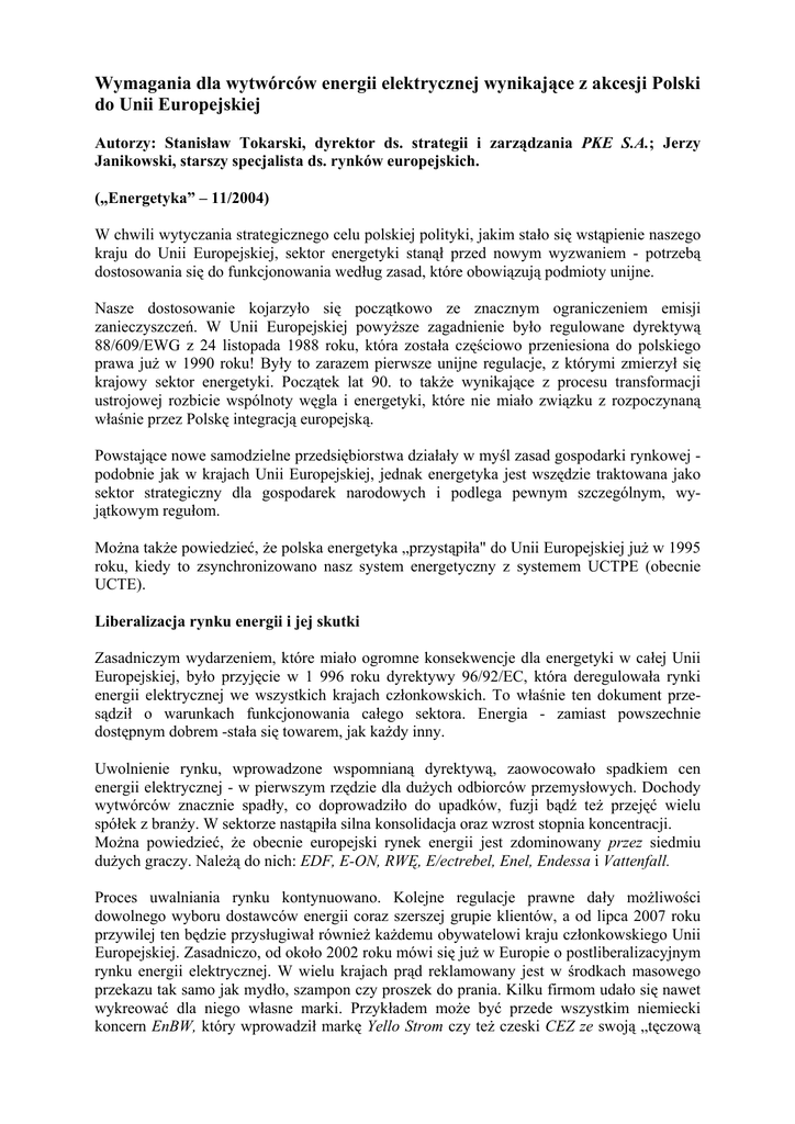 Wymagania dla wytwórców energii elektrycznej wynikające z akcesji Polski do Unii Europejskiej Autorzy: Stanisław Tokarski, dyrektor ds. strategii i zarządzania PKE S.A.; Jerzy Janikowski, starszy specjalista ds. rynków europejskich. („Energetyka” – 11/2004) W chwili wytyczania strategicznego celu polskiej polityki, jakim stało się wstąpienie naszego kraju do Unii Europejskiej, sektor energetyki stanął przed nowym wyzwaniem - potrzebą dostosowania się do funkcjonowania według zasad, które obowiązują podmioty unijne. Nasze dostosowanie kojarzyło się początkowo ze znacznym ograniczeniem emisji zanieczyszczeń. W Unii Europejskiej powyższe zagadnienie było regulowane dyrektywą 88/609/EWG z 24 listopada 1988 roku, która została częściowo przeniesiona do polskiego prawa już w 1990 roku! Były to zarazem pierwsze unijne regulacje, z którymi zmierzył się krajowy sektor energetyki. Początek lat 90. to także wynikające z procesu transformacji ustrojowej rozbicie wspólnoty węgla i energetyki, które nie miało związku z rozpoczynaną właśnie przez Polskę integracją europejską. Powstające nowe samodzielne przedsiębiorstwa działały w myśl zasad gospodarki rynkowej podobnie jak w krajach Unii Europejskiej, jednak energetyka jest wszędzie traktowana jako sektor strategiczny dla gospodarek narodowych i podlega pewnym szczególnym, wyjątkowym regułom. Można także powiedzieć, że polska energetyka „przystąpiła" do Unii Europejskiej już w 1995 roku, kiedy to zsynchronizowano nasz system energetyczny z systemem UCTPE (obecnie UCTE). Liberalizacja rynku energii i jej skutki Zasadniczym wydarzeniem, które miało ogromne konsekwencje dla energetyki w całej Unii Europejskiej, było przyjęcie w 1 996 roku dyrektywy 96/92/EC, która deregulowała rynki energii elektrycznej we wszystkich krajach członkowskich. To właśnie ten dokument przesądził o warunkach funkcjonowania całego sektora. Energia - zamiast powszechnie dostępnym dobrem -stała się towarem, jak każdy inny. Uwolnienie rynku, wprowadzone wspomnianą dyrektywą, zaowocowało spadkiem cen energii elektrycznej - w pierwszym rzędzie dla dużych odbiorców przemysłowych. Dochody wytwórców znacznie spadły, co doprowadziło do upadków, fuzji bądź też przejęć wielu spółek z branży. W sektorze nastąpiła silna konsolidacja oraz wzrost stopnia koncentracji. Można powiedzieć, że obecnie europejski rynek energii jest zdominowany przez siedmiu dużych graczy. Należą do nich: EDF, E-ON, RWĘ, E/ectrebel, Enel, Endessa i Vattenfall. Proces uwalniania rynku kontynuowano. Kolejne regulacje prawne dały możliwości dowolnego wyboru dostawców energii coraz szerszej grupie klientów, a od lipca 2007 roku przywilej ten będzie przysługiwał również każdemu obywatelowi kraju członkowskiego Unii Europejskiej. Zasadniczo, od około 2002 roku mówi się już w Europie o postliberalizacyjnym rynku energii elektrycznej. W wielu krajach prąd reklamowany jest w środkach masowego przekazu tak samo jak mydło, szampon czy proszek do prania. Kilku firmom udało się nawet wykreować dla niego własne marki. Przykładem może być przede wszystkim niemiecki koncern EnBW, który wprowadził markę Yello Strom czy też czeski CEZ ze swoją „tęczową elektrycznością". Szukając sposobów utrzymania się na rynku, przedsiębiorstwa energetyczne zmuszone zostały do znacznego ograniczenia swoich kosztów. Pozbywano się nadmiaru majątku (np. posiadanych nadwyżek mocy wytwórczych bądź przesyłowych), redukowano zatrudnienie, zmniejszano zakres przeprowadzanych remontów. Inwestorzy zaczęli wycofywać się z branży. Skutkiem takich działań był między innymi brak mocy, który doprowadził do odbicia się cen energii w górę. Obecnie osiągnęły one poziom, jaki miały przed uwolnieniem rynku, i prognozowany jest ich dalszy wzrost. Nie przekłada się to jednak na zwiększenie wpływów przedsiębiorstw energetycznych. Wzrost cen wiąże się bowiem także z obłożeniem energii podatkami, czego doskonałym przykładem może być choćby wprowadzona w Polsce akcyza. Profity osiągają zatem budżety państwowe, a nie firmy energetyczne. Pomimo coraz szerszego stosowania technologii energooszczędnych w zakładach przemysłowych i gospodarstwach domowych, prognozowany jest stały wzrost zapotrzebowania na energię elektryczną we wszystkich krajach Unii Europejskiej na poziomie około 1,5 proc. rocznie. Będą zatem potrzebne nowe moce wytwórcze. Wkrótce wejdą także w życie zapisy wprowadzane poprzez kolejne dyrektywy, mające na celu ograniczanie emisji szkodliwych zanieczyszczeń, promocję odnawialnych źródeł energii, wspieranie wytwarzania energii w skojarzeniu czy też handel emisjami gazów cieplarnianych. W ich wyniku konieczne będzie zastąpienie wielu starych elektrowni nowymi. Oznacza to inwestycje, których poziom w samych tylko krajach „starej UE" do 2030 roku szacowany jest na około 500-600 GW! Niestety, stopy zwrotu kapitału w sektorze są niskie, a sam proces inwestycyjny długotrwały. Skutkiem tej sytuacji jest poważny problem z zapewnieniem inwestowania w sektorze. Zaniechanie odpowiednio wcześnie wprowadzonych zachęt może skutkować gwałtownymi skokami cen energii elektrycznej i problemami dla całej gospodarki, a szczególnie dla gospodarstw domowych. Także ryzyko awarii systemowych, które w ostatnich latach wystąpiły w Europie i Ameryce Północnej, bez zapewnienia stosownego poziomu inwestycji nie zmniejszy się. Komisja Europejska zaproponowała pakiet rozwiązań znany pod nazwą SoS (Security of Sup-ply). Nie ma jednak jednoznacznych opinii na jego temat i wielu ekspertów kwestionuje jego sens, pokładając jednocześnie dużą nadzieję w samych mechanizmach rynkowych. Uważają oni, że należałoby dać tym mechanizmom szansę, aby mogły w pełni zadziałać. Bez wątpienia widzi się obecnie w Europie problem zapewnienia i