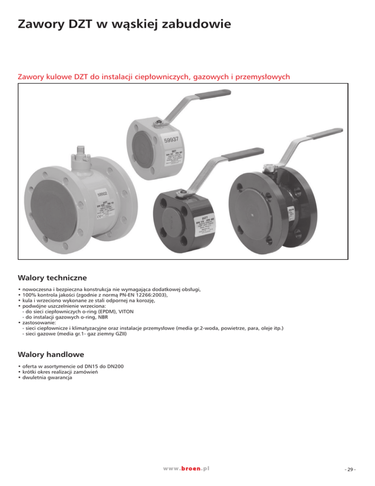Zawory DZT w wąskiej zabudowie Zawory kulowe DZT do instalacji ciepłowniczych, gazowych i przemysłowych Walory techniczne • • • • nowoczesna i bezpieczna konstrukcja nie wymagająca dodatkowej obsługi, 100% kontrola jakości (zgodnie z normą PN-EN 12266:2003), kula i wrzeciono wykonane ze stali odpornej na korozję, podwójne uszczelnienie wrzeciona: - do sieci ciepłowniczych o-ring (EPDM), VITON - do instalacji gazowych o-ring, NBR • zastosowanie: - sieci ciepłownicze i klimatyzacyjne oraz instalacje przemysłowe (media gr.2-woda, powietrze, para, oleje itp.) - sieci gazowe (media gr.1- gaz ziemny GZII) Walory handlowe • oferta w asortymencie od DN15 do DN200 • krótki okres realizacji zamówień • dwuletnia gwarancja tel. 074 832 54 00, fax 074 832 19 20, e-mail: [email protected] ww w.b r oen.p l - 29 - Zawory DZT przeznaczone do sieci ciepłowniczych Śruba wg 7380 Stal węglowa Podkładka wg 7380 Stal węglowa Uchwyt Stal konstrukcyjna węglowa 1.0254 wg PN-EN 10027-2 Pierścień osadczy wg DIN 471 Szyjka zaworu Stal konstrukcyjna S355J2C wg PN-EN 100025-2 Uchwyt Stal konstrukcyjna węglowa 1.0254 wg PN-EN 10027-2 Pierścień pośredni Stal kwasoodporna 1.4305 wg PN-EN 10027-2 Podkładka dystansowa Stal węglowa S235J2C wg PN-EN 10027-1 Wrzeciono Stal odporna na korozję 1.4305 wg PN-EN 10027-2 Pierścień dystansowy PTFE + 20%C Kołek Stal odporna na korozję 1.1573 wg PN-EN 10027-2 Pierścień dystansowy PTFE + 20%C Pierścień uszczelniający O-ring EPDM Pierścień uszczelniający O-ring EPDM Pierścień uszczelniający O-ring FKM (Viton) Kula zamykająca Stal odporna na korozję X6CrNi18-10 wg PN-EN 10222-5 Pierścień uszczelniający PTFE + 20%C Sprężyna talerzowa Stal sprężynowa 1.1248 wg PN-EN 10027-2 Wrzeciono Stal odporna na korozję 1.4305 wg PN-EN 10027-2 Pierścień uszczelniający O-ring FKM (Viton) Pierścień ślizgowy PTFE + 20%C Kołnierz zaworu Stal konstrukcyjna S235JRG2 wg PN-EN 100025-2 Korpus zaworu Stal konstrukcyjna P235GH wg PN-EN 100217-2 Pierścień oporowy Stal odporna na korozję X6CrNi18-10 wg PN-EN 10222-5 Pierścień oporowy Stal odporna na korozję 1.4305 wg PN-EN 10027-2 Kula zamykająca Stal odporna na korozję X6CrNi18-10 wg PN-EN 10222-5 Uszczelka kuli PTFE + 20%C Uszczelka kuli PTFE + 20%C Sprężyna talerzowa Stal sprężynowa 1.1248 wg PN-EN 10027-2 Pierścień uszczelniający O-ring EPDM Korpus zaworu Stal konstrukcyjna S355J2C wg PN-EN 100025-2 Pierścień oporowy Stal odporna na korozję X6CrNi18-10 wg PN-EN 10222-5 Wkrętka zaworu Stal konstrukcyjna S355J2C wg PN-EN 100025-2 Uszczelka kuli PTFE + 20%C Diagram P-V strata ciśnienia w zależności od natężenia przepływu czynnika i średnicy zaworu 100 [kPa] ΔP 89 67 5 4 3 2 Współczynniki przepływu - Kv i współczynnik oporu miejscowego dla zaworów pełnoprzeplotowych DN [mm] 15 20 25 32 40 50 Kv [m3/h] 0,079 0,078 0,094 0,078 0,115 0,115 32 57 81 133 229 295 DN [mm] 65 80 100 125 150 200 Kv [m3/h] 0,115 0,115 0,115 0,115 0,115 0,078 498 754 1179 1841 2652 5724 ΔP [bar] 2 100 89 67 5 4 3 2 0.1 98 76 5 4 3 1 89 67 5 4 3 2 0.01 98 76 5 4 3 2 0,1 89 67 5 4 3 2 0.001 9 78 6 5 4 3 2 2 0.01 0.001 2 3 4 6 8 [m/h] 3 2 3 4 68 2 3 4 68 2 3 4 68 2 3 4 68 V 5 79 5 79 5 79 5 79 5 79 0.1 1 10 10 000 100 1000 Wykresy zależności maksymalnego dopuszczalnego ciśnienia od temperatury Diagram “PN - TS” Zawory kołnierzowe, kołnierze wg EN 1092-1, mat. “1E1” Diagram “PN - TS” Zawory do wspawania i wkręcania PN [MPa] PN [MPa] 4.0 4.0 3.2 “PN40” 2.5 2.5 2.5 2.0 “PN25” 1.6 1.6 1.6 1.25 1.0 “PN16” 0.0 -10 TS 0 50 100 150 200 tel.- 074 832 54 00, fax 074 832 19 20, e-mail: [email protected] - 30 [0C] 1.0 98 76 5 4 3 0.0 -20 ww w.b r oen .p l TS 0 50 100 150 200 [0C] Zawory DZT przeznaczone do instalacji gazowych Śruba wg 7380 Stal węglowa Podkładka wg 7380 Stal węglowa Uchwyt Stal konstrukcyjna węglowa 1.0254 wg PN-EN 10027-2 Pierścień osadczy wg DIN 471 Szyjka zaworu Stal konstrukcyjna S355J2C wg PN-EN 100025-2 Uchwyt Stal konstrukcyjna węglowa 1.0254 wg PN-EN 10027-2 Pierścień pośredni Stal kwasoodporna 1.4305 wg PN-EN 10027-2 Podkładka dystansowa Stal węglowa S235J2C wg PN-EN 10027-1 Wrzeciono Stal odporna na korozję 1.4305 wg PN-EN 10027-2 Pierścień dystansowy PTFE + 20%C Kołek Stal odporna na korozję 1.1573 wg PN-EN 10027-2 Pierścień dystansowy PTFE + 20%C Wrzeciono Stal odporna na korozję 1.4305 wg PN-EN 10027-2 Pierścień uszczelniający O-ring NBR Pierścień uszczelniający O-ring NBR Kula zamykająca Stal odporna na korozję X6CrNi18-10 wg PN-EN 10222-5 Pierścień uszczelniający PTFE + 20%C Sprężyna talerzowa Stal sprężynowa 1.1248 wg PN-EN 10027-2 Pierścień oporowy Stal odporna na korozję 1.4305 wg PN-EN 10027-2 Pierścień uszczelniający O-ring NBR Pierścień ślizgowy PTFE + 20%C Kołnierz zaworu Stal konstrukcyjna S235JRG2 wg PN-EN 100025-2 Korpus zaworu Stal konstrukcyjna P235GH wg PN-EN 100217-2 Kula zamykająca Stal odporna na korozję X6CrNi18-10 wg PN-EN 10222-5 Pierścień oporowy Stal odporna na korozję X6CrNi18-10 wg PN-EN 10222-5 Uszczelka kuli PTFE + 20%C Uszczelka kuli PTFE + 20%C Sprężyna talerzowa Stal sprężynowa 1.1248 wg PN-EN 10027-2 Pierścień uszczelniający O-ring NBR Pierścień uszczelniający O-ring NBR Korpus zaworu Stal konstrukcyjna S355J2C wg PN-EN 100025-2 Pierścień oporowy Stal odporna na korozję X6CrNi18-10 wg PN-EN 10222-5 Wkrętka zaworu Stal konstrukcyjna S355J2C wg PN-EN 100025-2 Uszczelka kuli PTFE + 20%C Pierścień uszczelniający O-ring NBR Diagram P-V strata ciśnienia w zależności od natężenia przepływu czynnika i średnicy zaworu 100 [kPa] ΔP 89 67 5 4 3 2 Współczynniki przepływu - Kv i współczynnik oporu miejscowego DN [mm] 15 20 25 32 40 50 Kv [m3/h] 32 57 81 133 229 295 0,079 0,078 0,094 0,078 0,115 0,115 DN [mm] 65 80 100 125 150 200 Kv [m3/h] 498 754 1179 1841 2652 5724 0,115 0,115 0,115 0,115 0,115 0,078 ΔP [bar] 1.0 98 76 5 4 3 2 100 89 67
