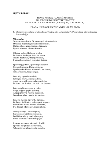 JĘZYK POLSKI: PRACĘ PROSZĘ NAPISAĆ RĘCZNIE NA JEDEN Z PONIŻSZYCH TEMATÓW NA PAPIERZE PODANIOWYM (W LINIĘ BĄDŹ W KRATKĘ). PRACA NIE MOŻE LICZYĆ MNIEJ NIŻ 250 SŁÓW 1. Zinterpretuj podany utwór Juliana Tuwima pt.: ,,Mieszkańcy”. Postaw tezę interpretacyjną i uzasadnij ją. Mieszkańcy Straszne mieszkania. W strasznych mieszkaniach Strasznie mieszkają straszni mieszczanie. Pleśnią i kopciem pełznie po ścianach Zgroza zimowa, ciemne konanie. Od rana bełkot. Bełkocą, bredzą, Że deszcz, że drogo, że to, że tamto. Trochę pochodzą, trochę posiedzą, I wszystko widmo. I wszystko fantom. Sprawdzą godzinę, sprawdzą kieszenie, Krawacik musną, klapy obciągną I godnym krokiem z mieszkań - na ziemię, Taką wiadomą, taką okrągłą. I oto idą, zapięci szczelnie, Patrzą na prawo, patrzą na lewo. A patrząc - widzą wszystko oddzielnie Że dom... że Stasiek... że koń... że drzewo... Jak ciasto biorą gazety w palce I żują, żują na papkę pulchną, Aż papierowym wzdęte zakalcem, Wypchane głowy grubo im puchną. I znowu mówią, że Ford... że kino... Że Bóg... że Rosja... radio, sport, wojna... Warstwami rośnie brednia potworna, I w dżungli zdarzeń widmami płyną. Głowę rozdętą i coraz cięższą Ku wieczorowi ślepo zwieszają. Pod łóżka włażą, złodzieja węszą, Łbem o nocniki chłodne trącając. I znowu sprawdzą kieszonki, kwitki, Spodnie na tyłkach zacerowane, Własność wielebną, święte nabytki, Swoje, wyłączne, zapracowane. Potem się modlą: "od nagłej śmierci... ...od wojny... głodu... odpoczywanie" I zasypiają z mordą na piersi W strasznych mieszkaniach straszni mieszczanie. 2. W jaki sposób w tekstach kultury jest ukazane piekło wojny. Opisz problem na podstawie interpretacji obrazu Pablo Picasso Guernica (1937) oraz wybranego utworu literackiego.