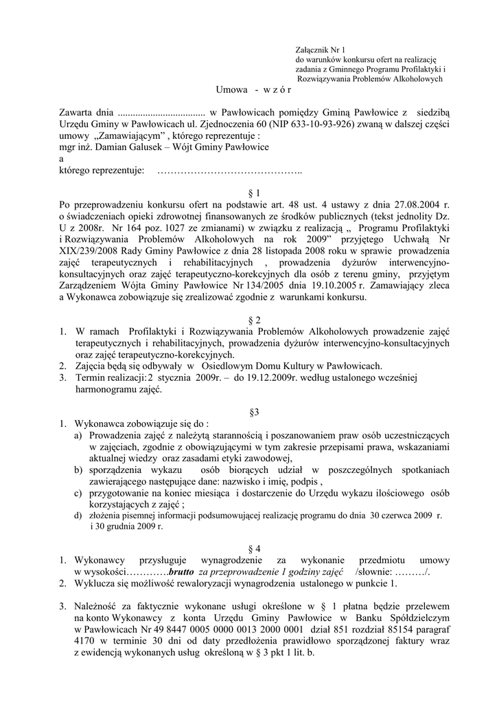 Załącznik Nr 1 do warunków konkursu ofert na realizację zadania z Gminnego Programu Profilaktyki i Rozwiązywania Problemów Alkoholowych Umowa - w z ó r Zawarta dnia ................................... w Pawłowicach pomiędzy Gminą Pawłowice z siedzibą Urzędu Gminy w Pawłowicach ul. Zjednoczenia 60 (NIP 633-10-93-926) zwaną w dalszej części umowy „Zamawiającym” , którego reprezentuje : mgr inŜ. Damian Galusek – Wójt Gminy Pawłowice a którego reprezentuje: …………………………………….. §1 Po przeprowadzeniu konkursu ofert na podstawie art. 48 ust. 4 ustawy z dnia 27.08.2004 r. o świadczeniach opieki zdrowotnej finansowanych ze środków publicznych (tekst jednolity Dz. U z 2008r. Nr 164 poz. 1027 ze zmianami) w związku z realizacją „ Programu Profilaktyki i Rozwiązywania Problemów Alkoholowych na rok 2009” przyjętego Uchwałą Nr XIX/239/2008 Rady Gminy Pawłowice z dnia 28 listopada 2008 roku w sprawie prowadzenia zajęć terapeutycznych i rehabilitacyjnych , prowadzenia dyŜurów interwencyjnokonsultacyjnych oraz zajęć terapeutyczno-korekcyjnych dla osób z terenu gminy, przyjętym Zarządzeniem Wójta Gminy Pawłowice Nr 134/2005 dnia 19.10.2005 r. Zamawiający zleca a Wykonawca zobowiązuje się zrealizować zgodnie z warunkami konkursu. §2 1. W ramach Profilaktyki i Rozwiązywania Problemów Alkoholowych prowadzenie zajęć terapeutycznych i rehabilitacyjnych, prowadzenia dyŜurów interwencyjno-konsultacyjnych oraz zajęć terapeutyczno-korekcyjnych. 2. Zajęcia będą się odbywały w Osiedlowym Domu Kultury w Pawłowicach. 3. Termin realizacji: 2 stycznia 2009r. – do 19.12.2009r. według ustalonego wcześniej harmonogramu zajęć. §3 1. Wykonawca zobowiązuje się do : a) Prowadzenia zajęć z naleŜytą starannością i poszanowaniem praw osób uczestniczących w zajęciach, zgodnie z obowiązującymi w tym zakresie przepisami prawa, wskazaniami aktualnej wiedzy oraz zasadami etyki zawodowej, osób biorących udział w poszczególnych spotkaniach b) sporządzenia wykazu zawierającego następujące dane: nazwisko i imię, podpis , c) przygotowanie na koniec miesiąca i dostarczenie do Urzędu wykazu ilościowego osób korzystających z zajęć ; d) złoŜenia pisemnej informacji podsumowującej realizację programu do dnia 30 czerwca 2009 r. i 30 grudnia 2009 r. §4 1. Wykonawcy przysługuje wynagrodzenie za wykonanie przedmiotu umowy w wysokości………….brutto za przeprowadzenie 1 godziny zajęć /słownie: ………/. 2. Wyklucza się moŜliwość rewaloryzacji wynagrodzenia ustalonego w punkcie 1. 3. NaleŜność za faktycznie wykonane usługi określone w § 1 płatna będzie przelewem na konto Wykonawcy z konta Urzędu Gminy Pawłowice w Banku Spółdzielczym w Pawłowicach Nr 49 8447 0005 0000 0013 2000 0001 dział 851 rozdział 85154 paragraf 4170 w terminie 30 dni od daty przedłoŜenia prawidłowo sporządzonej faktury wraz z ewidencją wykonanych usług określoną w § 3 pkt 1 lit. b. 4. Fakturę naleŜy wystawić na adres: Urząd Gminy Pawłowice ul. Zjednoczenia 60 43-250 Pawłowice 5. Urząd Gminy Pawłowice jest podatnikiem podatku VAT; NIP 633-10-93-926; REGON 000542764 §5 Wykonawca: a) wobec Zamawiającego ponosi całkowitą odpowiedzialność umowy, za realizację przedmiotu §6 1. Zamawiający moŜe odstąpić od umowy jeŜeli : a) zostanie ogłoszona upadłość Wykonawcy lub rozwiązanie jego zakładu, b) wykonawca nie realizuje usług zgodnie z umową lub wykonuje je nienaleŜycie, c) w razie zaistnienia istotnej zmiany okoliczności powodującej, Ŝe wykonanie umowy nie leŜy w interesie publicznym, czego nie moŜna było przewidzieć w chwili zawarcia umowy. §7 1. Osobą odpowiedzialną ze strony Zamawiającego za realizację niniejszej umowy jest Jadwiga Pękal 2. Osobą odpowiedzialną ze strony Wykonawcy za realizację niniejszej umowy jest …………. § 8 1. Wykonawca nie moŜe powierzyć wykonawstwa innej osobie, chyba Ŝe Zamawiający wyrazi na to zgodę na piśmie. 2. Wykonawca nie moŜe dokonać cesji bez zgody Zamawiającego. §9 1. Zamawiający zastrzega sobie prawo naliczenia kary umownej w wysokości 5% wartości niniejszej umowy, w razie nienaleŜytego wykonania programu, w szczególności naruszenia postanowień umowy i warunków określonych w konkursie. 2. Zamawiający ma prawo dochodzenia odszkodowania przewyŜszającego karę umowną. . § 10 1. W sprawach nie uregulowanych niniejszą umową mają zastosowanie przepisy kodeksu cywilnego. 2. Wszelkie zmiany do niniejszej umowy wymagają formy pisemnej pod rygorem niewaŜności. 3. W sprawach spornych niniejszej umowy rozstrzyga Sąd Powszechny właściwy ze względu na siedzibę Zamawiającego. 4. Umowę niniejszą sporządzono w dwóch jednobrzmiących egzemplarzach, w tym jeden dla Zamawiającego i jeden dla Wykonawcy. Zamawiający: Wykonawca