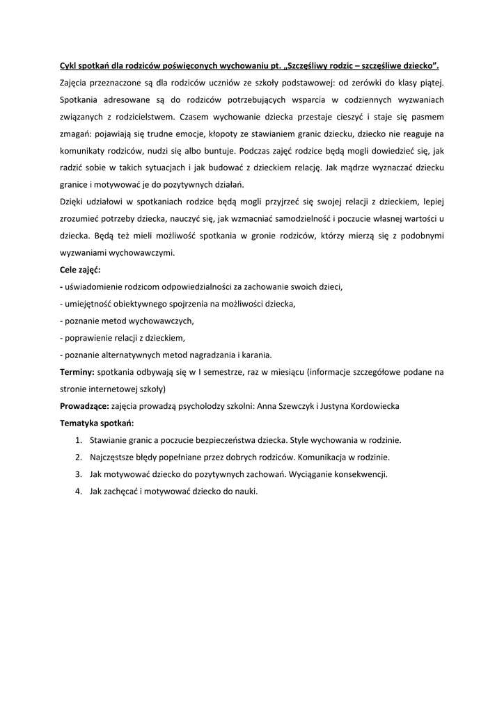 Cykl spotkań dla rodziców poświęconych wychowaniu pt. „Szczęśliwy rodzic – szczęśliwe dziecko”. Zajęcia przeznaczone są dla rodziców uczniów ze szkoły podstawowej: od zerówki do klasy piątej. Spotkania adresowane są do rodziców potrzebujących wsparcia w codziennych wyzwaniach związanych z rodzicielstwem. Czasem wychowanie dziecka przestaje cieszyć i staje się pasmem zmagań: pojawiają się trudne emocje, kłopoty ze stawianiem granic dziecku, dziecko nie reaguje na komunikaty rodziców, nudzi się albo buntuje. Podczas zajęć rodzice będą mogli dowiedzieć się, jak radzić sobie w takich sytuacjach i jak budować z dzieckiem relację. Jak mądrze wyznaczać dziecku granice i motywować je do pozytywnych działań. Dzięki udziałowi w spotkaniach rodzice będą mogli przyjrzeć się swojej relacji z dzieckiem, lepiej zrozumieć potrzeby dziecka, nauczyć się, jak wzmacniać samodzielność i poczucie własnej wartości u dziecka. Będą też mieli możliwość spotkania w gronie rodziców, którzy mierzą się z podobnymi wyzwaniami wychowawczymi. Cele zajęć: - uświadomienie rodzicom odpowiedzialności za zachowanie swoich dzieci, - umiejętność obiektywnego spojrzenia na możliwości dziecka, - poznanie metod wychowawczych, - poprawienie relacji z dzieckiem, - poznanie alternatywnych metod nagradzania i karania. Terminy: spotkania odbywają się w I semestrze, raz w miesiącu (informacje szczegółowe podane na stronie internetowej szkoły) Prowadzące: zajęcia prowadzą psycholodzy szkolni: Anna Szewczyk i Justyna Kordowiecka Tematyka spotkań: 1. Stawianie granic a poczucie bezpieczeństwa dziecka. Style wychowania w rodzinie. 2. Najczęstsze błędy popełniane przez dobrych rodziców. Komunikacja w rodzinie. 3. Jak motywować dziecko do pozytywnych zachowań. Wyciąganie konsekwencji. 4. Jak zachęcać i motywować dziecko do nauki.
