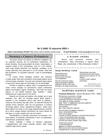 Nr 2 (449)/1 PO GÓRACH, DOLINACH... 12 stycznia 2003 r. Nr 2 (449) 12 stycznia 2003 r. Adres internetowy Parafii: http://www.ustron.bielsko.opoka.org.pl E-mail Redakcji: [email protected] NIEDZIELA CHRZTU PAŃSKIEGO z kromki chleba Są ludzie, którym nie zaleŜy na własnym wyglądzie, ani na czystości ubrania, ani na schludnym mieszkaniu. Po prostu brudasy. Są przyzwyczajeni do brudu, nieporządku, a czasem nawet w tym rozmiłowani. Jest im z tym dobrze. Jeśli mają okazję otrzymać coś ładnego, czystego, to za chwilę zabrudzą, aby pasowało to do ich świata. Jeśli ktoś jest brudasem, to wszystko zabrudzi. I jest to przeraŜająca prawda. W czasie chrztu świętego dziecko jest ubierane w białą szatę, która jest symbolem duchowego piękna serca ochrzczonego człowieka. Czy jest sens dawania tego piękna w ręce ludzi, którzy tego nie rozumieją, ani nie doceniają? Chrzest to wejście w piękny świat, a przygotowanie do chrztu winno polegać na opanowaniu sztuki umiłowania piękna duchowego, piękna moralnego. Jeśli ktoś nie kocha piękna, to nie potrafi dostrzec jego wartości i wtedy oddawanie go w jego ręce nie ma sensu. Dziecko po chrzcie jest piękne, ale dostaje się w ręce rodziców. Oni, albo mu pomogą odkryć BoŜe piękno i zawarte w nim szczęście serca, albo sami je splamią i zniszczą. Nie dziwmy się więc temu, Ŝe obecnie Kościół nie udziela chrztu dzieciom, jeśli nie ma gwarancji, iŜ rodzice doceniają piękno duszy wypełnionej Bogiem. JeŜeli sami tego piękna nie cenią, to nie mogą zagwarantować ocalenia go w sercu swego dziecka. Brudnemu nie wolno dawać do rąk tego, co czyste, dopóki sam się nie oczyści. Chrześcijanin to człowiek wyczulony na duchowe i moralne piękno, to człowiek rozmiłowany w tym, co szlachetne, wartościowe, prawdziwe i dobre. Wiara, nadzieja i miłość to wartości najwyŜsze i najpiękniejsze, jaki moŜe człowiek zdobyć, jakie mogą wypełnić jego serce i duszę. Słowo jest wyrazem miłości, jest “czerpakiem”, który zanurzamy w ogrom Istoty Boga, aby zaczerpnąć z Niej okruszynę miłości i ks. Wiesław w yprzedzaj czas Wyprzedzaj czas swój nieustannie tworząc plany zamiary i inne załoŜenia Gdy tak utworzysz swoją wizję przyszłego działania zastanów się ile w tym było dobrego a ile złego planowania Wyprzedzaj czas swój nieustannie aby tylko dobre plany tworzyć nikomu nic nie zabrać a dobro swoje i ogólne pomnoŜyć. “Z potrzeby serca” zbiorek poezji religijnej modlitw y wielkich ludzi Fryderyk Nietzsche - filozof niemiecki (1744 - 1900) Raz jeszcze wyruszam w drogę i w dal spoglądam moim okiem, wznosząc samotnie moje ręce ku Tobie, choć stale do Ciebie uciekam, gdyŜ Tobie, w najgłębszej mej serca głębinie, ołtarze poświęcone stoją, bym zawsze głos Twój mógł tam usłyszeć. Na nich błyszczy głęboko zapisane słowo: Nieznanemu Bogu. Przy nich ja jestem, chociaŜ aŜ dotąd zostałem w bluźnierczej druŜynie i coraz mocniej pętla owija mą szyję. I gdybym nawet uciekł na kraj świata, zmuszę się szybko słuŜbie Jego oddać. Ciebie chcę poznać, o mój Nieznajomy, głęboko w mojej duszy tkwiący. Który przez Ŝycie me jak burza kroczysz, Nieogarnionyś, a dla mnie tak bliski! Nr 2 (449)/2 12 stycznia 2003 r. PO GÓRACH, DOLINACH... Z śYCIA RODZINY PARAFIALNEJ W OKRESIE 01. 10. 2002r. - 31. 12. 2002r. CHRZTY - Mackiewicz Ewa; - Boruta Patrycja; - Boruta Bartłomiej; - Sikora Paulina; - Wałga Nikola; - Tessarczik Justyna; - Brychcy Krzysztof; - Haratyk Dawid; - Rzyman Patrycja; - Kłoda Filip; ŚLUBY - Sutor Bartosz; - Kamiński Jakub; - Śliwka Dominik; - Franek Dawid; - Gluza Maciej; - Labak Amelia; - Wojciechowska Magdalena; - Gluza Damian; - Mach ElŜbieta; PO G R ZE BY - KsiąŜek Piotr i Skłodowska Beata; - Dorabiała Janina; - Samsonowicz Zofia; - Górniok Grzegorz i Franek Anna; - Zięba Jan; - Pinkas Bronisława; - Werpachowski Mateusz i Brenner Agnieszka; - Stępowski Leon; - Marszałek Emil; - Orawski Dariusz i Jeronim Mirosława; - Jakóbczak Jan; - Kurowska Maria; - Mynarz Benedykt i Głowinkowska Agata; - Rozmus Zofia; - Łukasik Jan; - Materek Mirosław i Opala Ewa; - Małecka Janina; - Bigaj Maria; - Serwotka Paweł i Kosik Joanna; - Demel Walter; - Brzóska Tadeusz; - Swoboda Ferdinand i Hassa Stefania; Jeevodaya - ośrodek rehabilitacji trędowatych w Indiach kolejna informacja Na wstępie przytoczę słowa skierowane z Ośrodka do przyjaciół Jeevodaya z okazji świąt BoŜego Narodzenia. “Święta BoŜego Narodzenia to czas uświadomienia sobie, Ŝe Bóg jest wśród nas. Przyszedł w postaci Dziecięcia narodzonego w ubóstwie i opuszczeniu, z dala od domu rodzinnego, aby od początku ukazać bezwzględną wartość człowieczeństwa. - Gdziekolwiek i w jakiejkolwiek sytuacji znajdują się ludzie, są umiłowanymi Dziećmi BoŜymi. KaŜdego i w kaŜdym miejscu kocha Bóg. Kochajmy całym sercem kaŜdego człowieka, bo jest naszym bratem. My na Waszą miłość czekamy z Jeevodaya i tu teŜ uczymy się kochać wszystkich. Was ogarniamy szczególnie naszymi sercami i modlitwą. Podnieś rękę, BoŜe Dziecię, błogosław...” Wiadomości z ostatniego okresu wraz ze zdjęciami są bardzo piękne i radosne, poniewaŜ Ośrodek stale się rozwija, i nie tylko jako miejsce udzielonej pomocy medycznej, ale równieŜ jako ośrodek szkolenia przygotowującego młodych do zawodu. Poza tym w ostatnim roku powiększyło się takŜe grono katolików o czetery dorosłe osoby, które poprosiły o chrzest, a dwoje przyjęło sakrament małŜeństwa. Rząd tamtejszego stanu zainteresował się sytuacją Ośrodka i stara sie pomóc w uzyskaniu ziemi obok szpitala na budowę nowej szkoły Stara juŜ nie mieści dzieci, których wciąŜ przybywa - jest ich 383. WaŜnym wydarzeniem jest rozpoczęcie nauki w szkole pielęgniarskiej przez jedną z maturzystek. Druga przygotowuje się na studia medyczne. Wydarzenia wielkie, poniewaŜ zdoby