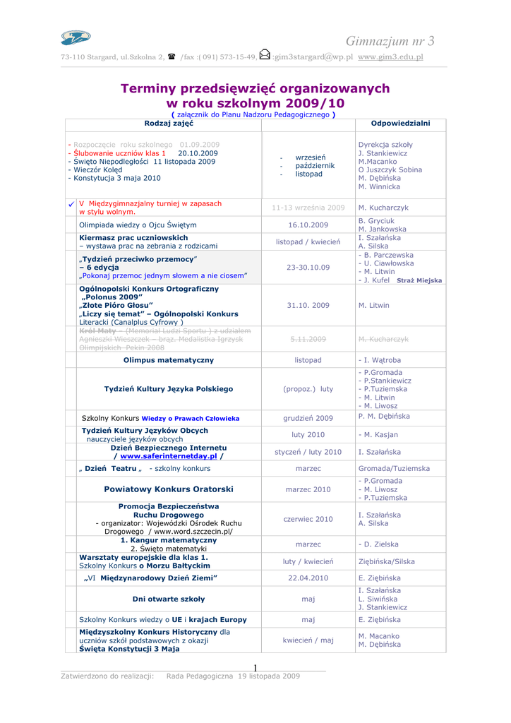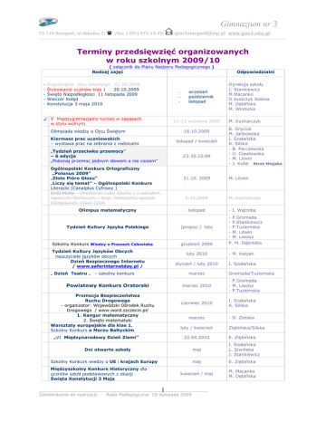 Gimnazjum nr 3 73-110 Stargard, ul.Szkolna 2, /fax :( 091) 573-15-49, :[email protected] www.gim3.edu.pl Terminy przedsięwzięć organizowanych w roku szkolnym 2009/10 ( załącznik do Planu Nadzoru Pedagogicznego ) Rodzaj zajęć - Rozpoczęcie roku szkolnego 01.09.2009 Ślubowanie uczniów klas 1 20.10.2009 Święto Niepodległości 11 listopada 2009 Wieczór Kolęd Konstytucja 3 maja 2010 V Międzygimnazjalny turniej w zapasach w stylu wolnym. Olimpiada wiedzy o Ojcu Świętym Kiermasz prac uczniowskich – wystawa prac na zebrania z rodzicami „Tydzień przeciwko przemocy” – 6 edycja „Pokonaj przemoc jednym słowem a nie ciosem” Ogólnopolski Konkurs Ortograficzny „Polonus 2009” „Złote Pióro Głosu” „Liczy się temat” – Ogólnopolski Konkurs Literacki (Canalplus Cyfrowy ) Król Maty – (Memoriał Ludzi Sportu ) z udziałem Agnieszki Wieszczek – brąz. Medalistka Igrzysk Olimpijskich Pekin 2008 Olimpus matematyczny Tydzień Kultury Języka Polskiego Szkolny Konkurs Wiedzy o Prawach Człowieka Tydzień Kultury Języków Obcych nauczyciele języków obcych Dzień Bezpiecznego Internetu / www.saferinternetday.pl / „ Dzień Teatru „ - szkolny konkurs Powiatowy Konkurs Oratorski Promocja Bezpieczeństwa Ruchu Drogowego - organizator: Wojewódzki Ośrodek Ruchu Drogowego / www.word.szczecin.pl/ 1. Kangur matematyczny 2. Święto matematyki Warsztaty europejskie dla klas 1. Szkolny Konkurs o Morzu Bałtyckim „VI Międzynarodowy Dzień Ziemi” - wrzesień październik listopad 11-13 września 2009 16.10.2009 listopad / kwiecień 23-30.10.09 31.10. 2009 5.11.2009 listopad (propoz.) luty grudzień 2009 M. Kucharczyk B. Gryciuk M. Jankowska I. Szałańska A. Silska - B. Parczewska - U. Ciawłowska - M. Litwin - J. Kufel StraŜ Miejska M. Litwin M. Kucharczyk - I. Wątroba - P.Gromada - P.Stankiewicz - P.Tuziemska - M. Litwin - M. Liwosz P. M. Dębińska - M. Kasjan styczeń / luty 2010 I. Szałańska marzec marzec 2010 Gromada/Tuziemska - P.Gromada - M. Liwosz - P.Tuziemska czerwiec 2010 I. Szałańska A. Silska marzec - D. Zielska luty / kwiecień 22.04.2010 Ziębińska/Silska E. Ziębińska maj I. Szałańska L. Siwińska J. Stankiewicz maj E. Ziębińska kwiecień / maj M. Macanko M. Dębińska Szkolny Konkurs wiedzy o UE i krajach Europy ______________________________________________________ 1 Zatwierdzono do realizacji: Dyrekcja szkoły J. Stankiewicz M.Macanko O Juszczyk Sobina M. Dębińska M. Winnicka luty 2010 Dni otwarte szkoły Międzyszkolny Konkurs Historyczny dla uczniów szkół podstawowych z okazji Święta Konstytucji 3 Maja Odpowiedzialni Rada Pedagogiczna 19 listopada 2009 Gimnazjum nr 3 73-110 Stargard, ul.Szkolna 2, /fax :( 091) 573-15-49, :[email protected] www.gim3.edu.pl Powiatowy Festiwal - 7 edycja „Festiwal Piosenki Gimnazjalnej” maj I.Aładowicz Wicedyrektor 1) 2) 3) 4) „Dzień Edukacji Prozdrowotnej” Zdrowe OdŜywianie Światowy Dzień walki z AIDS STOP uŜywkom Festyn środowiskowy „Trzymaj formę” -Apele na zakończenie roku szkolnego 16-20.11.2009 01.12.2009 22-26.02.2010 X / VI – 2009/10 M.Saków/A.Moroz Pasadyn/Moroz Szałańska / Wojniłko Kowalczyk / Gryciuk Kl.1 – Zb. Wojniłko Kl.2 – M. Kasjan Kl.3 – M. Winnicka czerwiec Konkursy szkolne: Język angielski – eliminacje do I L.O. październik M. Saków Język niemiecki – eliminacje do I L.O. październik D. Komarowska Konkurs geograficzny o tytuł „Mistrza mapy” marzec E. Ziębińska Światowy Dzień KsiąŜki – spotkanie autorskie kwiecień W. Jakubowska M. Lisowska NOBLIŚCI POLSCY – wieczornica listopad J. Stankiewicz Konkurs wiedzy o muzyce marzec I. Aładowicz Konkurs czytelniczy z okazji ”Dnia Bibliotekarza” „Talenty są wśród nas” / „ Nasze pasje „ czerwiec E. Tuziemska maj M. Macanko M. Dębińska Szkolny konkurs „Mistrz historii” Szkolny Konkurs Matematyczny Szkolny konkurs „Lekturomania” Wystawa „Tropem epok literackich” +konkurs Wystawa tematyczna „Autoportrety” W. Jakubowska M. Lisowska maj marzec D. Zielska maj (8.05) M. Litwin kwiecień 2010 marzec 2010 Szkolny konkurs plastyczny „Piękny Stargard” maj L. Siwińska Konkurs „Jan Paweł II” październik 2009 B. Gryciuk Szkolny Konkurs „Zdrowe odŜywianie” październik 2009 A. Moroz M. Pasadyn Z. Grzeszczuk Szkolny konkurs ekologiczny marzec 2010 E. Ziębińska Pierwsza pomoc przedmedyczna ”Konkurs o AIDS” listopad 2009 A. Moroz M. Pasadyn Z. Grzeszczuk Inne: VI. Szkolny Festyn Środowiskowy czerwiec 2010 Dyrektor / wicedyrektor Przewodniczący Rady Pedagogicznej ................................................................. ______________________________________________________ 2 Zatwierdzono do realizacji: Rada Pedagogiczna 19 listopada 2009