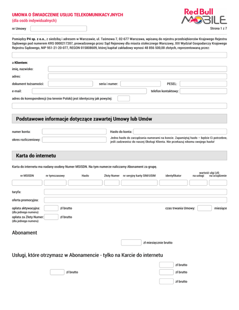 UMOWA O ŚWIADCZENIE USŁUG TELEKOMUNIKACYJNYCH (dla osób indywidualnych) Strona 1 z 7 nr Umowy Pomiędzy P4 sp. z o.o., z siedzibą i adresem w Warszawie, ul. Taśmowa 7, 02-677 Warszawa, wpisaną do rejestru przedsiębiorców Krajowego Rejestru Sądowego pod numerem KRS 0000217207, prowadzonego przez Sąd Rejonowy dla miasta stołecznego Warszawy, XIII Wydział Gospodarczy Krajowego Rejestru Sądowego, NIP 951-21-20-077, REGON 015808609, której kapitał zakładowy wynosi 48 856 500,00 złotych, reprezentowaną przez: a Klientem: imię, nazwisko: adres: dokument tożsamości: seria i numer: PESEL: e-mail: telefon kontaktowy: adres do korespondencji (na terenie Polski) jest identyczny jak powyżej: Podstawowe informacje dotyczące zawartej Umowy lub Umów numer konta: Hasło do konta: okres rozliczeniowy: Jedno hasło do zarządzania numerami na koncie. Zapamiętaj hasło – będzie Ci potrzebne, jeśli zadzwonisz do naszej Obsługi Klienta. Nie przekazuj nikomu swojego hasła! Karta do internetu Karta do internetu ma nadany osobny Numer MSISDN. Na tym numerze naliczamy Abonament za grupę. nr MSISDN nr tymczasowy Hasło Złoty Numer nr seryjny karty SIM/USIM identyfikator wartość ulgi (zł) na usługi na urządzenie taryfa: oferta promocyjna: opłata aktywacyjna: zł brutto opłata za Złoty Numer: zł brutto (dla jednego numeru) (dla jednego numeru) czas trwania Umowy: Abonament zł miesięcznie brutto Usługi, które otrzymasz w Abonamencie - tylko na Karcie do internetu zł brutto zł brutto zł brutto zł brutto miesiące UMOWA O ŚWIADCZENIE USŁUG TELEKOMUNIKACYJNYCH (dla osób indywidualnych) Strona 2 z 7 nr Umowy zł brutto zł brutto zł brutto zł brutto zł brutto Usługi, które są płatne dodatkowo - tylko na Karcie do internetu zł brutto zł brutto zł brutto zł brutto zł brutto zł brutto zł brutto zł brutto zł brutto Extra Usługi (treści cyfrowe) dostarczane przez Partnerów P4 płatne dodatkowo zł brutto zł brutto zł brutto zł brutto zł brutto zł brutto zł brutto zł brutto zł brutto Karty do telefonu Poniższe numery tworzą grupę. Jest ona przypisana do Karty do internetu o Numerze MSISDN: nr MSISDN nr tymczasowy Hasło Złoty Numer nr seryjny karty SIM/USIM identyfikator wartość ulgi (zł) na usługi na urządzenie taryfa: oferta promocyjna: opłata aktywacyjna: zł brutto opłata za Złoty Numer: zł brutto (dla jednego numeru) (dla jednego numeru) czas trwania Umowy: miesiące UMOWA O ŚWIADCZENIE USŁUG TELEKOMUNIKACYJNYCH (dla osób indywidualnych) Strona 3 z 7 nr Umowy Abonament zł miesięcznie brutto Usługi wspólne, dla wszystkich Kart do telefonu - gdy jest aktywna grupa zł brutto zł brutto zł brutto zł brutto zł brutto zł brutto zł brutto zł brutto zł brutto Usługi płatne dodatkowo na każdej wymienionej Karcie do telefonu zł brutto zł brutto zł brutto zł brutto zł brutto zł brutto zł brutto zł brutto zł brutto Extra Usługi (treści cyfrowe) dostarczane przez Partnerów P4 płatne dodatkowo zł brutto zł brutto zł brutto zł brutto zł brutto zł brutto zł brutto zł brutto zł brutto Szczegóły oferty nr MSISDN nr tymczasowy Hasło Złoty Numer nr seryjny karty SIM/USIM identyfikator wartość ulgi (zł) na usługi na urządzenie UMOWA O ŚWIADCZENIE USŁUG TELEKOMUNIKACYJNYCH (dla osób indywidualnych) Strona 4 z 7 nr Umowy taryfa: oferta promocyjna: opłata aktywacyjna: zł brutto opłata za Złoty Numer: zł brutto (dla jednego numeru) (dla jednego numeru) czas trwania Umowy: Abonament zł miesięcznie brutto Usługi dostępne w abonamencie zł brutto zł brutto zł brutto zł brutto zł brutto zł brutto zł brutto zł brutto zł brutto Usługi płatne dodatkowo - dla każdego Numeru MSISDN zł brutto zł brutto zł brutto zł brutto zł brutto zł brutto zł brutto zł brutto zł brutto Extra Usługi (treści cyfrowe) dostarczane przez Partnerów P4 płatne dodatkowo zł brutto zł brutto zł brutto zł brutto zł brutto zł brutto miesiące UMOWA O ŚWIADCZENIE USŁUG TELEKOMUNIKACYJNYCH (dla osób indywidualnych) Strona 5 z 7 nr Umowy zł brutto zł brutto zł brutto Postanowienia ogólne 1. 2. 3. 4. 5. 6. 7. Postanowienia dotyczące: jakości usług, zakresu obsługi serwisowej, sposobów dokonywania płatności, ograniczeń w zakresie korzystania z udostępnionych Abonentowi przez Operatora Telefonów, o ile takie zostały wprowadzone przez Operatora, połączeń z numerami alarmowymi, gromadzenia danych o lokalizacji Telefonu o ile takie dane są gromadzone, ograniczeń w dostępie lub korzystaniu z usług i aplikacji, procedur wprowadzonych przez Operatora w celu pomiaru i organizacji ruchu w Sieci Telekomunikacyjnej, aby zapobiec osiągnięciu lub przekroczeniu pojemności łącza, wraz z informacją o ich wpływie na jakość świadczonych Usług Telekomunikacyjnych, działań, jakie Operator jest uprawniony podejmować w związku z przypadkami naruszenia bezpieczeństwa lub integralności sieci i usług, sposobów informowania Abonenta o stanie pakietu na transmisję danych oraz o jego wyczerpaniu, zasad umieszczenia danych Abonenta w spisie abonentów, sposobów przekazywania Abonentowi informacji o zagrożeniach związanych ze świadczoną Usługą Telekomunikacyjną, w tym o sposobach ochrony bezpieczeństwa, prywatności i danych osobowych, zakresu odpowiedzialności z tytułu niewykonania lub nienależytego wykonania Umowy, wysokości i zasad wypłaty odszkodowania, zasad, trybu i terminów składania oraz rozpatrywania reklamacji określone są w Regulaminie świadczenia Usług Telekomunikacyjnych przez P4 sp. z o.o. Operator wypłaca odszkodowanie Abonentowi z tytułu niewykonania lub nienależytego wykonania Umowy w terminie 14 dni od dnia uznania przez P4 sp. z o.o. reklamacji dotyczącej niewykonania lub nienależytego wykonania Umowy. Cennik Usług Telekomunikacyjnych P4 sp. z o.o. jest dostępny w każdym Punkcie Sprzedaży P4 oraz na stronie internetowej Operatora. Informacja o k