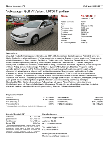 Numer zlecenia: 476 Wydruk z: 08.03.2017 Volkswagen Golf VI Variant 1.6TDI Trendline Cena: 10.880,00 Rodzaj nadwozia Kolor Moc Pojemność sko. Pierwsza rejestr. Przebieg Badanie techni. Paliwo Liczba drzwi Nutzlast Zul. Gesamtgewicht Kombi Biały 77 kW (105 KM) 1.598 ccm 05/2012 74.500 km 03/2019 Olej napędowy 5 610 kg 1.980 kg Udokum. p. VAT Wyposażenie Zugr.-lgd. Kraftstoff: Olej napędowy, Klimatyzacja, ESP, ABS, Immobilizer, Centralny zamek, Podnośnik szyby el., Radio, Poduszka powietrzna kierowcy, Poduszka powietrzna pasażera, Boczne poduszki powietrzne, Wspomaganie układu kierowniczego, Bordcomputer, Tagfahrlicht, Traktionskontrolle, Dachreling, Einparkhilfe vorn, Einparkhilfe hinten, Drobnocząsteczkowy filtr sadzy, Wspomaganie parkowania, Odtwarzacz CD, Lusterko zewnętrzne elektrycznie przestawiane, Gwarancja, Polsterfarbe: Czarny, Technik und Sicherheit Tagfahrlicht, Seitenairbag vorn mit Kopf-Airbag-Einheit, Seitenairbags, Anti-Blockier-System (ABS), Elektron. Stabilitäts-Programm (ESP), Antriebs-Schlupfregelung (ASR), Traktionskontrolle, Zentralverriegelung, Servolenkung elektronisch gesteuert (Servotronic), Wegfahrsperre (elektronisch), Multifunktionsanzeige / Bordcomputer, Multifunktions-Display, Fahrerairbag, Airbag Fahrer-/Beifahrerseite Multimedia Audiosystem RCD 210 mit MP3-Wiedergabefunktion (Radio/CD-Player 4 Lautsprecher), CD-Player Komfort Park-Distance-Control (vorn und hinten), Fensterheber elektrisch vorn + hinten, Außenspiegel elektrisch, Außenspiegel elektr. verstell- und heizbar, Wärmeschutzverglasung grün getönt Innenausstattung Rücksitz geteilt / klappbar Aussenausstattung Dachreling Sonstiges Dieselpartikel-Filter Weitere Informationen Außenspiegel mit autom. Absenkfunktion rechts, Vorrüstung Mobiltelefon/Handy mit Bluetooth-Schnittstelle, Klimaanlage Climatic, Sitz vorn links höhenverstellbar, Lenksäule (Lenkrad) mechan. verstellbar Höhen-/Längsverstellung, Elektron. Differentialsperre (EDS) Przykładowy kredyt* Zaliczka Nettokreditbetrag Soll-Zinssatz p.a. Stopa odsetkowa 2.720,00 EUR 8.160,00 EUR 2,95 % 2,99 % Soll-Zinssatzart Okres kredytowania Suma kredytu Gebunden 48 Miesięcy 8.661,12 EUR Rata miesięczna 180,44 EUR *Volkswagen Bank GmbH, Gifhorner Straße 57, 38112 Braunschweig Zużycie / Emisja CO2* w mieście poza miastem kombinowany Emisja CO2 Dane kontaktowe 5,7 L/100 km 3,9 L/100 km 4,5 L/100 km 119 g/km * Dodatkowe oficjalne informacje o zużyciu paliwa i emisji CO2 nowych samochodów osobowych można znaleźć w przewodniku zużycia paliwa i emisji CO2 nowych samochodów osobowych, dostępnym bezpłatnie we wszystkich punktach sprzedaży oraz w Deutschen Automobil Treuhand GmbH pod adresem www.dat.de Autohaus Hoppe GmbH Ahlhorner Str. 88 D-27793 Wildeshausen Tel. 04431 946013 Fax 04431 946010 [email protected] http://www.autohaus-hoppe.com Numer zlecenia: 476 Volkswagen Golf VI Variant 1.6TDI Trendline Wydruk z: 08.03.2017 Numer zlecenia: 476 Volkswagen Golf VI Variant 1.6TDI Trendline Wydruk z: 08.03.2017