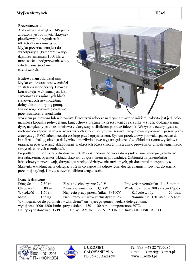 Myjka skrzynek T345 Przeznaczenie Automatyczna myjka T345 przeznaczona jest do mycia skrzynek plastikowych o wymiarach 60x40x22 cm i mniejszych. Myjka przeznaczona jest do współpracy z „karchrem” o wydajności minimum 1000 l/h, z możliwością podgrzewania wody i dodawania środków chemicznych. Budowa i zasada działania Myjka zbudowana jest w całości ze stali kwasoodpornej. Główna konstrukcja wykonana jest jako samonośna z zaginanych blach stanowiących równocześnie dolny zbiornik i rynnę górną. Niskie nogi pozwalają na łatwe przemieszczanie urządzenia wózkiem paletowym lub widłowym. Przestrzeń robocza nad rynną z przenośnikiem, nakryta jest jednoelementową kopułą z poliwęglanu. Łańcuchowy przenośnik przesuwający skrzynki w strefie oddziaływania dysz, napędzany jest bezstopniowo elektrycznym silnikiem poprzez falownik. Wszystkie cztery dysze są ruchome co zapewnia mycie ze wszystkich stron. Kurtyny wejściowa i wyjściowa wykonane z pasów przeźroczystego PVC zabezpieczają obsługę przed opryskaniem. System przelewowy pozwala spuszczać do kanalizacji frakcję ciekłą a duży właz umożliwia łatwe wygarnięcie osadów. Składana rynna wyjściowa ogranicza powierzchnię składowania w okresach bezczynności. Przesuwne prowadnice umożliwiają mycie skrzynek o innych rozmiarach. Po podłączeniu do sieci jednofazowej 240V i ciśnieniowego węża do wysokociśnieniowego „karchera” i ich załączeniu, operator wkłada skrzynki do góry dnem na prowadnice. Zabieraki na przenośniku łańcuchowym przesuwają skrzynkę w strefę oddziaływania ruchomych, płaskostrumieniowych dysz. Skrzynki wkładane są w odstępach 0,2 m co zapewnia odpowiedni dostęp strumieni również do ścianki przedniej i tylnej. Umyte skrzynki odbiera druga osoba. Dane techniczne Długość 2,50 m Zasilanie elektryczne 240 V Prędkość przenośnika 1 – 5 m/min Głębokość 1,00 m Zainstalowana moc 0,5 kW Wydajność 60 – 300 skrzynek/godz Wysokość 1,50 m Napięcie pracy przenośnika 3x400V Zużycie wody 4 – 20 l/szt Masa 185 kg Nap. Pracy silników ruchu dysz =12V Nominalnie: 180 szt/h 6,5 l/szt Wymagania co do parametrów „karchera” zasilającego gorącą wodą z detergentami: wydajność 1000-1200 l/min przy ciśnieniu 150 – 100 bar i temperaturze 60oC. Najlepiej zastosować HYPER T firmy LAVOR lub NEPTUNE 7 firmy NILFISK ALTO. ŁUKOMET CAŁOWANIE 91 A PL 05-480 Karczew Tel./Fax +48 22 7800086 e-mail: [email protected] www.lukomet.pl