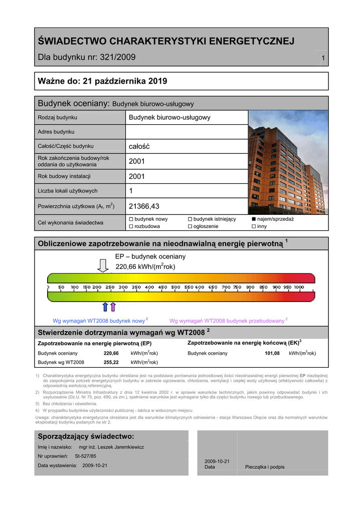 ŚWIADECTWO CHARAKTERYSTYKI ENERGETYCZNEJ Dla budynku nr: 321/2009 1 Ważne do: 21 października 2019 Budynek oceniany: Budynek biurowo-usługowy Budynek biurowo-usługowy Rodzaj budynku Adres budynku Całość/Część budynku całość Rok zakończenia budowy/rok oddania do użytkowania 2001 Rok budowy instalacji 2001 Liczba lokali użytkowych 1 Powierzchnia użytkowa (Af, m2) 21366,43 Cel wykonania świadectwa budynek nowy rozbudowa budynek istniejący ogłoszenie najem/sprzedaż inny Obliczeniowe zapotrzebowanie na nieodnawialną energię pierwotną 1 EP – budynek oceniany 220,66 kWh/(m2rok) Wg wymagań WT2008 budynek nowy 2 Wg wymagań WT2008 budynek przebudowany 2 Stwierdzenie dotrzymania wymagań wg WT2008 2 Zapotrzebowanie na energię pierwotną (EP) 2 Budynek oceniany 220,66 kWh/(m rok) Budynek wg WT2008 255,22 kWh/(m rok) Zapotrzebowanie na energię końcową (EK)3 Budynek oceniany 101,08 2 kWh/(m rok) 2 1) Charakterystyka energetyczna budynku określana jest na podstawie porównania jednostkowej ilości nieodnawialnej energii pierwotnej EP niezbędnej do zaspokojenia potrzeb energetycznych budynku w zakresie ogrzewania, chłodzenia, wentylacji i ciepłej wody użytkowej (efektywność całkowita) z odpowiednią wartością referencyjną. 2) Rozporządzenie Ministra Infrastruktury z dnia 12 kwietnia 2002 r. w sprawie warunków technicznych, jakim powinny odpowiadać budynki i ich usytuowanie (Dz.U. Nr 75, poz. 690, ze zm.), spełnienie warunków jest wymagane tylko dla części budynku nowego lub przebudowanego. 3) Bez chłodzenia i oświetlenia. 4) W przypadku budynków użyteczności publicznej - tablica w widocznym miejscu. Uwaga: charakterystyka energetyczna określana jest dla warunków klimatycznych odniesienia - stacja Warszawa Okęcie oraz dla normalnych warunków eksploatacji budynku podanych na str 2. Sporządzający świadectwo: Imię i nazwisko: Nr uprawnień: mgr inż. Leszek Jaremkiewicz St-527/85 Data wystawienia: 2009-10-21 2009-10-21 Data Pieczątka i podpis ŚWIADECTWO CHARAKTERYSTYKI ENERGETYCZNEJ Dla budynku nr: 321/2009 2 Charakterystyka techniczno-użytkowa budynku Przeznaczenie budynku Budynek biurowo-usługowy z garażem podziemnym Liczba kondygnacji 17 Powierzchnia użytkowa budynku 39928,80 [m2] Powierzchnia użytkowa 21366,43 [m2] o regulowanej temperaturze (Af) Normalne temperatury 20,00 [°C], 28,00 [°C] eksploatacyjne: zima, lato Podział powierzchni użytkowej: mieszkalna: 0,00 [m2], niemieszkalna: 21366,43 [m2] strefy, lokale Kubatura budynku: 85600,00 [m3] Wskaźnik zwartości budynku A/Ve 0,30 [1/m] Rodzaj konstrukcji budynku Konstrukcja żelbetowa, monolityczna, słupowo-płytowa Liczba użytkowników 1920 Osłona budynku: Średni współczynnik przenikania ciepła osłony budynku U = 0,770 [W/m2⋅K] opis, parametry termiczne Instalacja ogrzewania: Tak, Trzy kotły żeliwne De Dietrich typu: GTE524, GTE524, GT409, Grzejniki elektryczne 2 tak/nie, opis, parametry Instalacja wentylacji: Budynek z wentylacją mieszaną (wentylacja mechaniczna nawiewno-wywiewna, wentylacja mechaniczna wywiewna) tak/nie, opis, parametry Instalacja chłodzenia: Tak, w obiekcie znajdują się lokale/strefy wyposażone w instalację chłodniczą 2 tak/nie, opis, parametry Instalacja przygotowania ciepłej wody użytkowej: tak/nie, opis, parametry Instalacja oświetlenia wbudowanego: tak/nie, opis, parametry Tak, Trzy kotły żeliwne De Dietrich typu: GTE524, GTE524, GT409 2 Tak, Oprawy świetlówkowe różnego typu 2 Obliczeniowe zapotrzebowanie na energię Roczne jednostkowe zapotrzebowanie na energię końcową [kWh/(m2rok)] Ogrzewanie Ciepła woda Wentylacja mech. i nawilżanie Chłodzenie Oświetlenie wbudowane Suma Paliwo/źródło energii: Gaz ziemny 33,40 6,20 61,42 0,00 0,00 101,01 Energia elektryczna (układy pomocnicze) 0,14 0,04 0,30 6,35 0,00 6,83 Energia elektryczna: Produkcja mieszana * 0,04 0,00 0,02 1,92 27,70 29,68 Nośnik energii Podział zapotrzebowania na energię Roczne jednostkowe zapotrzebowanie na energię użytkową [kWh/(m2rok)] Ogrzewanie Ciepła woda Wentylacja mech. i nawilżanie Chłodzenie Oświetlenie wbudowane Suma Wartość [kWh/(m2rok)] 30,18 5,62 55,26 17,47 27,70 136,24 Udział [%] 22,15 4,13 40,56 12,82 20,33 100,00 2 Roczne jednostkowe zapotrzebowanie na energię końcową [kWh/(m rok)] Ogrzewanie Ciepła woda Wentylacja mech. i nawilżanie Chłodzenie Oświetlenie wbudowane Suma Wartość [kWh/(m2rok)] 33,58 6,24 61,74 8,27 27,70 137,53 Udział [%] 24,42 4,53 44,89 6,02 20,14 100,00 2 Roczne jednostkowe zapotrzebowanie na energię pierwotną [kWh/(m rok)] Ogrzewanie Ciepła woda Wentylacja mech. i nawilżanie Chłodzenie Oświetlenie wbudowane Suma Wartość [kWh/(m2rok)] 37,29 6,93 68,52 43,88 83,10 239,72 Udział [%] 15,56 2,89 28,58 18,30 34,66 100,00 Sumaryczne roczne jednostkowe zapotrzebowanie na nieodnawialną energię: pierwotną: 1 220,66 - łącznie z chłodzeniem pomieszczeń 2 - ciąg dalszy na stronie piątej kWh/(m2rok)]