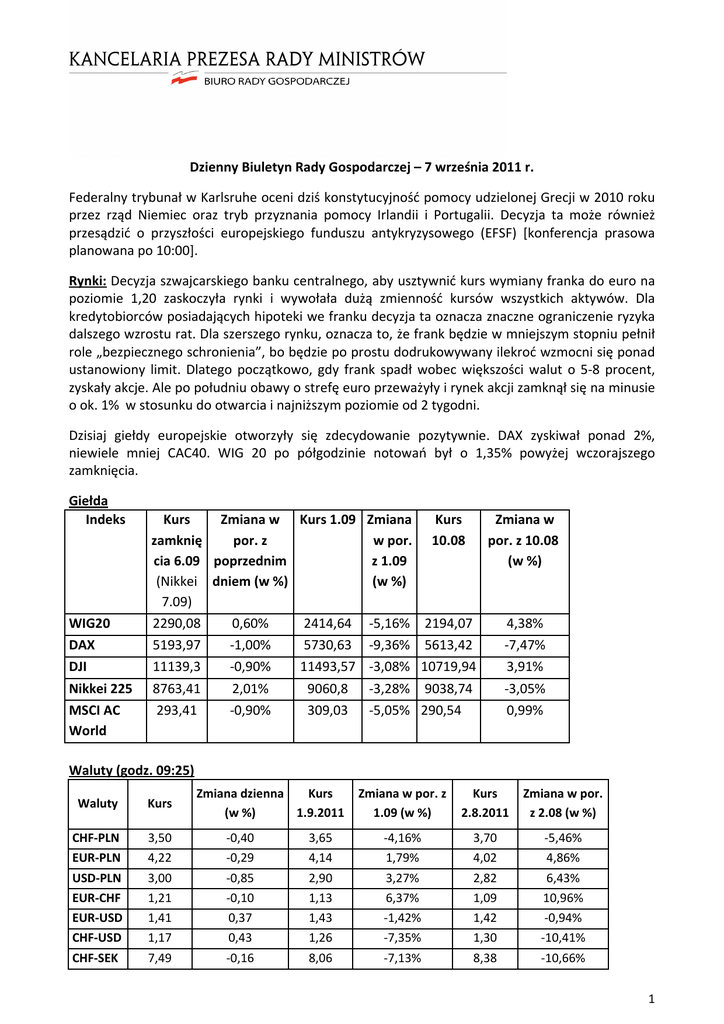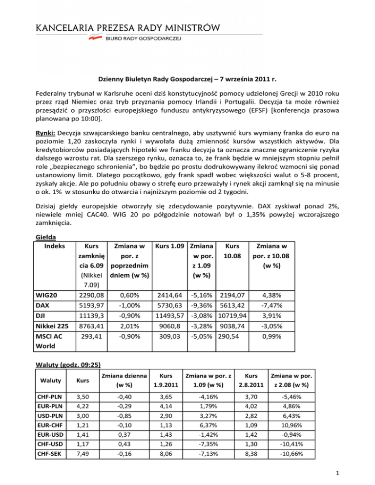 Dzienny Biuletyn Rady Gospodarczej – 7 września 2011 r. Federalny trybunał w Karlsruhe oceni dziś konstytucyjność pomocy udzielonej Grecji w 2010 roku przez rząd Niemiec oraz tryb przyznania pomocy Irlandii i Portugalii. Decyzja ta może również przesądzić o przyszłości europejskiego funduszu antykryzysowego (EFSF) [konferencja prasowa planowana po 10:00]. Rynki: Decyzja szwajcarskiego banku centralnego, aby usztywnić kurs wymiany franka do euro na poziomie 1,20 zaskoczyła rynki i wywołała dużą zmienność kursów wszystkich aktywów. Dla kredytobiorców posiadających hipoteki we franku decyzja ta oznacza znaczne ograniczenie ryzyka dalszego wzrostu rat. Dla szerszego rynku, oznacza to, że frank będzie w mniejszym stopniu pełnił role „bezpiecznego schronienia”, bo będzie po prostu dodrukowywany ilekroć wzmocni się ponad ustanowiony limit. Dlatego początkowo, gdy frank spadł wobec większości walut o 5-8 procent, zyskały akcje. Ale po południu obawy o strefę euro przeważyły i rynek akcji zamknął się na minusie o ok. 1% w stosunku do otwarcia i najniższym poziomie od 2 tygodni. Dzisiaj giełdy europejskie otworzyły się zdecydowanie pozytywnie. DAX zyskiwał ponad 2%, niewiele mniej CAC40. WIG 20 po półgodzinie notowań był o 1,35% powyżej wczorajszego zamknięcia. Giełda Indeks WIG20 DAX DJI Nikkei 225 MSCI AC World Kurs Zmiana w Kurs 1.09 Zmiana Kurs Zmiana w zamknię por. z w por. 10.08 por. z 10.08 cia 6.09 poprzednim z 1.09 (w %) (Nikkei dniem (w %) (w %) 7.09) 2290,08 0,60% 2414,64 -5,16% 2194,07 4,38% 5193,97 -1,00% 5730,63 -9,36% 5613,42 -7,47% 11139,3 -0,90% 11493,57 -3,08% 10719,94 3,91% 8763,41 2,01% 9060,8 -3,28% 9038,74 -3,05% 293,41 -0,90% 309,03 -5,05% 290,54 0,99% Waluty (godz. 09:25) Zmiana dzienna Kurs (w %) 1.9.2011 Waluty Kurs CHF-PLN EUR-PLN USD-PLN EUR-CHF EUR-USD CHF-USD CHF-SEK 3,50 4,22 3,00 1,21 1,41 1,17 -0,40 -0,29 -0,85 -0,10 0,37 0,43 7,49 -0,16 Zmiana w por. z 1.09 (w %) Kurs 2.8.2011 Zmiana w por. z 2.08 (w %) 3,65 4,14 2,90 1,13 1,43 1,26 -4,16% 1,79% 3,27% 6,37% -1,42% -7,35% 3,70 4,02 2,82 1,09 1,42 1,30 -5,46% 4,86% 6,43% 10,96% -0,94% -10,41% 8,06 -7,13% 8,38 -10,66% 1 UE: Parlament słowacki przesunął na grudzień głosowanie nad udziałem Słowacji w EFSF. Marszałek sejmu Richard Sulik nazwał fundusz „narzędziem do kreowania kolejnych długów”. KE wezwała Słowację do bezzwłocznego podjęcia decyzji. We francuskim parlamencie odbędzie się dziś głosowanie nad kolejną transzą pomocy dla Grecji. Kanclerz Merkel wykluczyła możliwość opuszczenia strefy euro przez jakiekolwiek państwo. Nawiązując do sytuacji w Grecji i we Włoszech zapowiedziała jednak, iż utrzymanie jedności strefy będzie wymagało wprowadzenia głębokich cięć w wydatkach publicznych. W odpowiedzi na strajk generalny, który sparaliżował we wtorek cały kraj, włoski rząd postanowił przyspieszyć głosowanie w senacie nad pakietem reform (podwyżka VAT o 1 pkt % do 21% oraz 3% podatek „solidarnościowy” od osób zarabiających ponad 500 lub 700 tys. euro rocznie). Koalicja rządząca Berlusconiego posiada większość pozwalającą na sprawne przeprowadzenie propozycji przez Senat. W Hiszpanii strajkujący nawołujący do ogłoszenia referendum w sprawie wprowadzenia do konstytucji reguły ograniczającej deficyt publiczny. Eurostat szacuje, iż w drugim kwartale 2011 roku PKB w UE17 (strefa Euro) wzrosło o 1,6% w stosunku do drugiego kwartału 2010 oraz o 1,7% w UE27. W pierwszym kwartale wzrost PKB w stosunku do analogicznego okresu w roku poprzednim wynosił 2,4% zarówno w całej UE jak i w strefie euro. Przewodniczący KE José Manuel Barroso kontynuuje azjatycką ofensywę podatkową w Australii i Nowej Zelandii promując ideę wprowadzenia podatku od transakcji finansowych. Podatek taki zaproponowała KE jako istotne źródło finansowania budżetu UE po 2013 roku. W obawie przed ucieczką sektora finansowego z UE, Państwa Członkowskie uzależniły poparcie dla takiego rozwiązania od rozpowszechnienia takiej formy opodatkowania na całym świecie. Rosja rozpoczęła pompowanie surowca do gazociągu Norsdtream. Oznacza to całkowite uniezależnienie dostaw do Europy Zachodniej od dotychczasowych linii przesyłowych. Różne: Współpraca: Departament Analiz Strategicznych KPRM i Departament Polityki Ekonomicznej MSZ 2