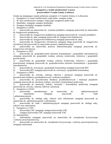 załącznik nr 2 do Zarządzenia Regulaminu Organizacyjnego Urzędu Gminy Lubiszyn Zastępstwa z tytułu nieobecności w pracy pracowników Urzędu Gminy Lubiszyn Ustala się następujące zasady pełnienia zastępstw w Urzędzie Gminy w Lubiszynie: 1. Zastępstwo w czasie nieobecności wójta pełni zastępca wójta. 2. W razie nieobecności zastępcy wójta jego zastępstwo pełni wójt. 3. Skarbnika zastępuje zastępca skarbnika. 4. Zastępcę skarbnika zastępuje skarbnik. 5. Zastępstwa w RFB: 1) pracownika na stanowisku ds. wymiaru podatków zastępuje pracownik na stanowisku ds. księgowości podatkowej, 2) pracownika ds. księgowości podatkowej zastępuje pracownik ds. wymiaru podatków, 3) pracownika ds. płac zastępuje pracownik ds. księgowości budżetowej, 4) pracownika ds. księgowości budżetowej zastępuje pracownik ds. płac, 5) pracownika ds. księgowości oświatowej zastępuje drugi pracownik ds. księgowości oświatowej lub pracownik na stanowisku pomocy administracyjnej, 6) pracownika na stanowisku pomocy administracyjnej zastępuje pracownik ds. księgowości oświatowej. 6. Zastępstwa w RIT: 1) pracownika ds. gospodarowania mieniem komunalnym i gospodarki mieszkaniowej zastępuje pracownik ds. gospodarki wodnej, ochrony środowiska, rolnictwa i gospodarki przestrzennej. 2) pracownika ds. gospodarki wodnej, ochrony środowiska, rolnictwa i gospodarki przestrzennej zastępuje pracownik ds. gospodarowania mieniem komunalnym i gospodarki mieszkaniowej 3) pracownika ds. inwestycji i gospodarki komunalnej zastępuje kierownik RIT. 4) kierownika RIT zastępuje pracownik ds. inwestycji i gospodarki komunalnej. 7. Zastępstwa w RPO: 1) pracownika ds. oświaty, ochrony zdrowia i promocji zastępuje pracownik ds. pozyskiwania funduszy pozabudżetowych i realizacji projektów, 2) pracownika ds. pozyskiwania funduszy pozabudżetowych i realizacji projektów zastępuje pracownik ds. promocji, kultury, turystyki i komunikacji społecznej, 3) pracownika ds. promocji, kultury, turystyki i komunikacji społecznej zastępuje pracownik ds. oświaty, ochrony zdrowia i promocji 8. Zastępstwa w RAO: 1) pracownika zatrudnionego na stanowisku ds. administracyjnych i sekretariatu zastępuje pracownik ds. kadr i administracyjnych, 2) pracownika ds. obsługi rady, sołectw oraz sekretariatu zastępuje pracownik na stanowisku ds. administracyjnych i sekretariatu, 3) pracownika ds. kadr i administracyjnych zastępuje pracownik ds. obsługi rady, sołectw oraz sekretariatu. 9. Zastępstwa w USC: 1) kierownika USC zastępuje zastępca kierownika USC 2) zastępcę kierownika USC zastępuje kierownik USC 10. Samodzielne: 1) informatyka zastępuje pracownik na stanowisku ds. zarządzania kryzysowego i ochrony przeciwpożarowej, 2) pracownika na stanowisku ds. zarządzania kryzysowego i ochrony przeciwpożarowej zastępuje informatyk.