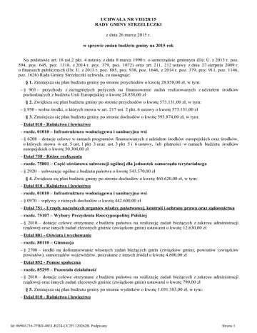 UCHWAŁA NR VIII/28/15 RADY GMINY STRZELECZKI z dnia 26 marca 2015 r. w sprawie zmian budżetu gminy na 2015 rok Na podstawie art. 18 ust.2 pkt. 4 ustawy z dnia 8 marca 1990 r. o samorządzie gminnym (Dz. U. z 2013 r. poz. 594, poz. 645, poz. 1318, z 2014 r. poz. 379, poz. 1072) oraz art. 211, 212 ustawy z dnia 27 sierpnia 2009 r. o finansach publicznych (Dz. U. z 2013 r. poz. 885, poz. 938, poz. 1646, z 2014 r. poz. 379, poz. 911, poz. 1146, poz. 1626) Rada Gminy Strzeleczki uchwala, co następuje: § 1. Zmniejsza się plan budżetu gminy po stronie przychodów o kwotę 28.858,00 zł, w tym: - § 903 – przychody z zaciągniętych pożyczek na finansowanie zadań realizowanych z udziałem środków pochodzących z budżetu Unii Europejskiej o kwotę 28.858,00 zł § 2. Zwiększa się plan budżetu gminy po stronie przychodów o kwotę 573.131,00 zł, w tym: - § 950 - wolne środki, o których mowa w art. 217 ust. 2 pkt. 6 ustawy o kwotę 573.131,00 zł § 3. Zmniejsza się plan budżetu gminy po stronie dochodów o kwotę 593.874,00 zł, w tym: - Dział 010 - Rolnictwo i łowiectwo - rozdz. 01010 – Infrastruktura wodociągowa i sanitacyjna wsi - § 6208 – dotacje celowe w ramach programów finansowanych z udziałem środków europejskich oraz środków, o których mowa w art. 5 ust. 1 pkt 3 oraz ust. 3 pkt 5 i 6 ustawy, lub płatności w ramach budżetu środków europejskich o kwotę 50.304,00 zł - Dział 758 - Różne rozliczenia - rozdz. 75801 – Część oświatowa subwencji ogólnej dla jednostek samorządu terytorialnego - § 2920 – subwencje ogólne z budżetu państwa o kwotę 543.570,00 zł § 4. Zwiększa się plan budżetu gminy po stronie dochodów o kwotę 460.620,00 zł, w tym: - Dział 010 - Rolnictwo i łowiectwo - rozdz. 01010 – Infrastruktura wodociągowa i sanitacyjna wsi - § 0970 – wpływy z różnych dochodów o kwotę 442.600,00 zł - Dział 751 - Urzędy naczelnych organów władzy państwowej, kontroli i ochrony prawa oraz sądownictwa - rozdz. 75107 – Wybory Prezydenta Rzeczypospolitej Polskiej - § 2010 – dotacje celowe otrzymane z budżetu państwa na realizację zadań bieżących z zakresu administracji rządowej oraz innych zadań zleconych gminie (związkom gmin) ustawami o kwotę 12.630,00 zł - Dział 801 - Oświata i wychowanie - rozdz. 80110 – Gimnazja - § 2700 – środki na dofinansowanie własnych zadań bieżących gmin (związków gmin), powiatów (związków powiatów), samorządów województw, pozyskane z innych źródeł o kwotę 4.600,00 zł - Dział 852 - Pomoc społeczna - rozdz. 85295 – Pozostała działalność - § 2010 – dotacje celowe otrzymane z budżetu państwa na realizację zadań bieżących z zakresu administracji rządowej oraz innych zadań zleconych gminie (związkom gmin) ustawami o kwotę 790,00 zł § 5. Zmniejsza się plan budżetu gminy po stronie wydatków o kwotę 1.031.383,00 zł, w tym: - Dział 010 - Rolnictwo i łowiectwo Id: 0690A716-7FBD-48E1-B224-CC2F1120262B. Podpisany Strona 1 - rozdz. 01010 – Infrastruktura wodociągowa i sanitacyjna wsi - § 6058 – wydatki inwestycyjne jednostek budżetowych o kwotę 50.304,00 zł (budowa kanalizacji sanitarnej w miejscowości Strzeleczki III etap) - Dział 600 - Transport i łączność - rozdz. 60016 – Drogi publiczne gminne - § 4270 – zakup usług remontowych o kwotę 36.000,00 zł - Dział 801 - Oświata i wychowanie - rozdz. 80101 – Szkoły podstawowe - § 3020 – wydatki osobowe niezaliczone do wynagrodzeń o kwotę 114.502,00 zł - § 4010 – wynagrodzenia osobowe o kwotę 319.000,00 zł - § 4040 – dodatkowe wynagrodzenie roczne o kwotę 16.500,00 zł - § 4110 – składki na ubezpieczenia społeczne o kwotę 60.300,00 zł - § 4120 – składka na fundusz pracy o kwotę 6.200,00 zł - § 4210 – zakup materiałów i wyposażenia o kwotę 94.600,00 zł - § 4240 – zakup pomocy naukowych, dydaktycznych i książek o kwotę 12.225,00 zł - § 4260 – zakup energii o kwotę 1.300,00 zł - § 4270 – zakup usług remontowych o kwotę 142.956,00 zł - § 4300 – zakup usług pozostałych o kwotę 950,00 zł - § 4360 - opłaty z tytułu zakupu usług telekomunikacyjnych o kwotę 550,00 zł - § 4410 – podróże służbowe krajowe o kwotę 900,00 zł - § 4430 – różne opłaty i składki o kwotę 550,00 zł - § 4440 - odpisy na zakładowy fundusz świadczeń socjalnych o kwotę 1.450,00 zł - § 4520 – opłaty na rzecz budżetów jednostek samorządu terytorialnego o kwotę 580,00 zł - § 4700 – szkolenia pracowników niebędących członkami korpusu służby cywilnej o kwotę 750,00 zł - rozdz. 80104 – Przedszkola - § 3020 – wydatki osobowe niezaliczone do wynagrodzeń o kwotę 2.700,00 zł - § 4010 – wynagrodzenia osobowe o kwotę 15.000,00 zł - § 4110 – składki na ubezpieczenia społeczne o kwotę 2.600,00 zł - § 4120 – składka na fundusz pracy o kwotę 400,00 zł - § 4210 – zakup materiałów i wyposażenia o kwotę 2.000,00 zł - § 4240 – zakup pomocy naukowych, dydaktycznych i książek o kwotę 300,00 zł - § 4260 – zakup energii o kwotę 300,00 zł - § 4270 – zakup usług remontowych o kwotę 432,00 zł - § 4300 – zakup usług pozostałych o kwotę 200,00 zł - § 4360 - opłaty z tytułu zakupu usług telekomunikacyjnych o kwotę 200,00 zł - § 4410 – podróże służbowe krajowe o kwotę 200,00 zł - § 4430 – różne opłaty i składki o kwotę 100,00 zł - § 4440 - odpisy na zakładowy fundusz świadczeń socjalnych o kwotę 300,00 zł - § 4520 – opłaty na rzecz budżetów jednostek samorządu terytorialnego o kwotę 100,00 zł Id: 0690A716-7FBD-48E1-B224-CC2F1120262B. Podpisany Strona 2 - § 4700 – szkolenia pracowników niebędących członkami korpusu służby cywilnej o kwotę 100,00 zł - rozdz. 80110 – Gimnazja - § 3020 – wydatki osobowe niezaliczone do wynagrodzeń o kwotę 28.200,00 zł - § 4010 – wynagrodzenia osobowe o kwotę 47.000,00 zł 