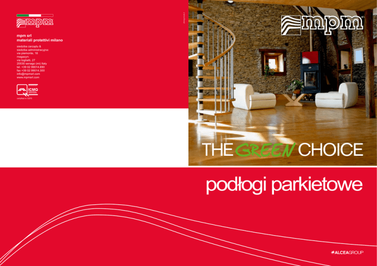alteregostudio.it mpm srl materiali protettivi milano siedziba zarządu & siedziba administracyjna: via piemonte, 18 magazyn: via togliatti, 27 20030 senago (mi) Italy tel. +39 02 99014.890 fax +39 02 99014.300 [email protected] www.mpmsrl.com UNI EN ISO 9001:2008 Certificazione sistema qualità certyfikat nr.12370 THE GREEN CHOICE podłogi parkietowe mpmsrl.com mpm, wybór podłóg parkietowych potwierdzony certyfikatem. Już od ponad 50 lat (1955) firma mpm doceniana jest za wyjątkowe osiągnięcia w zakresie chemii budowlanej. Od 2006 roku ALCEAGROUP przywiązuje każdego dnia jeszcze większą wagę do wymogów bezpieczeństwa i ochrony zdrowia, przestrzegając z pieczołowitością norm ochrony środowiska i bezpieczeństwa. Z tego względu opracowywanie receptur, produkcja i aplikacja podlegają szczególnej uwadze. Aktualizacja certyfikatów i dostosowywanie ich do obowiązujących przepisów to oznaki działań będących siłą napędową ALCEAGROUP. Dzięki temu zarówno partnerzy jak i klienci uważają nas za lidera na runku. -System Zarządzania Jakością zgodny z wymaganiami normy UNI EN ISO 9001:2008 -System Zarządzania Środowiskowego zgodny z wymaganiami normy UNI EN ISO 14001:2004 -System Zarządzania BHP zgodny z wymaganiami normy BS OHSAS 18001:2007 -Nasz Kodeks Etyczny skierowany do Społeczeństwa, stworzony z myślą o nim jak i o przedsiębiorstwie Doświadczenie pozyskiwane przez dziesięciolecia, rozwijanie i wprowadzanie przełomowych rozwiązań oraz zdobyte przez mpm “know-how” pozwoliło na stworzenie gamy produktów o bardzo niskiej emisji, przeznaczonych do parkietów drewnianych. Do rozwiązań objętych nazwą THE GREEN CHOICE należą: - kleje do drewnianych podłóg parkietowych - podkłady gruntujące - systemy przygotowujące podłoże kleje kleje firmy mpm: Twój komfort saving solutions. Asortyment klejów firmy mpm jest wynikiem wielu lat badań i rozwoju. W dążeniu do rozwiązania zagadnień technicznych dotyczących aplikacji oraz trwałości, stale doskonalone są parametry elastomerowe, tak by dostosować je jak najlepiej do właściwości drewna, niezależnie od rozmiarów oraz warunków aplikacji. 2012 - 6 STARMASTIC MONO GLUEX Ce rt. T G C Jednoskładnikowy poliuretanowy klej bezrozpuszczalnikowy o wysokiej sprężystości i dobrej przyczepności do parkietu. Dzięki wyjątkowej elastyczności jest wytrzymały na deformacje i przeznaczony do stosowania w tym celu. Dostępne opakowania: 7 kg Kolor: beżowy Dane techniczne: maksymalna wilgotność resztkowa podłoża: 2% aplikacja: wytłaczarka walcowa (opcjonalnie), paca zębata magazynowanie: 6 miesięcy zużycie: 1,0-1,2 kg/m² zielone opakowanie ’ brak odpadow recykling gospodarka odpadami 2012 - 6 STARMASTIC GLUEX spis treści mpm kleje: Twój komfort Green Choice. 5 4 Dostępne opakowania: 15 kg 8 mpm i ALCEAGROUP siedziby i zakłady produkcyjne. 10 bezpieczny i certyfikowany montaż parkietów. 12 profil firmy. 14 rt. T G C Dwuskładnikowy epoksy-poliuretanowy, bezrozpuszczalnikowy klej do parkietu. Przeznaczony do wszystkich rodzajów parkietów, łączonych i wielowarstwowych we wszystkich rozmiarach. Charakteryzuje się dobrą elastycznością i przyczepnością. Jego miękka konsystencja sprawia, że jest łatwy w aplikacji. mpm specjalne podkłady gruntujące: rozwiązania oszczędzające czas i pieniądze. 6 specjalne zaprawy wyrównujące, wypełniacze i masy wyrównujące. Ce Kolor: beżowy Dane techniczne: żywotność mieszaniny: około 180 minut aplikacja: paca zębata magazynowanie: 12 miesięcy zużycie: 1,2-1,6 kg/m² skontaktuj się z naszym serwisem technicznym www.mpmsrl.com podkłady gruntujące ODPOWIEDNI DO 10% WILGOTNOŚCI RESZTKOWEJ PODŁOŻA specjalne podkłady gruntujące 2012 - 6 DUROGLASS FU AUTOLIVELLANTE firmy mpm: Ce rt. T G C Trzyskładnikowa zaprawa samopoziomująca na bazie żywic epoksydowych i spoiw hydraulicznych, w postaci dyspersji wodnej, do przygotowania wilgotnych podłoży. rozwiązania oszczędzające czas i pieniądze. Dostępne opakowania: 25 kg-100 kg Kolor: szary Dane techniczne: mieszanie z wodą: w żadnym przypadku nie dodawać wody żywotność mieszaniny w 22°C: 25 minut ponowna aplikacja: po 24 h (22 °C, 50% RH) aplikacja: paca, a następnie wałek kolczasty magazynowanie: 12 miesięcy (unikać mrozu) zużycie: 2,15 kg/m²/mm grubość: 3 – 7 mm Szczątkowa lub rosnąca wilgotność jest z pewnością jedną z głównych przyczyn niepowodzeń w klejeniu podłóg drewnianych. Gama specjalnych mieszanek gruntujących mpm, testowanych przez dziesięciolecia w trudnych warunkach, stanowi szybkie i skuteczne rozwiązanie problemu. Ochrona przed wilgotnym podłożem dzięki zastosowaniu ekologicznego roztworu na bazie wody, podkładu bezrozpuszczalnikowego lub systemów impregnujących, pozwala na trwały montaż przy jednoczesnym skróceniu czasu ułożenia drewnianej podłogi i kleju. EN 13813 according to EN 13813 2012 - 6 STARCEMENT 5/A 2012 - 6 Ce rt. T G C Wielofunkcyjny i ekologiczny dwukomponentowy, epoksydowy podkład gruntujący w postaci dyspersji wodnej, odpowiedni do porowatych i lekko wilgotnych podłoży. Całkowicie nietoksyczny i bezwonny. Dostępne opakowania: 3 kg -16 kg DUROGLASS FU BIANCO TIX ODPOWIEDNI DO 4% WILGOTNOŚCI RESZTKOWEJ PODŁOŻA Dostępne opakowania: 5,3 kg -16 kg Dane techniczne: żywotność mieszaniny w 22°C: 40 minut EN 1504-2 ponowna aplikacja: po 48 h (22 °C, 50% RH) do pomiaru na sucho za pomocą elektronicznego wilgotnościomierza according to aplikacja: wałek, paca EN 1504-2 magazynowanie: 12 miesięcy (unikać mrozu) zużycie: 500 g/m² na warstwę grubość: 0,2 mm/warstwa – ilość warstw (dla uniknięcia efektu nakłuć): 2 EN 1504-2 according to EN 1504-2 Ce rt. T G C 2012 - 6 DUROGLASS FU RAPIDO Dostępne opakowania: 20 kg Kolor: bursztynowy rt. T G C Kolor: szary Dane techniczne: żywotność mieszaniny w 22°C: 30 minut ponowna aplikacja: po 4 h (22 °C, 50% RH) aplikac
