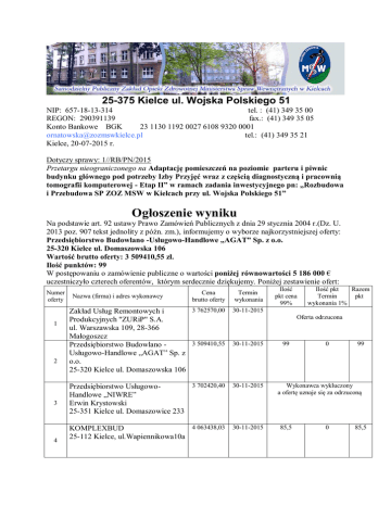 25-375 Kielce ul. Wojska Polskiego 51 NIP: 657-18-13-314 tel. : (41) 349 35 00 REGON: 290391139 fax.: (41) 349 35 05 Konto Bankowe BGK 23 1130 1192 0027 6108 9320 0001 [email protected] tel.: (41) 349 35 21 Kielce, 20-07-2015 r. Dotyczy sprawy: 1//RB/PN/2015 Przetargu nieograniczonego na Adaptację pomieszczeń na poziomie parteru i piwnic budynku głównego pod potrzeby Izby Przyjęć wraz z częścią diagnostyczną i pracownią tomografii komputerowej - Etap II” w ramach zadania inwestycyjnego pn: „Rozbudowa i Przebudowa SP ZOZ MSW w Kielcach przy ul. Wojska Polskiego 51” Ogłoszenie wyniku Na podstawie art. 92 ustawy Prawo Zamówień Publicznych z dnia 29 stycznia 2004 r.(Dz. U. 2013 poz. 907 tekst jednolity z późn. zm.), informujemy o wyborze najkorzystniejszej oferty: Przedsiębiorstwo Budowlano -Usługowo-Handlowe „AGAT” Sp. z o.o. 25-320 Kielce ul. Domaszowska 106 Wartość brutto oferty: 3 509410,55 zł. Ilość punktów: 99 W postępowaniu o zamówienie publiczne o wartości poniżej równowartości 5 186 000 € uczestniczyło czterech oferentów, którym serdecznie dziękujemy. Poniżej zestawienie ofert: Numer oferty 1 2 3 4 Nazwa (firma) i adres wykonawcy Cena brutto oferty Termin wykonania 3 762570,00 30-11-2015 Zakład Usług Remontowych i Produkcyjnych "ZURiP" S.A. ul. Warszawska 109, 28-366 Małogoszcz 3 509410,55 30-11-2015 Przedsiębiorstwo Budowlano Usługowo-Handlowe „AGAT” Sp. z o.o. 25-320 Kielce ul. Domaszowska 106 3 702420,40 30-11-2015 Przedsiębiorstwo UsługowoHandlowe „NIWRE” Erwin Krystowski 25-351 Kielce ul. Domaszowice 233 4 063438,03 30-11-2015 KOMPLEXBUD 25-112 Kielce, ul.Wapiennikowa10a Ilość pkt cena 99% Ilość pkt Razem Termin pkt wykonania 1% Oferta odrzucona 99 0 99 Wykonawca wykluczony a ofertę uznaje się za odrzuconą 85,5 0 85,5 Podpisanie umowy nastąpi w dniu 27-07-2015r. w siedzibie SPZOZMSW w Kielcach(art. 94 ust.1 pkt 2 ustawy PZP) Sporządziła : Maria Adela Ornatowska Zatwierdził: Dyrektor SPZOZ MSW lek. med. Grzegorz Guzik