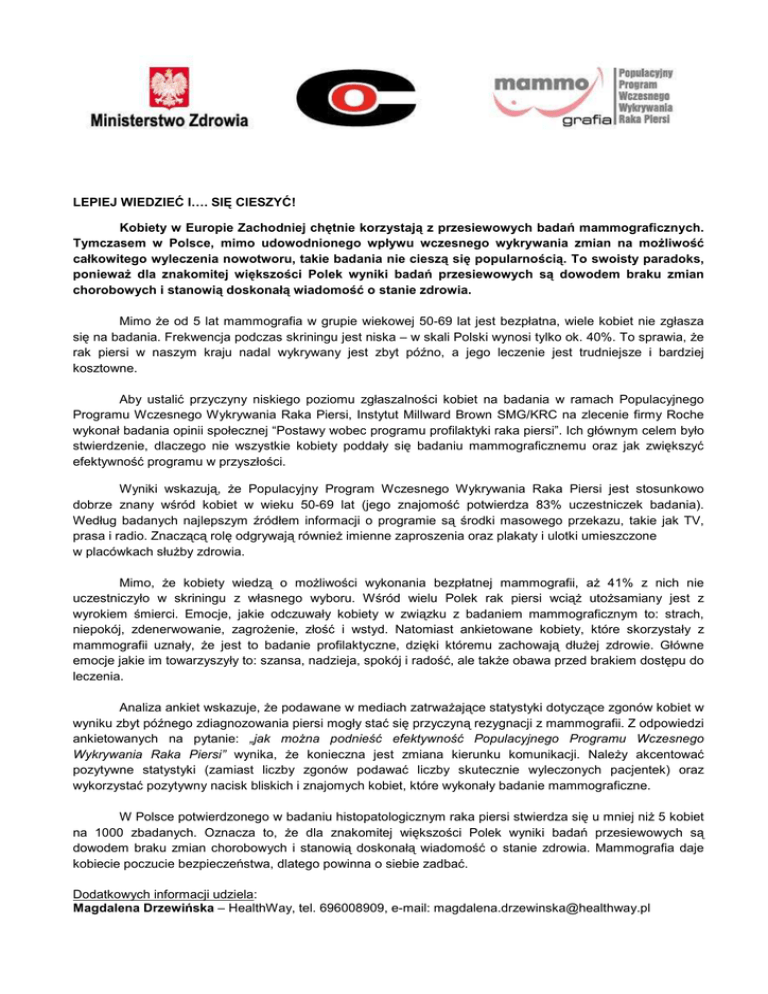 LEPIEJ WIEDZIEĆ I…. SIĘ CIESZYĆ! Kobiety w Europie Zachodniej chętnie korzystają z przesiewowych badań mammograficznych. Tymczasem w Polsce, mimo udowodnionego wpływu wczesnego wykrywania zmian na moŜliwość całkowitego wyleczenia nowotworu, takie badania nie cieszą się popularnością. To swoisty paradoks, poniewaŜ dla znakomitej większości Polek wyniki badań przesiewowych są dowodem braku zmian chorobowych i stanowią doskonałą wiadomość o stanie zdrowia. Mimo Ŝe od 5 lat mammografia w grupie wiekowej 50-69 lat jest bezpłatna, wiele kobiet nie zgłasza się na badania. Frekwencja podczas skriningu jest niska – w skali Polski wynosi tylko ok. 40%. To sprawia, Ŝe rak piersi w naszym kraju nadal wykrywany jest zbyt późno, a jego leczenie jest trudniejsze i bardziej kosztowne. Aby ustalić przyczyny niskiego poziomu zgłaszalności kobiet na badania w ramach Populacyjnego Programu Wczesnego Wykrywania Raka Piersi, Instytut Millward Brown SMG/KRC na zlecenie firmy Roche wykonał badania opinii społecznej “Postawy wobec programu profilaktyki raka piersi”. Ich głównym celem było stwierdzenie, dlaczego nie wszystkie kobiety poddały się badaniu mammograficznemu oraz jak zwiększyć efektywność programu w przyszłości. Wyniki wskazują, Ŝe Populacyjny Program Wczesnego Wykrywania Raka Piersi jest stosunkowo dobrze znany wśród kobiet w wieku 50-69 lat (jego znajomość potwierdza 83% uczestniczek badania). Według badanych najlepszym źródłem informacji o programie są środki masowego przekazu, takie jak TV, prasa i radio. Znaczącą rolę odgrywają równieŜ imienne zaproszenia oraz plakaty i ulotki umieszczone w placówkach słuŜby zdrowia. Mimo, Ŝe kobiety wiedzą o moŜliwości wykonania bezpłatnej mammografii, aŜ 41% z nich nie uczestniczyło w skriningu z własnego wyboru. Wśród wielu Polek rak piersi wciąŜ utoŜsamiany jest z wyrokiem śmierci. Emocje, jakie odczuwały kobiety w związku z badaniem mammograficznym to: strach, niepokój, zdenerwowanie, zagroŜenie, złość i wstyd. Natomiast ankietowane kobiety, które skorzystały z mammografii uznały, Ŝe jest to badanie profilaktyczne, dzięki któremu zachowają dłuŜej zdrowie. Główne emocje jakie im towarzyszyły to: szansa, nadzieja, spokój i radość, ale takŜe obawa przed brakiem dostępu do leczenia. Analiza ankiet wskazuje, Ŝe podawane w mediach zatrwaŜające statystyki dotyczące zgonów kobiet w wyniku zbyt późnego zdiagnozowania piersi mogły stać się przyczyną rezygnacji z mammografii. Z odpowiedzi ankietowanych na pytanie: „jak moŜna podnieść efektywność Populacyjnego Programu Wczesnego Wykrywania Raka Piersi” wynika, Ŝe konieczna jest zmiana kierunku komunikacji. NaleŜy akcentować pozytywne statystyki (zamiast liczby zgonów podawać liczby skutecznie wyleczonych pacjentek) oraz wykorzystać pozytywny nacisk bliskich i znajomych kobiet, które wykonały badanie mammograficzne. W Polsce potwierdzonego w badaniu histopatologicznym raka piersi stwierdza się u mniej niŜ 5 kobiet na 1000 zbadanych. Oznacza to, Ŝe dla znakomitej większości Polek wyniki badań przesiewowych są dowodem braku zmian chorobowych i stanowią doskonałą wiadomość o stanie zdrowia. Mammografia daje kobiecie poczucie bezpieczeństwa, dlatego powinna o siebie zadbać. Dodatkowych informacji udziela: Magdalena Drzewińska – HealthWay, tel. 696008909, e-mail: [email protected]