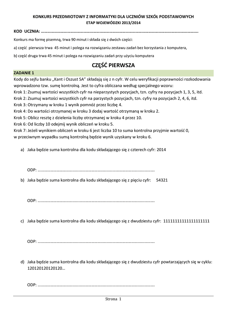 KONKURS PRZEDMIOTOWY Z INFORMATYKI DLA UCZNIÓW SZKÓŁ PODSTAWOWYCH ETAP WOJEWÓDZKI 2013/2014 KOD UCZNIA: ………………………………………………………………………………………………………………………………. Konkurs ma formę pisemną, trwa 90 minut i składa się z dwóch części: a) część pierwsza trwa 45 minut i polega na rozwiązaniu zestawu zadań bez korzystania z komputera, b) część druga trwa 45 minut i polega na rozwiązaniu zadań przy użyciu komputera CZĘŚĆ PIERWSZA ZADANIE 1 Kody do sejfu banku „Kant i Oszust SA” składają się z n cyfr. W celu weryfikacji poprawności rozkodowania wprowadzono tzw. sumę kontrolną. Jest to cyfra obliczana według specjalnego wzoru: Krok 1: Zsumuj wartości wszystkich cyfr na nieparzystych pozycjach, tzn. cyfry na pozycjach 1, 3, 5, itd. Krok 2: Zsumuj wartości wszystkich cyfr na parzystych pozycjach, tzn. cyfry na pozycjach 2, 4, 6, itd. Krok 3: Otrzymany w kroku 1 wynik pomnóż przez liczbę 4. Krok 4: Do wartości otrzymanej w kroku 3 dodaj wartość otrzymaną w kroku 2. Krok 5: Oblicz resztę z dzielenia liczby otrzymanej w kroku 4 przez 10. Krok 6: Od liczby 10 odejmij wynik obliczeń w kroku 5. Krok 7: Jeżeli wynikiem obliczeń w kroku 6 jest liczba 10 to suma kontrolna przyjmie wartość 0, w przeciwnym wypadku sumą kontrolną będzie wynik uzyskany w kroku 6. a) Jaka będzie suma kontrolna dla kodu składającego się z czterech cyfr: 2014 ODP: ……………………………………………………..…………………………………………. b) Jaka będzie suma kontrolna dla kodu składającego się z pięciu cyfr: 54321 ODP: ……………………………………………………..…………………………………………. c) Jaka będzie suma kontrolna dla kodu składającego się z dwudziestu cyfr: 11111111111111111111 ODP: ……………………………………………………..…………………………………………. d) Jaka będzie suma kontrolna dla kodu składającego się z dwudziestu cyfr powtarzających się w cyklu: 120120120120120… ODP: ……………………………………………………..…………………………………………. Strona 1 ZADANIE 2 Klasyczny szyfr Cezara polega na zastąpieniu każdej litery tekstu jawnego literą leżącą o trzy pozycje dalej w alfabecie, np. A kodujemy jako D, B jako E, itd. Po alfabecie poruszamy się cyklicznie – po Z następuje z powrotem A, w związku z czym literę Z zakodujemy jako C, Y jako B, itp. Jeżeli tekst jawny zawiera znak odstępu (spację) to zostaje on niezmieniony. W tym zadaniu posługujemy się 26 wielkimi literami alfabetu łacińskiego: a) Zaszyfruj poniższy komunikat używając klasycznego szyfru Cezara. PRIMUM NON NOCERE ……………………………………………………………………………………………………………… b) Szyfrowanie z kluczem k oznacza zastępowanie każdej litery literą o k pozycji dalszą z zachowaniem cykliczności alfabetu. Zaszyfruj poniższy komunikat szyfrem Cezara z kluczem 80. INFORMATYKA ………………………………………………………………………………………………………. c) Odszyfruj poniższy szyfrogram, który został zakodowany szyfrem Cezara z kluczem k=10. USW TOCDOW ……………………….…………………………………………………………………………………………………… d) Odszyfruj poniższy szyfrogram, który został zakodowany szyfrem Cezara z kluczem k=265 HTLNYT JWLT XZR ….……………….…………………………………………………………………………………………………… ZADANIE 3 Hetman (Królowa) atakując inne figury może poruszać się w dowolnym kierunku (poziomo, pionowo oraz na ukos) o dowolną liczbę wolnych pól. Na rysunku obok (plansza 8x8) hetman stoi w polu (2,6) i atakuje łącznie 23 wyróżnione kolorem pola. Zakładamy, że masz do dyspozycji planszę 5x5. Wpisz w każdą komórkę liczbę pól, które atakowałby Hetman znajdujący się w wybranym polu. Hetman stojący w polu (1, 1) atakuje 12 pól planszy. Strona 2 KOD UCZNIA: CZĘŚĆ DRUGA ZADANIE 4 Korzystając z dostępnych narzędzi informatycznych oblicz i wpisz poprawne odpowiedzi: a) Ile jest wszystkich naturalnych liczb czterocyfrowych? ODP: ……………………………………………………..…………………………………………. b) Ile jest naturalnych liczb czterocyfrowych podzielnych przez 3? ODP: ……………………………………………………..…………………………………………. c) Ile jest naturalnych liczb czterocyfrowych podzielnych przez 4? ODP: ……………………………………………………..…………………………………………. d) Ile jest naturalnych liczb czterocyfrowych podzielnych przez 3 lub przez 4? ODP: ……………………………………………………..…………………………………………. e) Ile wynosi suma wszystkich liczb czterocyfrowych podzielnych przez 3? ODP: ……………………………………………………..…………………………………………. f) Ile wynosi suma wszystkich liczb czterocyfrowych podzielnych przez 3, ale niepodzielnych przez 4? ODP: ……………………………………………………..…………………………………………. g) Ile wynosi suma wszystkich liczb czterocyfrowych podzielnych przez 3 i przez 4? ODP: ……………………………………………………..…………………………………………. h) Narysuj wykres kolumnowy obrazujący wyniki uzyskane w punktach (e), (f) i (g). Zapisz plik pod nazwą Zadanie4. Strona 3 ZADANIE 5 Napisz procedurę/funkcję OCZKO :n :w z dwoma parametrami, po wywołaniu której powstanie rysunek jak poniżej. Parametr n oznacza liczbę elementów, 