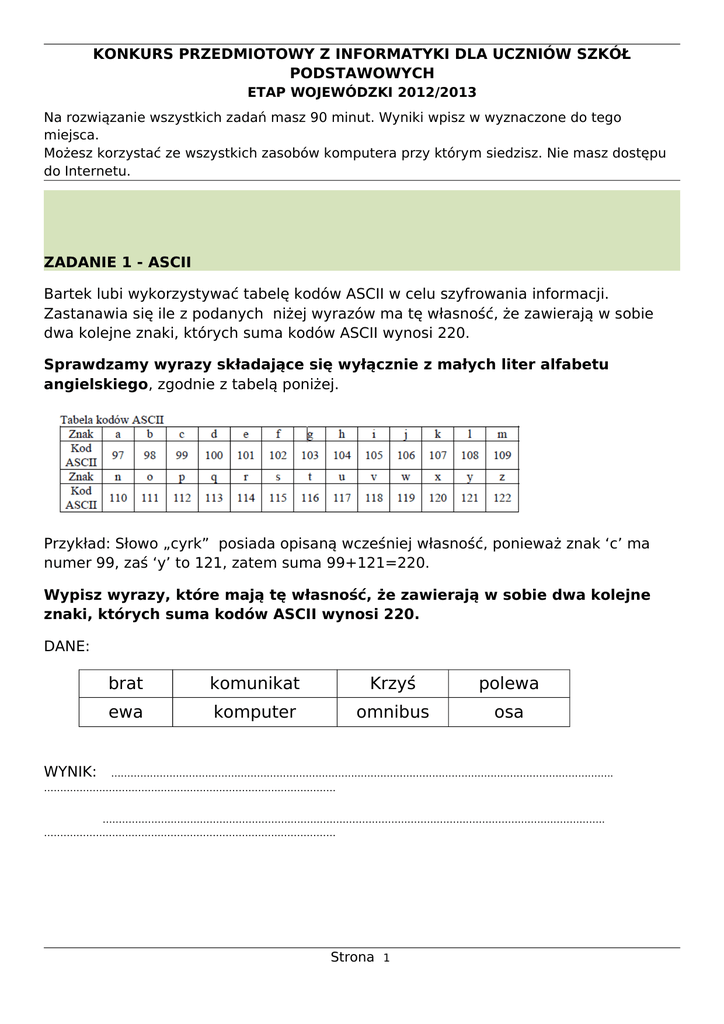 KONKURS PRZEDMIOTOWY Z INFORMATYKI DLA UCZNIÓW SZKÓŁ PODSTAWOWYCH ETAP WOJEWÓDZKI 2012/2013 Na rozwiązanie wszystkich zadań masz 90 minut. Wyniki wpisz w wyznaczone do tego miejsca. Możesz korzystać ze wszystkich zasobów komputera przy którym siedzisz. Nie masz dostępu do Internetu. ZADANIE 1 - ASCII Bartek lubi wykorzystywać tabelę kodów ASCII w celu szyfrowania informacji. Zastanawia się ile z podanych niżej wyrazów ma tę własność, że zawierają w sobie dwa kolejne znaki, których suma kodów ASCII wynosi 220. Sprawdzamy wyrazy składające się wyłącznie z małych liter alfabetu angielskiego, zgodnie z tabelą poniżej. Przykład: Słowo „cyrk” posiada opisaną wcześniej własność, ponieważ znak ‘c’ ma numer 99, zaś ‘y’ to 121, zatem suma 99+121=220. Wypisz wyrazy, które mają tę własność, że zawierają w sobie dwa kolejne znaki, których suma kodów ASCII wynosi 220. DANE: brat komunikat Krzyś polewa ewa komputer omnibus osa WYNIK: ……………………………………………………………………………………………………………………………………….. ……………………………………………………………………………… ……………………………………………………………………………………………………………………………………….. ……………………………………………………………………………… Strona 1 ZADANIE 2 – SCHEMAT BLOKOWY Jaki jest wynik działania algorytmu dla poniższych danych: a) x=10, y=-10 ……………………………………… b) x=10, y=10 ……………………………………... c) x=100, y=-1 …………………………………..…. d) x=-10, y=-10 ………………………………………. start We: x, y nie x+y>=0 nie tak x/y=1 nie tak X*y=100 tak Wy: x- y stop Strona 2 ZADANIE 3 - FIRMY Producenci A i B sprzedają pewien towar po 12,00 zł za sztukę. Każdy z nich stosuje dla hurtowni rabaty od każdej zakupionej sztuki. Producent A daje odbiorcom 15% (tj. 0,15) upustu przy zakupie do 50 sztuk, 25% upustu przy zakupie powyżej 50 do 150 sztuk i 40% dla zakupu powyżej 150 sztuk. Natomiast producent B dla odbiorców przygotował 10% upustu przy zakupie do 30 sztuk, oraz 25% upustu od każdej sztuki powyżej 30 do 100 sztuk, natomiast przy zakupie powyżej 100 sztuk oferuje upust 35% od każdej zakupionej sztuki. Towar pakowany jest po 10 sztuk, dlatego w odpowiedziach na poniższe pytania liczby sztuk mogą być tylko wielokrotnościami liczby 10. W obliczeniach przyjmij, że ilość sztuk jest liczbą z przedziału [10, 500]. a) Przy jakiej liczbie sztuk koszt zakupu towaru jest niższy u producenta B? Podaj wszystkie możliwości. ………………………………………………………………………………………………………… ……………….……… b) Przy jakiej liczbie sztuk towaru nie ma znaczenia, u którego producenta hurtownia zrobi zakupy? Podaj wszystkie możliwości. …………………………………………………………………………………….. ……………………………………….… c) Jaka jest największa liczba sztuk, dla której koszt zakupu u producenta A jest mniejszy niż koszt zakupu 300 sztuk u producenta B? ………………………………………………………………………………………………………… ……………..……….. Strona 3 ZADANIE 4 - LOGO Napisz procedurę KORALE :ile, po wywołaniu której będzie rysowany motyw taki, jak poniżej. Parametr :ile określa liczbę koralików. Średnica koralika wynosi 40. Oto przykładowe wywołania procedury: KORALE 6 KORALE 9 KORALE 12 KORALE 15 .......................................................................................................................................................................... .......................................................................................................................................................................... .......................................................................................................................................................................... .......................................................................................................................................................................... .......................................................................................................................................................................... ZADANIE 5 – Rozwiąż test: 1. 32 bity to: a) 1 bajt b) 4 bajty c) 16 bajtów d) 1 kilobajt 2. Językiem programowania nie jest: a) assembler b) turbo pascal c) acc++ d) basic Strona 4 3. IrDA to sposób komunikacji komputera z urządzeniem peryferyjnym za pomocą: a) fal radiowych b) promieniowania podczerwonego c) specjalnego kabla d) lasera 4. Przyporządkuj pojęcia do ich znaczeń, każdemu dokładnie jedno. Wpisz wyniki do tabeli” a) upgrade 1. archiwizacja danych a b c d b) ups 2. zasilacz awaryjny c) spyware 3. modernizacja komputera d) backup 4. oprogramowanie szpiegowskie 5. Przyporządkuj: a b c d a) switch, tcp, LAN 1. porty komputera b) htm, swf, java 2. sieć komputerowa c) com, usb, PS/2 3. tworzenie strony internetowej d) doc, exe, xls 4. rozszerzenia plików 6. W a) b) c) d) którym przypadku poprawnie użyto przecinka? komputer, drukarka komputer , drukarka komputer ,drukarka komputer,drukarka 7. W języku LOGO utworzono rysunek jak poniżej. Mógł on powstać po wydaniu polecenia: a) cs powtórz 6 [koło 10*numpow wstecz 10*numpow] b) cs powtórz 6 [koło 10/numpow wstecz 10*numpow] c) cs powtórz 6 [okrąg 10*numpow wstecz 10/numpow] d) cs powtórz 6 [koło 50-10*numpow wstecz 5010*numpow] Strona 5