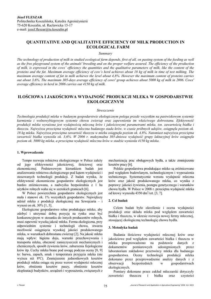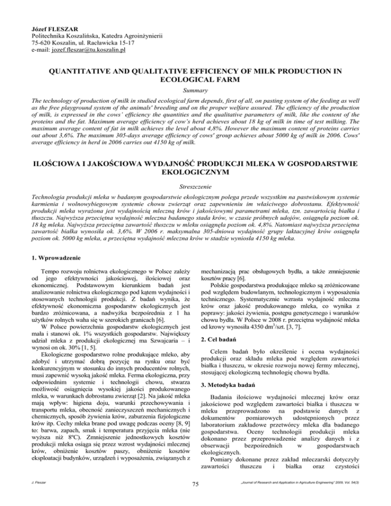 Józef FLESZAR Politechnika Koszalińska, Katedra Agroinżynierii 75-620 Koszalin, ul. Racławicka 15-17 e-mail: [email protected] QUANTITATIVE AND QUALITATIVE EFFICIENCY OF MILK PRODUCTION IN ECOLOGICAL FARM Summary The technology of production of milk in studied ecological farm depends, first of all, on pasting system of the feeding as well as the free playground system of the animals' breeding and on the proper welfare assured. The efficiency of the production of milk, is expressed in the cows’ efficiency the quantities and the qualitative parameters of milk, like the content of the proteins and the fat. Maximum average efficiency of cow’s herd achieves about 18 kg of milk in time of test milking. The maximum average content of fat in milk achieves the level about 4,8%. However the maximum content of proteins carries out about 3,6%. The maximum 305-days average efficiency of cows' group achieves about 5000 kg of milk in 2006. Cows' average efficiency in herd in 2006 carries out 4150 kg of milk. ILOŚCIOWA I JAKOŚCIOWA WYDAJNOŚĆ PRODUKCJI MLEKA W GOSPODARSTWIE EKOLOGICZNYM Streszczenie Technologia produkcji mleka w badanym gospodarstwie ekologicznym polega przede wszystkim na pastwiskowym systemie karmienia i wolnowybiegowym systemie chowu zwierząt oraz zapewnieniu im właściwego dobrostanu. Efektywność produkcji mleka wyrażona jest wydajnością mleczną krów i jakościowymi parametrami mleka, tzn. zawartością białka i tłuszczu. Najwyższa przeciętna wydajność mleczna badanego stada krów, w czasie próbnych udojów, osiągnęła poziom ok. 18 kg mleka. Najwyższa przeciętna zawartość tłuszczu w mleku osiągnęła poziom ok. 4,8%. Natomiast najwyższa przeciętna zawartość białka wynosiła ok. 3,6%. W 2006 r. maksymalna 305-dniowa wydajność grupy laktacyjnej krów osiągnęła poziom ok. 5000 kg mleka, a przeciętna wydajność mleczna krów w stadzie wyniosła 4150 kg mleka. 1. Wprowadzenie mechanizacją prac obsługowych bydła, a także zmniejszenie kosztów pracy [6]. Polskie gospodarstwa produkujące mleko są zróżnicowane pod względem budowlanym, technologicznym i wyposażenia technicznego. Systematycznie wzrasta wydajność mleczna krów oraz jakość produkowanego mleka, co wynika z poprawy: jakości żywienia, postępu genetycznego i warunków chowu bydła. W Polsce w 2008 r. przeciętna wydajność mleka od krowy wynosiła 4350 dm3/szt. [3, 7]. Tempo rozwoju rolnictwa ekologicznego w Polsce zależy od jego efektywności jakościowej, ilościowej oraz ekonomicznej. Podstawowym kierunkiem badań jest analizowanie rolnictwa ekologicznego pod kątem wydajności i stosowanych technologii produkcji. Z badań wynika, że efektywność ekonomiczna gospodarstw ekologicznych jest bardzo zróżnicowana, a nadwyżka bezpośrednia z 1 ha użytków rolnych waha się w szerokich granicach [6]. W Polsce powierzchnia gospodarstw ekologicznych jest mała i stanowi ok. 1% wszystkich gospodarstw. Największy udział mleka z produkcji ekologicznej ma Szwajcaria – i wynosi on ok. 30% [1, 5]. Ekologiczne gospodarstwo rolne produkujące mleko, aby zdobyć i utrzymać dobrą pozycję na rynku oraz być konkurencyjnym w stosunku do innych producentów rolnych, musi zapewnić wysoką jakość mleka. Ferma ekologiczna, przy odpowiednim systemie i technologii chowu, stwarza możliwość osiągnięcia wysokiej jakości produkowanego mleka, w warunkach dobrostanu zwierząt [2]. Na jakość mleka mają wpływ: higiena doju, warunki przechowywania i transportu mleka, obecność zanieczyszczeń mechanicznych i chemicznych, sposób żywienia krów, zaburzenia fizjologiczne krów itp. Cechy mleka brane pod uwagę podczas oceny [8, 9] to: barwa, zapach, smak i temperatura przyjęcia mleka (nie wyższa niż 8ºC). Zmniejszenie jednostkowych kosztów produkcji mleka osiąga się przez wzrost wydajności mlecznej krów, obniżenie kosztów paszy, obniżenie kosztów eksploatacji budynków, urządzeń i wyposażenia, związanych z J. Fleszar 2. Cel badań Celem badań było określenie i ocena wydajności produkcji oraz składu mleka pod względem zawartości białka i tłuszczu, w okresie rozwoju nowej fermy mlecznej, stosującej ekologiczną technologię chowu bydła. 3. Metodyka badań Badania ilościowe wydajności mlecznej krów oraz jakościowe pod względem zawartości białka i tłuszczu w mleku przeprowadzono na podstawie danych z dokumentów pomiarowych udostępnionych przez laboratorium zakładowe przetwórcy mleka dla badanego gospodarstwa. Oceny technologii produkcji mleka dokonano przez przeprowadzenie analizy danych i z obserwacji bezpośrednich w gospodarstwach ekologicznych. Pomiary dokonane przez zakład mleczarski dotyczyły zawartości tłuszczu i białka oraz czystości 75 „Journal of Research and Application in Agriculture Engineering” 2009, Vol. 54(3) firmy WestfaliaSorge, w której jednocześnie dojone jest 12 krów. Dojarka charakteryzuje się szeregiem rozwiązań technicznych umożliwiających sprawny i prawidłowy dój oraz utrzymanie jej czystości. Do mycia wymion wykorzystywane są spryskiwacze – „pistolety” wodne. Kubki udojowe wyposażone są w elastyczne silikonowe gumy strzykowe. Elektroniczny pulsator zapewnia wysoką dokładność pulsacji oraz umożliwia wstępną stymulację wymienia krowy, co skraca czas doju, a także zwiększa sprawność doju. Stymulacja może być regulowana w czasie (20-90 sek.), a realizowana jest przy podciśnieniu 20 kPa i 300 taktach/min. Przejście z fazy stymulacji do fazy doju właściwego następuje automatycznie w czasie 6 sek. Schładzalnik mleka, o pojemności zbiornika 6000 litrów, posiada wielosekcyjny układ parowników z niezależnym obiegiem czynnika chłodniczego i poziomymi sekcjami, uruchamianymi w miarę napełniania zbiornika, co umożliwia efektywne schładzanie mleka. Elektroniczny automat myjący, z podgrzewaczem i automatycznym dozowaniem środków myjących, wyposażono w pompę wodn