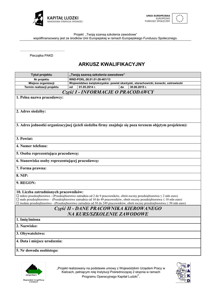 Projekt „Twoją szansą szkolenia zawodowe” współfinansowany jest ze środków Unii Europejskiej w ramach Europejskiego Funduszu Społecznego. …………………………………… Pieczątka PAKD ARKUSZ KWALIFIKACYJNY Tytuł projektu „Twoją szansą szkolenia zawodowe” Nr projektu Miejsce organizacji Termin realizacji projektu WND-POKL.08.01.01-26-461/13 Województwo świętokrzyskie: powiat skarżyski, starachowicki, konecki, ostrowiecki od 01.05.2014 r. do 30.06.2015 r. Część I - INFORMACJE O PRACODAWCY 1. Pełna nazwa pracodawcy: 2. Adres siedziby: 3. Adres jednostki organizacyjnej (jeżeli siedziba firmy znajduje się poza terenem objętym projektem): 3. Powiat: 4. Numer telefonu: 5. Osoba reprezentująca pracodawcę: 6. Stanowisko osoby reprezentującej pracodawcę: 7. Forma prawna: 8. NIP: 9. REGON: 10. Liczba zatrudnionych pracowników: mikro przedsiębiorstwo - (Przedsiębiorstwo zatrudnia od 2 do 9 pracowników, obrót roczny przedsiębiorstwa ≤ 2 mln euro) małe przedsiębiorstwo - (Przedsiębiorstwo zatrudnia od 10 do 49 pracowników, obrót roczny przedsiębiorstwa ≤ 10 mln euro) średnie przedsiębiorstwo - (Przedsiębiorstwo zatrudnia od 50 do 249 pracowników, obrót roczny przedsiębiorstwa ≤ 50 mln euro) Część II - DANE PRACOWNIKA KIEROWANEGO NA KURS/SZKOLENIE ZAWODOWE 1. Imię/imiona 2. Nazwisko: 3. Obywatelstwo: 4. Data i miejsce urodzenia: 5. Nr dowodu osobistego: „Projekt realizowany na podstawie umowy z Wojewódzkim Urzędem Pracy w Kielcach, pełniącym rolę Instytucji Pośredniczącej 2 stopnia w ramach Programu Operacyjnego Kapitał Ludzki”. Projekt „Twoją szansą szkolenia zawodowe” współfinansowany jest ze środków Unii Europejskiej w ramach Europejskiego Funduszu Społecznego. 6. PESEL: 7. NIP: 8. Adres zamieszkania: Województwo:............................................... Powiat: ……………………… miejscowość ………….....………….. ulica: ................................................................................. nr domu ........................... nr lokalu ……………. kod pocztowy: ……………… miejscowość………………………………… 9. Adres korespondencyjny: województwo: ............................................................... powiat: …………………………… ulica: ................................................................................. nr domu …………….nr lokalu: ......................... kod pocztowy: ........................................... miejscowość: ……………… ……………………………………………… 10.Obszar zamieszkania: miejski wiejski (Gminy wiejskie, gminy wiejsko-miejskie i miasta do 25 tyś. mieszkańców) 11. Numer telefonu: 12. Adres poczty elektronicznej do kontaktu: 13. Opieka nad dziećmi do lat 7 lub opieka nad osobą zależną. (Pod tym określeniem rozumie się fakt posiadania przez uczestnika projektu pod opieką dziecka do lat 7 lub osoby zależnej zgodnie z definicją zawartą w ustawie o promocji zatrudnienia i instytucjach rynku pracy (Dz. U. z dnia 1.V2004) Tak 14. Wykształcenie: podstawowe/gimnazjalne średnie /ponadgimnazjalne pomaturalne wyższe Część III - INFORMACJE O KANDYDACIE Wykonywane stanowisko: Posiadane kwalifikacje (zdobyte na kursach, szkoleniach): Umowa zawarta ( od kiedy do kiedy): „Projekt realizowany na podstawie umowy z Wojewódzkim Urzędem Pracy w Kielcach, pełniącym rolę Instytucji Pośredniczącej 2 stopnia w ramach Programu Operacyjnego Kapitał Ludzki”. Nie Projekt „Twoją szansą szkolenia zawodowe” współfinansowany jest ze środków Unii Europejskiej w ramach Europejskiego Funduszu Społecznego. Część IV- Deklaruję uczestnictwo pracownika w bezpłatnym szkoleniu realizowanym w ramach projektu: L.p Nazwa kursu Kurs prawo jazdy kat. C, ADR podstawowy, Cysterny, Kurs kwalifikacji wstępnej przyspieszonej na przewóz rzeczy (230 h) ; (II edycje po 10 BO) Kurs rachunkowości dla samodzielnych księgowych ( 165 h); (I edycja - 10 BO) Operator obrabiarek sterowanych numerycznie (150 h) ; (II edycje po 10 BO) Magazynier z obsługą wózka widłowego; (1 edycje - 15 BO) Szkolenie dla pielęgniarek (kursy kwalifikacyjne – rodzinna/opieki paliatywnej/inne typy szkoleń zostaną wybrane w zależności od potrzeb) (353 h) ; (II edycje po 20 BO) Planowane terminy zajęć Czerwiec 2014 – Październik 2014 Styczeń 2015-Maj 2015 Lipiec 2014 – Wrzesień 2014 Wrzesień 2014- Listopad 2014 Marzec 2015 – Maj 2015 Sierpień 2014 – Październik 2014 Wrzesień 2014 – Luty 2015 Grudzień 2014 – Maj 2015 Lipiec 2014 – Październik 2014 Marzec 2015 – Czerwiec 2015 Wybieram tematykę:………………………………………………… Operator koparko-ładowarki (202 h) ; (II edycje po 15 BO) Obsługa wtryskiwaczy Common Rail (3 dni,20 h, szkolenie wyjazdowe ) ; (I edycje - 10 BO) Wrzesień 2014 ECDL core (107 h) ; (I edycja - 15 BO) Styczeń 2015 – Kwiecień 2015 Elektryk + uprawnienia do 1 KV (35 h); (I edycja – 10 BO) Wrzesień 2014 – Październik 2014 Spawanie (MIG, MAG, TIG) – typ szkolenia zostanie wybrany w zależności od potrzeb. (I edycja – 15 BO) Wybieram typ:………………………………………………………… Lipiec 2014 – Wrzesień 2014 Prawo jazdy kat. C Kwiecień 2015 – Czerwiec 2015 Kurs kwalifikacji wstępnej przyspieszonej na przewóz rzeczy Kwiecień 2015 – Czerwiec 2015 Spawanie metodą MIG Kwiecień 2015 – Czerwiec 2015 *proszę zaznaczyć wybrane szkolenie „Projekt realizowany na podstawie umowy z Wojewódzkim Urzędem Pracy w Kielcach, pełniącym rolę Instytucji Pośredniczącej 2 stopnia w ramach Programu Operacyjnego Kapitał Ludzki”. Projekt „Twoją szansą szkolenia zawodowe” współfinansowany jest ze środków Unii Europejskiej w ramach Europejskiego Funduszu Społecznego. Oświadczam, że: jestem pracodawcą sektora MŚP, posiadam jednostkę organizacyjną