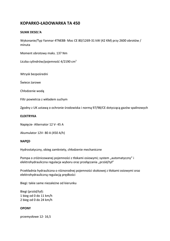 KOPARKO-ŁADOWARKA TA 450 SILNIK DESEL’A Wykonanie/Typ Yanmar 4TNE88- Moc CE 80/1269-31 kW (42 KM) przy 2600 obrotów / minuta Moment obrotowy maks. 137 Nm Liczba cylindrów/pojemność 4/2190 cm3 Wtrysk bezpośredni Świece żarowe Chłodzenie wodą Filtr powietrza z wkładem suchym Zgodny z UK ustawą o ochronie środowiska i normą 97/98/CE dotyczącą gazów spalinowych ELEKTRYKA Napięcie- Alternator 12 V- 45 A Akumulator 12V- 80 A (450 A/h) NAPĘD Hydrostatyczny, obieg zamkniety, chłodzenie mechaniczne Pompa o zróżnicowanej pojemności z tłokami osiowymi; system „automatyczny” i elektrohydrauliczna regulacja wyboru oraz przełączania „przód/tył” Przekładnia hydrauliczna o różnorodnej pojemności skokowej z tłokami osiowymi oraz elektrohydrauliczną regulacją prędkości Biegi: takie same niezależne od kierunku Biegi (przód/tył): 1 bieg od 0 do 11 km/h 2 bieg od 0 do 24 km/h OPONY przemysłowe 12- 16,5 CENTRALNE POŁACZENIE PRZEGUBOWE I OSCYLACJA Urządzenie typu „heavy duty” (przeznaczone do pracy w trudnych warunkach), przegub na łożysku kulkowym i sworzeń Artykulacja 80º Oscylacja +/- 9º maks OSIE Sztywne, z redukcjami planetarnymi przy piastach kół Stały napęd na 4 koła Hydrauliczne hamulce tarczowe na tylnej osi OBSŁUGA HAMULCÓW Regulacja hydrauliczna przy pomocy niezależnej pompy. Hydrauliczne samonastawne hamulce tarczowe na tylnej osi. BEZPIECZEŃSTWO I PARKOWANIE: Hamulce działające na 4 koła Główny efekt hamowania uzyskiwany jest również dzięki systemowi napędu hydrostatycznego przy zwolnionym pedale gazu STEROWANIE Samowspomagane przy pomocy napędu typu „load sensing” (kompensacji obciążenia); oddziaływujące na cylinder hydrauliczny Pojemność 100 cm3 Promień skrętu: zewnętrzny narożnik łyżki 3,3 mm Promień zewnętrzny koła 3,0 mm Promień wewnętrzny 1, 6 mm SYSTEM HYDRAULICZNY Typ pompy o podwójnym biegu System filtracji ciśnieniowej Dźwignia sterująca typu joy-stick; o wysokiej wrażliwości; samowspomagająca; for smooth and tireles operations Modulator, 2-elementowy rozdzielacz hydrauliczny w obwodzie równoległym Modulator łyżki, obwód równoległy Aluminiowy powietrzno-olejowy wymiennik ciepła Przepływ, do 60 l/min Maks. ciśnienie 200 bar POJEMNOŚCI EKSPLOATACYJNE Zbiornik oleju hydraulicznego 35l System hydrauliczny 60l Zbiornik paliwa 40l System hamulcowy 0,5l Przekładnia 7l Olej napędowy 2l WYDAJNOŚĆ KOPARKI Preinstalacja hydraulicznego systemu kruszarki Osiągalna głębokość, maks. 3000 mm Głębokość kopania, maks. 2 800 mm Czerpak kopiący maks. 2600 kg WYDAJNOŚĆ ŁADOWARKI Pojemność łyżki 500 l Szerokość łyżki 1450 mm Ładowność 3000 kg Udźwig z ziemi 2900 kg Udźwig na maksymalną wysokość 2000 kg Wyładunek przy pełnym obrocie 2500 kg Pojemność operacyjna przy pełnym obrocie 1500 kg STANOWISKO OPERATORA Zadaszenie: atestowane obramowanie typu ROPS/FOPS W pełni regulowane siedzenie anatomiczne, wyposażone w pasy bezpieczeństwa. Wszystkie elementy kontrolujące są rozmieszczone w racjonalny i ergonomiczny sposób DESKA ROZDZIELCZA zawierająca: kluczyk zapłonu; licznik czasu pracy; klakson; włącznik świateł; włącznik kierunkowskazów; włącznik świateł awaryjnych; włącznik koguta obrotowego ŚWIATŁA OSTRZEGAWCZE: świece żarowe; przełącznik najwyższego biegu; wentylator; kierunkowskazy; światła bezpieczeństwa; krótkie światła; kogut obrotowy;wskaźnik temperatury silnika SPRZĘT NA ŻYCZENIE: bezpieczna kabina typu ROPS/FOPS; prawe i lewe drzwi; szyba z glazurowanego i izolacyjnego szkła (przednia i tylna); przednia i tylna szyba z wycieraczką WYMIARY Szerokość maks. 1450 mm Długość 4250 mm Wysokość 2460 mm Ciężar operacyjny 3100 kg