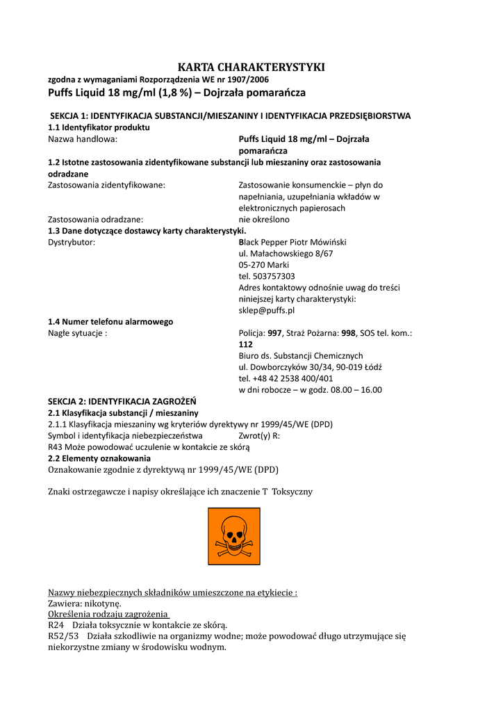KARTA CHARAKTERYSTYKI zgodna z wymaganiami Rozporządzenia WE nr 1907/2006 Puffs Liquid 18 mg/ml (1,8 %) – Dojrzała pomarańcza SEKCJA 1: IDENTYFIKACJA SUBSTANCJI/MIESZANINY I IDENTYFIKACJA PRZEDSIĘBIORSTWA 1.1 Identyfikator produktu Nazwa handlowa: Puffs Liquid 18 mg/ml – Dojrzała pomarańcza 1.2 Istotne zastosowania zidentyfikowane substancji lub mieszaniny oraz zastosowania odradzane Zastosowania zidentyfikowane: Zastosowanie konsumenckie – płyn do napełniania, uzupełniania wkładów w elektronicznych papierosach Zastosowania odradzane: nie określono 1.3 Dane dotyczące dostawcy karty charakterystyki. Dystrybutor: Black Pepper Piotr Mówiński ul. Małachowskiego 8/67 05-270 Marki tel. 503757303 Adres kontaktowy odnośnie uwag do treści niniejszej karty charakterystyki: [email protected] 1.4 Numer telefonu alarmowego Nagłe sytuacje : Policja: 997, Straż Pożarna: 998, SOS tel. kom.: 112 Biuro ds. Substancji Chemicznych ul. Dowborczyków 30/34, 90-019 Łódź tel. +48 42 2538 400/401 w dni robocze – w godz. 08.00 – 16.00 SEKCJA 2: IDENTYFIKACJA ZAGROŻEŃ 2.1 Klasyfikacja substancji / mieszaniny 2.1.1 Klasyfikacja mieszaniny wg kryteriów dyrektywy nr 1999/45/WE (DPD) Symbol i identyfikacja niebezpieczeństwa Zwrot(y) R: R43 Może powodować uczulenie w kontakcie ze skórą 2.2 Elementy oznakowania Oznakowanie zgodnie z dyrektywą nr 1999/45/WE (DPD) Znaki ostrzegawcze i napisy określające ich znaczenie T Toksyczny Nazwy niebezpiecznych składników umieszczone na etykiecie : Zawiera: nikotynę. Określenia rodzaju zagrożenia R24 Działa toksycznie w kontakcie ze skórą. R52/53 Działa szkodliwie na organizmy wodne; może powodować długo utrzymujące się niekorzystne zmiany w środowisku wodnym. Określenia dotyczące prawidłowego postępowania z mieszaniną S1/2 Przechowywać pod zamknięciem i chronić przed dziećmi. S13 Nie przechowywać razem z żywnością, napojami i paszami dla zwierząt. S24 Unikać zanieczyszczenia skóry. S27/28 W przypadku zanieczyszczenia skóry natychmiast zdjąć całą zanieczyszczoną odzież i przemyć zanieczyszczoną skórę dużą ilością wody. S36/37 Nosić odpowiednią odzież ochronną i odpowiednie rękawice ochronne. S45 W przypadku awarii lub jeżeli źle się poczujesz, niezwłocznie zasięgnij porady lekarza - jeżeli to możliwe, pokaż etykietę. 2.3 Inne zagrożenia Brak informacji na temat spełnienia kryteriów PBT lub vPvB zgodnie z załącznikiem XIII rozporządzenia REACH. Odpowiednie badania nie były przeprowadzone. SEKCJA 3: SKŁAD / INFORMACJE O SKŁADNIKACH 3.1 Substancje Nie dotyczy 3.2 Mieszaniny Lp. Nazwa WE Numer WE Numer CAS Stężenie Klasyfikacja [% wag.] Rozp. CLP Wg 1272/2008/WE 1 Glikol 1,2propylenowy 200-338-0 57-55-6 60,00% Nieklasyfik nieklasyfikowana owana 200-289-5 56-81-5 30,00% nieklasyfiko nieklasyfikowana wana 2 Gliceryna 3 Etanol 200-578-6 64-17-5 ≤0,50% F, R 11 nieklasyfikowana 4 Nikotyna 200-193-3 54-11--5 ≤1,8% Acute Tox. 1 H310, Acute Tox. 3 H301, Aquatic Chronic 2 H411 5 d-limonen 227-813-5 5989-27-5 <0,25% Xi-N; R1038-4350/53 Flam. Liq. 3, H226; Skin Irrit. 2, H315; Skin Sens. 1, H317; Aquatic Acute 1, H400; Aquatic Chronic 1, H410 6 octan etylu 205-500-4 141-78-6 F-Xi; R1136-66-67 Flam. Liq. 2, H225; Eye Irrit. 2, H319; STOT SE 3, H336 T+, R27, T, R25, N, R51/53 <0,25% Dystrybutor niniejszej mieszaniny oświadcza, że wprowadza do obrotu mniej niż 1 tonę rocznie, każdego ze składników tej mieszaniny i tym samym nie jest zobowiązany do rejestracji tych substancji wg wymagań Rozporządzenia (WE) nr 1907/2006 (REACH). Wyjaśnienie znaczenia skrótów i zwrotów podanych w treści powyższej tabeli znajduje się w Sekcji 16 niniejszej karty charakterystyki. SEKCJA 4: ŚRODKI PIERWSZEJ POMOCY 4.1 Opis środków pierwszej pomocy Kontakt z oczami: Kontakt ze skórą: (skażenie lub oblanie skóry/odzieży) Połknięcie: W przypadku kontaktu oczu z produktem należy je przemywać bieżącą wodą, ale niezbyt silnym jej strumieniem, przez kilkanaście minut (najlepiej nie krócej niż 15 min.), przez jakiś czas trzymać powiekę szeroko otwartą. W przypadku nie ustąpienia podrażnienia zasięgnąć pomocy lekarskiej. Pamiętać o usunięciu szkieł kontaktowych przed przystąpieniem do płukania, o ile poszkodowany ich używał. W przypadku kontaktu skóry z produktem w pierwszej kolejności należy zadbać o mechaniczne usunięcie produktu ze skażonej powierzchni. Skażone pola umyć dokładnie pod strumieniem bieżącej wody z użyciem mydła. W przypadku kontaktu większej części ciała należy się dokładnie spłukać pod prysznicem najpierw czystą letnią wodą a następnie zmyć ciało dostępnymi środkami higienicznymi. W przypadku utrzymywania się uczucia podrażnienia na skórze zasięgnąć porady lekarskiej nie później niż w ciągu 12 h od zdarzenia. Przy stosowaniu ochrony dróg oddechowych (patrz poniżej) należy wykluczyć możliwość połknięcia produktu – w przypadku połknięcia najlepiej jest poddać poszkodowanego, bez zbędnej zwłoki, profesjonalnemu płukaniu dróg pokarmowych pod nadzorem medycznym Kontakt drogami oddechowymi: Unikać bezpośredniego kontaktu z powstałymi podczas różnych operacji przetwórczych i transportowych pyłami poprzez stosowanie co najmniej półmaski przeciwpyłowej 4.2 Najważniejsze ostre i opóźnione objawy oraz skutki narażenia W kontakcie z oczami: zaczerwienienie, łzawienie, chwilowe podrażnienie. Po połknięciu: nudności, wymioty, w skrajnych przypadkach po wypiciu bardzo dużej ilości produktu objawy zatrucia: mdłości, problemu z oddychaniem, zawroty głowy, zaburzenia ze strony układu oddechowego. W kontakcie ze skórą: produkt jest absorbowany przez skórę i powoduje takie same objawy jak po połknięciu: problemy z oddychaniem, zawroty głowy, skurcze, mdłości, wymioty, a w skrajnych przypadkach śmierć. U osób wrażliwych może wystąpić reakcja alergiczna. Inhalacja: w 