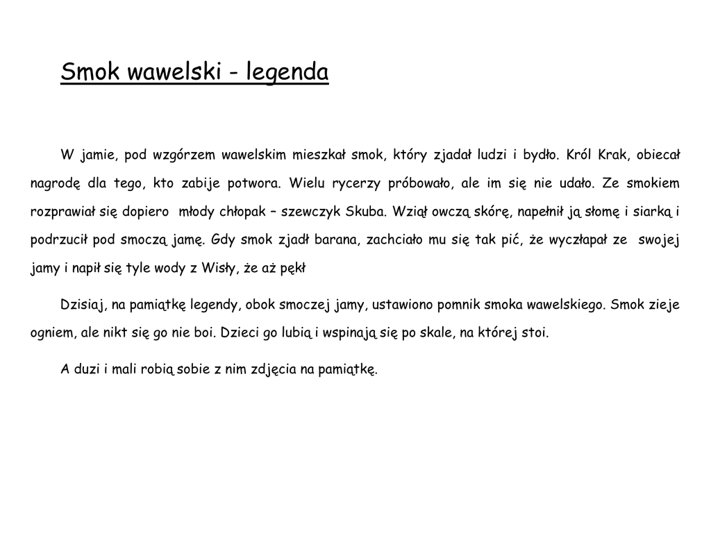 Smok wawelski - legenda W jamie, pod wzgórzem wawelskim mieszkał smok, który zjadał ludzi i bydło. Król Krak, obiecał nagrodę dla tego, kto zabije potwora. Wielu rycerzy próbowało, ale im się nie udało. Ze smokiem rozprawiał się dopiero młody chłopak – szewczyk Skuba. Wziął owczą skórę, napełnił ją słomę i siarką i podrzucił pod smoczą jamę. Gdy smok zjadł barana, zachciało mu się tak pić, że wyczłapał ze swojej jamy i napił się tyle wody z Wisły, że aż pękł Dzisiaj, na pamiątkę legendy, obok smoczej jamy, ustawiono pomnik smoka wawelskiego. Smok zieje ogniem, ale nikt się go nie boi. Dzieci go lubią i wspinają się po skale, na której stoi. A duzi i mali robią sobie z nim zdjęcia na pamiątkę. Wykorzystaj swoją wyobraźnię i pokoloruj smoka wawelskiego