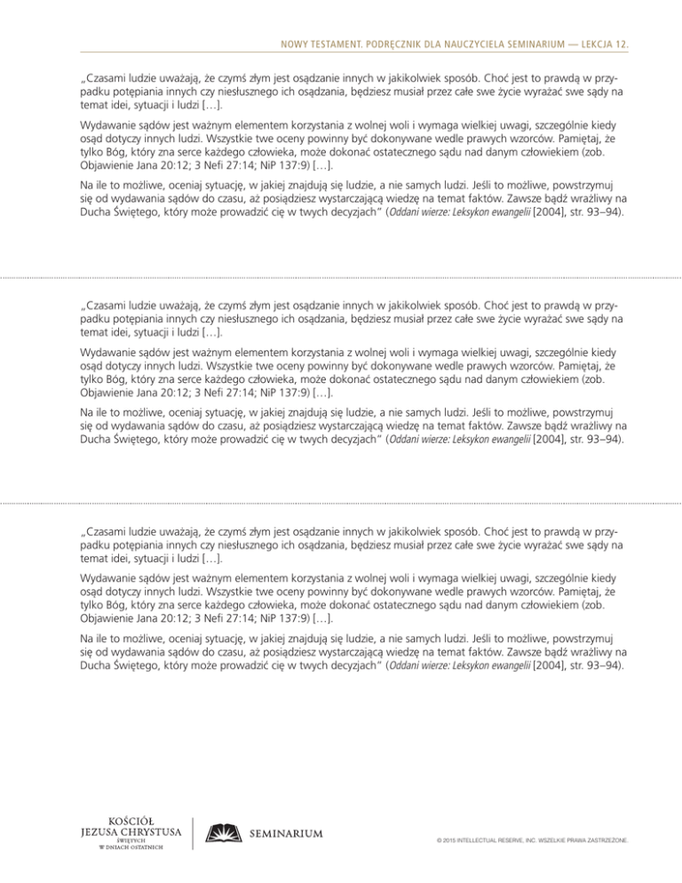 NOWY TESTAMENT. PODRĘCZNIK DLA NAUCZYCIELA SEMINARIUM — LEKCJA 12. „Czasami ludzie uważają, że czymś złym jest osądzanie innych w jakikolwiek sposób. Choć jest to prawdą w przypadku potępiania innych czy niesłusznego ich osądzania, będziesz musiał przez całe swe życie wyrażać swe sądy na temat idei, sytuacji i ludzi […]. Wydawanie sądów jest ważnym elementem korzystania z wolnej woli i wymaga wielkiej uwagi, szczególnie kiedy osąd dotyczy innych ludzi. Wszystkie twe oceny powinny być dokonywane wedle prawych wzorców. Pamiętaj, że tylko Bóg, który zna serce każdego człowieka, może dokonać ostatecznego sądu nad danym człowiekiem (zob. Objawienie Jana 20:12; 3 Nefi 27:14; NiP 137:9) […]. Na ile to możliwe, oceniaj sytuację, w jakiej znajdują się ludzie, a nie samych ludzi. Jeśli to możliwe, powstrzymuj się od wydawania sądów do czasu, aż posiądziesz wystarczającą wiedzę na temat faktów. Zawsze bądź wrażliwy na Ducha Świętego, który może prowadzić cię w twych decyzjach” (Oddani wierze: Leksykon ewangelii [2004], str. 93–94). „Czasami ludzie uważają, że czymś złym jest osądzanie innych w jakikolwiek sposób. Choć jest to prawdą w przypadku potępiania innych czy niesłusznego ich osądzania, będziesz musiał przez całe swe życie wyrażać swe sądy na temat idei, sytuacji i ludzi […]. Wydawanie sądów jest ważnym elementem korzystania z wolnej woli i wymaga wielkiej uwagi, szczególnie kiedy osąd dotyczy innych ludzi. Wszystkie twe oceny powinny być dokonywane wedle prawych wzorców. Pamiętaj, że tylko Bóg, który zna serce każdego człowieka, może dokonać ostatecznego sądu nad danym człowiekiem (zob. Objawienie Jana 20:12; 3 Nefi 27:14; NiP 137:9) […]. Na ile to możliwe, oceniaj sytuację, w jakiej znajdują się ludzie, a nie samych ludzi. Jeśli to możliwe, powstrzymuj się od wydawania sądów do czasu, aż posiądziesz wystarczającą wiedzę na temat faktów. Zawsze bądź wrażliwy na Ducha Świętego, który może prowadzić cię w twych decyzjach” (Oddani wierze: Leksykon ewangelii [2004], str. 93–94). „Czasami ludzie uważają, że czymś złym jest osądzanie innych w jakikolwiek sposób. Choć jest to prawdą w przypadku potępiania innych czy niesłusznego ich osądzania, będziesz musiał przez całe swe życie wyrażać swe sądy na temat idei, sytuacji i ludzi […]. Wydawanie sądów jest ważnym elementem korzystania z wolnej woli i wymaga wielkiej uwagi, szczególnie kiedy osąd dotyczy innych ludzi. Wszystkie twe oceny powinny być dokonywane wedle prawych wzorców. Pamiętaj, że tylko Bóg, który zna serce każdego człowieka, może dokonać ostatecznego sądu nad danym człowiekiem (zob. Objawienie Jana 20:12; 3 Nefi 27:14; NiP 137:9) […]. Na ile to możliwe, oceniaj sytuację, w jakiej znajdują się ludzie, a nie samych ludzi. Jeśli to możliwe, powstrzymuj się od wydawania sądów do czasu, aż posiądziesz wystarczającą wiedzę na temat faktów. Zawsze bądź wrażliwy na Ducha Świętego, który może prowadzić cię w twych decyzjach” (Oddani wierze: Leksykon ewangelii [2004], str. 93–94). © 2015 INTELLECTUAL RESERVE, INC. WSZELKIE PRAWA ZASTRZEŻONE.