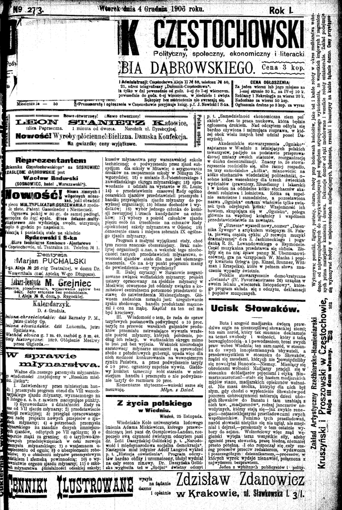 Wtorek Pólitybżny, społeczny, ekonomiczny i literabki Cena 3 kop. ■} Młesięczo je I Adiel.lstracjl: CzęetochowaAleja TI M 88, teleican M 60, 21, adres telegraflezay ikziónnik-Częsłoetóowa“-. ta tyike w dni jwwBzedtie od godż. 6-ej do 7-ej wieczorem, powszednie do gods, 6-ej wieczorem, w 'niedziele i święta Rękopisy bez zastrzeżenia nie swracąją sie|-'Pr6suoier«tę I ogłoszenia w Częstochowie przyjmuje księg. p.f. J. Nowicki i S-ka, 60 ■ew e stewerzeey! I L d G O -B T Ulica. Poprzeczna. H o w o ś e l i .m inuta od dworca. Niema zimnych! wilgotnych miesz kań, jeśli obsadzić ;cu MULTIPLIKATOR jGGRZEWAtilA.R medazłote. P a te n t Gasselseder i Niemeczek. Ogrzewa pokój w 30 sn. de samej podłogi, Eczędzt do »pata. glace żelazne imultyfclikäiorowe mie w ydzieiąją swędu, utrzym ują Itiepło 8 gottein po napaleniu, f e t e j ą i p ssiad ają s ta k n a składzie lowioś®! Rydteewski 1 S-ka Biura teehnierne Komisowo - Ajenturowe r Częstochowie, ul. Teatralna 13. Telefon % 1 . 3 D e n .t3 r@ fc a PUCWĄLSKJ 'iHP.ASeja J6 26>róg Teatralnej, w dom u Dr. _ W a ^ r t h a l a < n ^ A p te ^ JW -g o Długosza). M. Sfiejniec gLeettrue, plom bow & cie, w y jm o w an ie z ę b ó w Z«§by sz tu c z n e bez podniabienia. K a le n d a rz y k , D. 4 - Grudnia, Imiontz c h rze śc ia ń skie : dziś B arnaby P. M., je ś ro iia b b y Op. dziś Łubomiła, jutro Spsiisiawa. Wschód sło ń c a g. 7 m. 49, zachód g. 3 m. 48. |6 o ły historyczne: I$ t9 . Oblężenie Moskwy przez Olgierda. |V V Narożnik ul. Dyrekcyjnąj. # a gwiazdkę ceny wyjątkowe. F te ła r e z e w ita n te m Iziennika tizostochirwslihgo“ na SSSNOWEB IAEŁĘBE flĄBROaSKĘ jest W e c ł a w B a d m -sfc i (SOSNOWIEC, betel „Warszawski“). ilmiona sło w ia ń sk ie : p. t. „Samodzielność ekonom iczna ziem poi" sk ic h “ . Je st to praca naukowa, k tó ra będzie ogłoszoną drukiem . Nad odczytem odbyła się bardzo ożywiona i zajm ująca rozprawa, w któ rej obok wielu innych b rał udział poseł Da- JEŁatckwice, Wyroby tplóciennęlilielizna. Damska Konfekcja. =========== M ä fi-te iik ś;8ewo otwesxony! S m a tJ X r M S S F Z i s f^ p x -Ä W iz ie W ażne dlam aszego przem ysłu młynarskieI ? 1wiadomości .znajdujemy w „Russkóm mieli t e . S stk a« : i. Zatwierdzeny przez m inisterjum h an 1¾ " £ ZeHly^ dla VM w-szecheE° zjazdu m łynarzy, wyznaczonego na | $ lutego s. s. b. r. zawiera następujące punkty. 1) Sprawozdanie z działalności Rady za s o d VII zjazdu m łynarzy; 2) przedstawienie "'"ji rewizyjnej; 3) przegląd opracowanego radę projektu now ych przepisów o z jajach młynarzy; 4) o potrzebach przem yśla sk ieg o n a zasadzie danych zmniejszo1 zjazdów, odbytych po VII ogólnym; 5) o órcie m ąk i za g ran icy 6) o tiryfowo-krelówych przedsięwzięciach w celu rozwoju nyslu m łynarskiego; 7) o w zajem nem upieczeniu od ognia; 8) o ubezpieczeniu robo tów; 9) o obłożeniu m łynów przemysłowym latkiem i ziem ską powinnością; 10) o wyN nictw ie organu zjazdu młynarzy; 11) o sżkojn ły n arstw a (działalności odeskiejszkoły; CENA OGŁOSZENIA: Za jeden wiersz lub jego miejsce na I-szej stronie 30 k., na IT-ej 10 k. Reklamy 1 Nekrologja za wiersz 20 k, Nadesłane za wiersz 50 kop. Ogłoszenia drobne po S kop. za wyraz = = = = = = = Akadem ickie stow arzyszenie „Ognisko“ najstarsze w W iednia z istniejących polskich towarzystw, podjęło na podstawie przeprowa dzonej zm iany swoich statutów , reorganizację kursów m łynarstw a przy warszawskiej szkole w duchu decentralizacji. Znaczy to. że stow a techniczną); o podwyższeniu przez zjazd sub- rzyszenie rozdzieliło się, albo raczej rozpadło, sydjm n dla szkoły w Mitawie; o asygnowaniu na trzy samodzielne „k ó łk a“, mianowicie: n a środków na. zaopatrzenie szkoły w N iżnym Nowgorodzie); 12) o zmianie S.-Petersburskiego i kółko słuchaczów wiedeńskiej politechniki, o sobne kółke w szechnicy dla tizech św ieckich .zawdłżańskiego okręgu m łynarskiego; 13) spra wozdanie z udziału n a wystawie w S t. Louis; wydziałów (prawniczy, filozoficzny i lekarski) i w końcu na oddzielne kółko słuchaczów aka 14) o przedstawieniu czasowej Sady ogólno dem ii rolnictwa i. leśnictw a. Kółka są zupeł cesarskich zjazdów przedstawicieli przemysłu i nie samoistne i samodzielne, a pozostawiona handfci przystąpienia zjazdu m łynarzy do po nazwa „O gniska“ oznacza' właściwie tylko zwią wyższej organizacji; 15) bilans dochodów i wy zek tych odrębnych ^tółek: W zajem ność ich datków; 16) wybór jednego członka do komi sji rewizyjnej i:trze ch kandydatów na człon bowiem, skupiająca się w „Ognisku“, polega głównie na wspólnej książnicy i -wspólnem ków; 17) wybory z pośród członków zjazdu przedstaw icielstwie na zewnątrz. pięciu osób n a irzechlecie n a członaów Rady W „Strzesze“ wyszedł now y„num er“ „Dzien .opiekuńczej szkoły m łynarstw a w Odesie; 18) .»znaczenie czasu i m iejsca zebrania IX ogólne nika Żywego“ z artykułem wstępnym St. Kala ta, piewszą częścią cyklu: „0 rozwoju m uzyki go zjazdu m łynarzy. Program z m ałym i w yjątkam i stały, choć dram atycznej“ d-ra Z. Jachim eckiego i poga tym razem znacznie obszerniejszy. , Brak nale danką R. St. Lewandowskiego o Reymoncie. żytej organizacji u.nas, a w skutek tego nieobe Część m uzykalna przedstawia się obficie. Zło cności. naszych przedstawicieli m łynarstwa, o- żyły się n a nią; śpiew panny M. Ubermanowiwoeność zjazdów sta le dla n as jest ujemnego czównej, gra n a skrzypcach W. Macha, i popi znaczenia. Co n a 6-ty punkt program u mamy sy kw artetu G rieg'a (pp. Kinzel, B runner, W itb m an i Krzepelka), które w pełnem słowa zn a do powiedzienia—czy wypełniony? II. Balej czytamy: w Saratowie zorgani czeniu wypadły świetnie. Polskie stowarzyszenie dem okratyczne zowano związek wołżańskich młynarzy; projekt ustaw y o