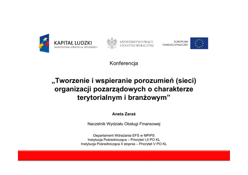 Konferencja „Tworzenie i wspieranie porozumień (sieci) organizacji i ji pozarządowych d h o charakterze h kt terytorialnym i branżowym” Aneta Zaraś Naczelnik Wydziału Obsługi Finansowej Departament Wdrażania EFS w MPiPS Instytucja Pośrednicząca – Priorytet I,II PO KL Instytucja Pośrednicząca II stopnia – Priorytet V PO KL Podstawowe zasady konstruowania budżetu W ramach PO KL Wnioskodawca p przedstawia zakładane kosztyy projektu we wniosku o dofinansowanie projektu w formie budżetu zadaniowego. Dodatkowo wykazuje w załączniku do wniosku o dofinansowanie „Szczegółowy Szczegółowy budżet budżet” ze wskazaniem kosztów jednostkowych, który stanowi podstawę do oceny kwalifikowalności wydatków projektu na etapie oceny merytorycznej wniosku o dofinansowanie projektu. Podział kosztów W ramach budżetu zadaniowego Wnioskodawca dokonuje podziału kosztów na: • koszty bezpośrednie (tj. koszty kwalifikowalne poszczególnych zadań realizowanych przez beneficjenta w ramach projektu, które są bezpośrednio związane z tymi zadaniami) • koszty pośrednie (tj. (tj koszty związane z obsługą techniczną projektu, których nie można bezpośrednio przyporządkować do konkretnego zadania realizowanego w ramach projektu) Przykłady kosztów bezpośrednich W ramach kosztów bezpośrednich Wnioskodawca wykazuje we wniosku o dofinansowanie rodzaje zadań w ramach projektu. projektu W przypadku większości projektów, beneficjent jako zadanie będzie wykazywać np. „zarządzanie projektem”. W zadaniu tym mogą być uwzględniane w szczególności koszty wynagrodzenia koordynatora/ ki kierownika ik projektu j kt llub b iinnejj osoby b mającej j j za zadanie d i koordynowanie lub zarządzanie projektem, koszty wynagrodzenia innego personelu bezpośrednio zaangażowanego w realizację projektu (np. specjalista ds. zamówień publicznych, pracownik ds. obsługi finansowej projektu, pracownik ds. monitorowania projektu, itp.). Przykłady kosztów bezpośrednich cd. cd Koszty związane K i z otworzeniem i i prowadzeniem d i rachunku h k b bankowego, k ustanowieniem zabezpieczeń prawidłowej realizacji umowy, koszty związane z zakupem lub amortyzacją sprzętu niezbędnego do zarządzania projektem i inne koszty bezpośrednio związane z koordynacją i zarządzaniem projektem. Kolejnym, przykładowym zadaniem może być „promocja projektu”, w ramach h ttego zadania d i można ż wskazać k ć następujące t j kkoszty: t zakup k materiałów promocyjnych i informacyjnych, opracowanie i utrzymanie strony internetowej internetowej, koszty ogłoszeń prasowych prasowych, koszty wynagrodzenia pracownika odpowiedzialnego za promocję projektu (o ile zaistnieje taka potrzeba), itp. Przykładowy katalog zadań w ramach projektów: • • • • • • • • • zarządzanie projektem promocja projektu szkolenia rozwój systemów informatycznych ekspertyzy analizy li badania przygotowanie publikacji ewaluacja Budżet zadaniowy • Kwoty y wykazywane y y w budżecie zadaniowym y zawartym y w części ę IV wzoru wniosku o dofinansowanie realizacji projektu powinny wynikać ze szczegółowego budżetu zawartego w załączniku do wniosku o dofinansowanie realizacji projektu. • Budżet szczegółowy wskazuje poszczególne koszty jednostkowe związane z realizacją odpowiednich zadań i jest podstawą do oceny kwalifikowalności wydatków projektu na etapie weryfikacji wniosku o dofinansowanie projektu. Stopień uszczegółowienia budżetu powinien dokładnie określać p p planowane wydatki y w ramach zadań. Budżet zadaniowy cd. cd • Wp przypadku, yp g gdy y beneficjent j zakłada zlecanie p pewnych y usług g w ramach projektu, powinien zawrzeć odpowiednie zapisy we wniosku o dofinansowanie realizacji projektu. W przeciwnym razie, wydatki poniesione na realizację zleconych usług przez wykonawcę mogą zostać uznane za niekwalifikowalne na etapie rozliczania projektu. • Przykład budżetu zadaniowego stanowi załącznik nr 9 do dokumentacji konkursowej dla Poddziałania 5.4.2 - Rozwój dialogu y g obywatelskiego. Koszty pośrednie • • Koszty pośrednie stanowią koszty związane z obsługą techniczną projektu, których nie można bezpośrednio przyporządkować do konkretnego zadania. K t l kkosztów Katalog tó pośrednich ś d i h jjestt zamknięty. k i t Koszty pośrednie cd cd. Koszty pośrednie mogą obejmować wyłącznie następujące koszty administracyjne związane z obsługą techniczną projektu: • koszty zarządu • koszty personelu obsługowego • koszty obsługi księgowej • opłaty ł t za najem j powierzchni i h i bi biurowych h llub b czynsz • opłaty administracyjne Koszty pośrednie cd cd. • • • • • • • amortyzacja środków trwałych (np (np. budynku) usługi pocztowe, telefoniczne, telegraficzne, teleksowe, internetowe, kurierskie usługi kserograficzne koszty materiałów biurowych i artykułów piśmienniczych nie związanych bezpośrednio z realizacją zadań w projekcie koszty ubezpieczeń majątkowych koszty ochrony sprzątanie pomieszczeń Koszty pośrednie cd cd. • W ramach kosztów pośrednich nie są wykazywane żadne wydatki objęte cross-financingiem w projekcie, bowiem wydatki w ramach crossfinancingu mogą dotyczyć wyłącznie konkretnych zadań w ramach projektu, a więc są wykazywane jako wydatki bezpośrednie. • Beneficjent ma obowiązek przedstawienia w załączniku do wniosku o dofinansowanie realizacji projektu (w szczegółowym budżecie projektu) uzasadnienia dla wykazanej we wniosku o dofinansowanie wartości kosztów pośrednich, które zamierza w projekcie rozliczyć. Uzasadnienie powinno wskazywać metodologię, zgodnie z którą beneficjent wyliczył wartość kosztów pośrednich. Metodologia wyliczania kosztów pośrednich podlega weryfikacji na etapie oceny merytorycznej wniosku o dofinansowanie realizacji projektu. Koszty pośrednie cd cd. Koszty pośrednie mogą być