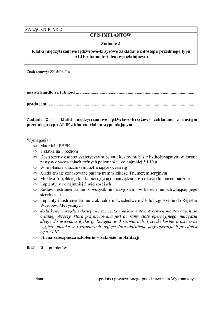 ZAŁĄCZNIK NR 2 OPIS IMPLANTÓW Zadanie 2 Klatki międzytrzonowe lędźwiowo-krzyżowe zakładane z dostępu przedniego typu ALIF z biomateriałem wypełniającym Znak sprawy: Z/15/PN/16 nazwa handlowa lub kod .......................................................................................................... producent ................................................................................................................................... Zadanie 2 – klatki międzytrzonowe lędźwiowo-krzyżowe zakładane z dostępu przedniego typu ALIF z biomateriałem wypełniającym Wymagania : • Materiał : PEEK • 1 klatka na 1 poziom • Dostarczany osobno syntetyczny substytut kostny na bazie hydroksyapatytu w formie pasty w opakowaniach różnych pojemności co najmniej 5 i 10 g. • W implancie znaczniki umożliwiające ocena rtg • Klatki trwale oznakowane parametrem wielkości i numerem seryjnym • Możliwość aplikacji klatki mocując ją do narzędzia pośrodkowo lub nieco bocznie • Implanty w co najmniej 3 wielkościach • Zestaw instrumentarium z wszystkimi narzędziami w kasecie umożliwiającej jego sterylizację • Implanty i instrumentarium z aktualnym świadectwem CE lub zgłoszenie do Rejestru Wyrobów Medycznych • dodatkowe narzędzia dostępowe tj.: zestaw haków automatycznych montowanych do owalnej obręczy, która przymocowana jest do ramy stołu operacyjnego, narzędzia długie do usuwania dysku tj. Rongeur w 3 rozmiarach, łyżeczki kostne proste oraz wygięte, punche w 3 rozmiarach, dające duże ułatwienie przy operacjach przednich typu ALIF • Firma zabezpiecza szkolenie w zakresie implantacji Ilość – 30 kompletów ............ data ................................................................. podpis upoważnionego przedstawiciela Wykonawcy 1 ZAŁĄCZNIK NR 2 OPIS IMPLANTÓW Zadanie 4 Polisacharydowy hemostatyk proszkowy Znak sprawy: Z/15/PN/16 nazwa handlowa lub kod .......................................................................................................... producent .................................................................................................................................... Zadanie 4 - polisacharydowy hemostatyk proszkowy Możliwość aplikowania strzykawką bezpośrednio na tkankę mózgową czy rdzeń kręgowy po zabiegach neurochirurgicznych . Opakowania sterylne, różnej objętości , do wyboru zamawiającego. Opakowania po 3,0 g. Ilość – 5 opakowań. ........... data ................................................................. podpis upoważnionego przedstawiciela Wykonawcy 2 ZAŁĄCZNIK NR 2 OPIS Zadanie 7 Proteza tkana Znak sprawy: Z/15/PN/16 nazwa handlowa lub kod ........................................................................................................................ producent ................................................................................................................................................. Zadanie 7 - Proteza tkana Wymagania: Proteza tkana, powlekana żelatyną wchłanianą na drodze hydrolizy, o współczynniku przepuszczalności poniżej 1 ml/cmٰ3/min o średnicy 24-34mm. Proteza tkana z rozszerzeniem u podstawy imitującym zatokę Valsalvy. Ilość: 40 sztuk ............ data ................................................................. podpis upoważnionego przedstawiciela Wykonawcy 3 ZAŁĄCZNIK NR 2 OPIS Zadanie 8 Klatki międzytrzonowe typu ALIF ze śrubami z wypełnieniem Znak sprawy: Z/15/PN/16 nazwa handlowa lub kod ........................................................................................................................ producent ................................................................................................................................................. Zadanie 8 - Klatki międzytrzonowe typu ALIF ze śrubami z wypełnieniem Wymagania: - zestaw do stabilizacji międzytrzonowej kręgosłupa w odcinku lędźwiowo-krzyżowym (L2-S1) w technice ALIF, - materiał PEEK, - dodatkowa stabilizacja klatki w przestrzeni międzytrzonowej za pomocą dodatkowej fiksacji śrubowej (śruba kostna), 3 śruby kostne są wprowadzane do trzonów pod kątem 45 stopni w płaszczyźnie strzałkowej, - klatka występuje w dwóch rodzajach nachylenia lordotycznego – 8 stopni i 12 stopni, - klatka występuje w trzech rodzajach wymiarów, - wysokość klatki wynosi od 10 mm do 20 mm ze skokiem co 2 mm, - klatka posiada dodatkowe zabezpieczenie przed samoczynnym wysunięciem się śrub z klatki, - klatka posiada bardzo dużą przestrzeń do wypełnienia wiórem kostnym lub substytutem kostnym w formie granulatu (15% hydroksyapatytu i 85 % beta trójwapnianu fosforu). Ilość: 20 sztuk ............ data ................................................................. podpis upoważnionego przedstawiciela Wykonawcy 4