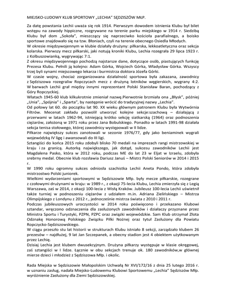 MIEJSKO-LUDOWY KLUB SPORTOWY „LECHIA” SĘDZISZÓW MŁP. Za datę powstania Lechii uważa się rok 1914. Pierwszym dowodem istnienia Klubu był bilet wstępu na zawody hippiczne, rozgrywane na terenie parku miejskiego w 1914 r. Siedzibą Klubu był dom „Sokoła”, mieszczący się naprzeciwko kościoła parafialnego, a boisko sportowe znajdowało się na tzw. Błoniach, czyli na terenie obecnego Osiedla Młodych. W okresie międzywojennym w klubie działały drużyny: piłkarska, lekkoatletyczna oraz sekcja kolarska. Pierwszy mecz piłkarski, jaki notują kroniki Klubu, Lechia rozegrała 29 lipca 1923 r. z Kolbuszowianką, wygrywając 7:1. Z okresu międzywojennego pochodzą najstarsze dane, dotyczące osób, piastujących funkcję Prezesa Klubu. Pełnili ją kolejno: Adam Górka, Wojciech Górka, Władysław Górka. Wszyscy trzej byli synami miejscowego lekarza i burmistrza doktora Józefa Górki. W czasie wojny, chociaż zorganizowana działalnośd sportowa była zakazana, zawodnicy z Sędziszowa rozegraliw Ropczycach mecz z drużyną lotników węgierskich, wygrany 4:2. W barwach Lechii grał między innymi reprezentant Polski Stanisław Baran, pochodzący z Góry Ropczyckiej. Wlatach 1945-60 klub kilkukrotnie zmieniał nazwę.Pierwotnie brzmiała ona „Błysk”, później „Unia”, „Spójnia” i „Sparta”, by następnie wrócid do tradycyjnej nazwy „Lechia”. Od połowy lat 60. do początku lat 90. XX wieku głównym patronem Klubu była Wytwórnia Filtrów. Mecenat zakładu pozwolił utworzyd kolejne sekcje:szachową – działającą z przerwami w latach 1962-94, istniejącą krótko sekcję siatkarską (1964) oraz podnoszenia ciężarów, założoną w 1971 roku przez Jana Bobulskiego. Ponadto w latach 1991-98 działała sekcja tenisa stołowego, której zawodnicy występowali w II lidze. Piłkarze największy sukces zanotowali w sezonie 1976/77, gdy jako beniaminek wygrali wojewódzką IV ligę i awansowali do III ligi. Sztangiści do kooca 2015 roku zdobyli blisko 70 medali na imprezach rangi mistrzowskiej w kraju i za granicą. Autorką największego, jak dotąd, sukcesu zawodników Lechii jest Magdalena Pasko, która w 2012 roku, podczas ME do lat 23 w Eljat w Izraelu, zdobyła srebrny medal. Obecnie klub rozsławia Dariusz Januś – Mistrz Polski Seniorów w 2014 i 2015 r. W 1990 roku ogromny sukces odniosła szachistka Lechii Aneta Pondo, która zdobyła mistrzostwo Polski juniorek. Wielkimi wydarzeniami sportowymi w Sędziszowie Młp. były mecze piłkarskie, rozegrane z czołowymi drużynami w kraju: w 1989 r., z okazji 75-lecia Klubu, Lechia zmierzyła się z Legią Warszawa, zaś w 2014, z okazji 100-lecia z Wisłą Kraków. Jubileusz 100-lecia Lechii uświetnił także turniej w podnoszeniu ciężarów z udziałem m.in. Adriana Zielioskiego – Mistrza Olimpijskiego z Londynu z 2012 r., jednocześnie mistrza świata z 2010 i 2011 r. Podczas jubileuszowych uroczystości w 2014 roku poświęcono i przekazano Klubowi sztandar, wręczono odznaczenia dla zasłużonych zawodników i działaczy przyznane przez Ministra Sportu i Turystyki, PZPN, PZPC oraz związki wojewódzkie. Sam Klub otrzymał Złota Odznakę Honorową Polskiego Związku Piłki Nożnej oraz tytuł Zasłużony dla Powiatu Ropczycko-Sędziszowskiego. W ciągu przeszło stu lat historii w strukturach Klubu istniało 8 sekcji, zarządzało klubem 26 prezesów – najdłużej, 9 lat Jan Szczepanek, a obecny stadion jest 4 obiektem użytkowanym przez Lechię. Dzisiaj Lechia jest klubem dwusekcyjnym. Drużyna piłkarzy występuje w klasie okręgowej, zaś sztangiści w I lidze. Łącznie w obu sekcjach trenuje ok. 180 zawodników,w głównej mierze dzieci i młodzież z Sędziszowa Młp. i okolic. Rada Miejska w Sędziszowie Małopolskim Uchwałą Nr XVI/172/16 z dnia 25 lutego 2016 r. w uznaniu zasług, nadała Miejsko-Ludowemu Klubowi Sportowemu „Lechia” Sędziszów Młp. wyróżnienie Zasłużony dla Ziemi Sędziszowskiej.