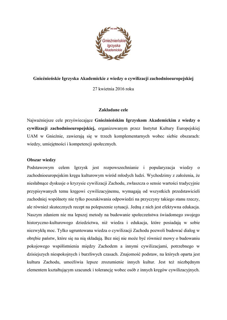 Gnieźnieńskie Igrzyska Akademickie z wiedzy o cywilizacji zachodnioeuropejskiej 27 kwietnia 2016 roku Zakładane cele Najważniejsze cele przyświecające Gnieźnieńskim Igrzyskom Akademickim z wiedzy o cywilizacji zachodnioeuropejskiej, organizowanym przez Instytut Kultury Europejskiej UAM w Gnieźnie, zawierają się w trzech komplementarnych wobec siebie obszarach: wiedzy, umiejętności i kompetencji społecznych. Obszar wiedzy Podstawowym celem Igrzysk jest rozpowszechnianie i popularyzacja wiedzy o zachodnioeuropejskim kręgu kulturowym wśród młodych ludzi. Wychodzimy z założenia, że niesłabnące dyskusje o kryzysie cywilizacji Zachodu, zwłaszcza o sensie wartości tradycyjnie przypisywanych temu kręgowi cywilizacyjnemu, wymagają od wszystkich przedstawicieli zachodniej wspólnoty nie tylko poszukiwania odpowiedzi na przyczyny takiego stanu rzeczy, ale również skutecznych recept na polepszenie sytuacji. Jedną z nich jest efektywna edukacja. Naszym zdaniem nie ma lepszej metody na budowanie społeczeństwa świadomego swojego historyczno-kulturowego dziedzictwa, niż wiedza i edukacja, które posiadają w sobie niezwykłą moc. Tylko ugruntowana wiedza o cywilizacji Zachodu pozwoli budować dialog w obrębie państw, które się na nią składają. Bez niej nie może być również mowy o budowaniu pokojowego współistnienia między Zachodem a innymi cywilizacjami, potrzebnego w dzisiejszych niespokojnych i burzliwych czasach. Znajomość podstaw, na których oparta jest kultura Zachodu, umożliwia lepsze zrozumienie innych kultur. Jest też niezbędnym elementem kształtującym szacunek i tolerancję wobec osób z innych kręgów cywilizacyjnych. Obszar umiejętności W trakcie przygotowań do Igrzysk uczniowie będą nabywać konkretnych umiejętności polegających między innymi na syntetycznym przyswajaniu materiału z podręczników do historii i wiedzy o społeczeństwie z zakresu szkoły średniej (wiedza rozszerzona) i z zalecanej przez organizatora literatury uzupełniającej (dla chętnych). W trakcie przyswajania wiedzy będą również kształtowali umiejętność myślenia przyczynowo-skutkowego, wyciągania konstruktywnych wniosków, stawiania pytań, selekcji materiału oraz interpretacji. Mając na uwadze fakt, że przedmiotem Igrzysk będzie cywilizacja państw konstytuujących Zachód, ich historia, kultura, wzajemne relacje oraz kontakty z innymi cywilizacjami, zakładamy, że wiedza zdobyta w tracie przygotowań do Igrzysk pomoże uczniom określić miejsce Zachodu na współczesnej kulturowej mapie świata. Wszystkie zdobyte umiejętności okażą się przydatne do definiowania swojej tożsamości i określenia się wobec osób z innych kręgów cywilizacyjnych. Obszar kompetencji społecznych Poprzez uczestnictwo w Igrzyskach uczniowie nabędą szereg kompetencji społecznych, które okażą się przydatne w przyszłości. Będą rozumieli konieczność ciągłego pogłębiania swojej wiedzy z zakresu cywilizacji zachodnioeuropejskiej, będą otwarci na uczestnictwo w inicjatywach o podobnym charakterze, w ramach różnego rodzaju olimpiad, turniejów, quizów i spotkań oraz nauczą się zdrowego współzawodnictwa opartego na szacunku wobec drugiego człowieka i jasno sprecyzowanych zasadach. Będą świadomi swojej wiedzy o zachodnioeuropejskim kręgu kulturowym i konieczności jej promowania w celu budowania lepszego świata. Tylko świadomość własnej przeszłości prowadzi do lepszego rozumienia współczesności. Tematyka • Cywilizacja grecka • Cywilizacja rzymska • Dziedzictwo antyku • Rozwój chrześcijaństwa na Zachodzie • Europa w okresie krucjat • Kultura średniowiecznej Europy • Odkrycia geograficzne i kolonializm europejski • Humanizm i renesans • Reformacja i kontrreformacja • Rewolucja francuska i Oświecenie • Ideologie XIX i XX wieku 2 • Rozwój cywilizacji przemysłowej • Wojny w Europie w XX wieku • Integracja europejska (Unia Europejska i NATO) Literatura Pytania składające się na test z wiedzy o cywilizacji zachodnioeuropejskiej zostaną przygotowane na bazie podręczników do historii i wiedzy o społeczeństwie z zakresu szkoły średniej (wiedza rozszerzona). Dla chętnych zaleca się następującą literaturę uzupełniającą: - Leszek Mrozewicz, Historia powszechna. Starożytność, Poznań 1999 i n. - Jerzy Strzelczyk, Historia powszechna. Średniowiecze, Poznań 2001 i n. - Maciej Serwański, Historia powszechna. Wiek XVI-XVIII, Poznań 2001 i n. - Waldemar Łazuga, Historia powszechna. Wiek XIX, Poznań 1999 i n. - Tomasz Schramm, Historia powszechna. Wiek XX, Poznań 1999 i n. Organizator: Instytut Kultury Europejskiej Uniwersytetu im. Adama Mickiewicza w Poznaniu z siedzibą w Gnieźnie Komitet Naukowy Igrzysk prof. zw. dr hab. Leszek Mrozewicz prof. zw. dr hab. Zbigniew Sareło prof. zw. dr hab. Janusz Karwat - przewodniczący prof. UAM dr hab. Marek Kaźmierczak prof. UAM dr hab. Filip Kubiaczyk prof. UAM dr hab. Leszek Wetesko Koordynator Igrzysk – prof. UAM dr hab. Filip Kubiaczyk [email protected] Sekretarz - dr Monika Kubiaczyk [email protected] Adres Instytut Kultury Europejskiej UAM ul. Kostrzewskiego 5-7 62-200 Gniezno Tel. 61 829 4800; fax. 61 829 4802 E-mail: sekr-ike(@)amu.edu.pl 3