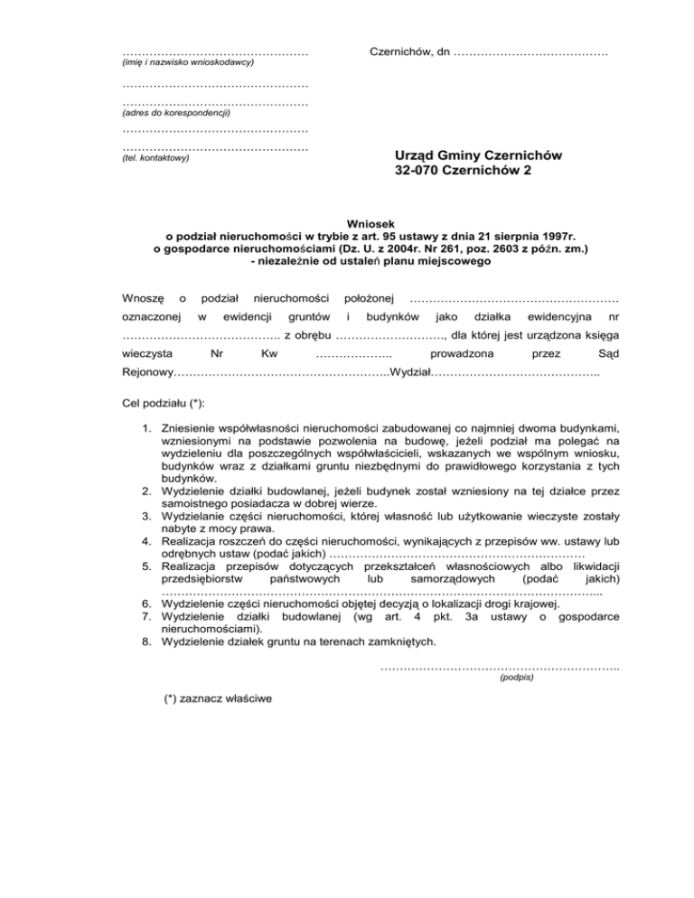 ………………………………………… Czernichów, dn …………………………………. (imię i nazwisko wnioskodawcy) ………………………………………… ………………………………………… (adres do korespondencji) ………………………………………… ………………………………………… Urząd Gminy Czernichów 32-070 Czernichów 2 (tel. kontaktowy) Wniosek o podział nieruchomości w trybie z art. 95 ustawy z dnia 21 sierpnia 1997r. o gospodarce nieruchomościami (Dz. U. z 2004r. Nr 261, poz. 2603 z późn. zm.) - niezaleŜnie od ustaleń planu miejscowego Wnoszę o oznaczonej podział w nieruchomości ewidencji gruntów połoŜonej i ……………………………………………… budynków jako działka ewidencyjna nr ………………………………….. z obrębu ………………………., dla której jest urządzona księga wieczysta Nr Kw ……………….. prowadzona przez Sąd Rejonowy………………………………………………..Wydział…………………………………….. Cel podziału (*): 1. Zniesienie współwłasności nieruchomości zabudowanej co najmniej dwoma budynkami, wzniesionymi na podstawie pozwolenia na budowę, jeŜeli podział ma polegać na wydzieleniu dla poszczególnych współwłaścicieli, wskazanych we wspólnym wniosku, budynków wraz z działkami gruntu niezbędnymi do prawidłowego korzystania z tych budynków. 2. Wydzielenie działki budowlanej, jeŜeli budynek został wzniesiony na tej działce przez samoistnego posiadacza w dobrej wierze. 3. Wydzielanie części nieruchomości, której własność lub uŜytkowanie wieczyste zostały nabyte z mocy prawa. 4. Realizacja roszczeń do części nieruchomości, wynikających z przepisów ww. ustawy lub odrębnych ustaw (podać jakich) ………………………………………………………… 5. Realizacja przepisów dotyczących przekształceń własnościowych albo likwidacji przedsiębiorstw państwowych lub samorządowych (podać jakich) …………………………………………………………………………………………………... 6. Wydzielenie części nieruchomości objętej decyzją o lokalizacji drogi krajowej. 7. Wydzielenie działki budowlanej (wg art. 4 pkt. 3a ustawy o gospodarce nieruchomościami). 8. Wydzielenie działek gruntu na terenach zamkniętych. …………………………………………………….. (podpis) (*) zaznacz właściwe Załączniki(*): 1. Aktualny (max 3 miesiące) oryginał odpisu z księgi wieczystej Kw lub inny dokument stwierdzający tytuł prawny do nieruchomości, np. akt własności ziemi. 2. Rzuty poziome ścian-oddzieleń przeciwpoŜarowych lub opinia osoby posiadającej uprawnienia budowlane w przypadku podziału gruntu wraz z budynkiem, 3. Protokół przyjęcia granic nieruchomości. 4. Wykaz zmian gruntowych. 5. Wykaz synchronizacyjny, jeŜeli oznaczenie działek gruntu jest inne niŜ w księdze wieczystej. 6. Pozwolenie na budowę w przypadku celu „1”. 7. Opinia potwierdzająca, Ŝe projektowane do wydzielenia działki spełniają wymogi przewidziane w ustawie z 21 sierpnia 1997r. o gospodarce nieruchomościami w przypadku celu „1”. 8. Mapa z projektem podziału numer ewidencyjny ………………………………….. ilość egzemplarzy ……………………………….. . 9. Aktualny odpis z właściwego rejestru (dla osób innych niŜ osoby fizyczne). (*) zaznacz właściwe Nie przedłoŜenie Ŝądanych dokumentów spowoduje pozostawienie wniosku bez rozpatrzenia Druk: GK-11-03/z.1, , KI: I-02-07-01/2