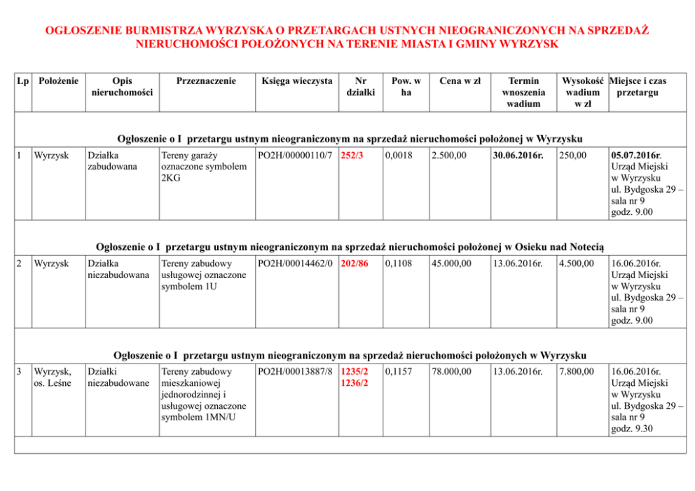 OGŁOSZENIE BURMISTRZA WYRZYSKA O PRZETARGACH USTNYCH NIEOGRANICZONYCH NA SPRZEDAŻ NIERUCHOMOŚCI POŁOŻONYCH NA TERENIE MIASTA I GMINY WYRZYSK Lp Położenie Opis nieruchomości Przeznaczenie Księga wieczysta Nr działki Pow. w ha Cena w zł Termin wnoszenia wadium Wysokość Miejsce i czas wadium przetargu w zł Ogłoszenie o I przetargu ustnym nieograniczonym na sprzedaż nieruchomości położonej w Wyrzysku 1 Wyrzysk Działka zabudowana Tereny garaży oznaczone symbolem 2KG PO2H/00000110/7 252/3 0,0018 2.500,00 30.06.2016r. 250,00 05.07.2016r. Urząd Miejski w Wyrzysku ul. Bydgoska 29 – sala nr 9 godz. 9.00 Ogłoszenie o I przetargu ustnym nieograniczonym na sprzedaż nieruchomości położonej w Osieku nad Notecią 2 Wyrzysk Działka niezabudowana Tereny zabudowy usługowej oznaczone symbolem 1U PO2H/00014462/0 202/86 0,1108 45.000,00 13.06.2016r. 4.500,00 16.06.2016r. Urząd Miejski w Wyrzysku ul. Bydgoska 29 – sala nr 9 godz. 9.00 Ogłoszenie o I przetargu ustnym nieograniczonym na sprzedaż nieruchomości położonych w Wyrzysku 3 Wyrzysk, os. Leśne Działki niezabudowane Tereny zabudowy mieszkaniowej jednorodzinnej i usługowej oznaczone symbolem 1MN/U PO2H/00013887/8 1235/2 1236/2 0,1157 78.000,00 13.06.2016r. 7.800,00 16.06.2016r. Urząd Miejski w Wyrzysku ul. Bydgoska 29 – sala nr 9 godz. 9.30 Ogłoszenie o I przetargu ustnym nieograniczonym na sprzedaż nieruchomości położonej w Wyrzysku 4 Wyrzysk, os. Leśne Działki niezabudowane Tereny zabudowy mieszkaniowej jednorodzinnej i usługowej oznaczone symbolem 1MN/U PO2H/00013887/8 1235/1 0,0858 65.000,00 13.06.2016r. 6.500,00 16.06.2016r. Urząd Miejski w Wyrzysku ul. Bydgoska 29 – sala nr 9 godz. 10.00 Ogłoszenie o I przetargu ustnym nieograniczonym na sprzedaż nieruchomości położonej w Wyrzysku 5 Wyrzysk, os. Leśne Działki niezabudowane Tereny zabudowy mieszkaniowej jednorodzinnej i usługowej oznaczone symbolem 1MN/U PO2H/00013887/8 1117 0,0250 25.000,00 13.06.2016r. 2.500,00 16.06.2016r. Urząd Miejski w Wyrzysku ul. Bydgoska 29 – sala nr 9 godz. 10.30 I. Pozycja 1 tabeli I. Przedmiotem sprzedaży jest działka położona w Wyrzysku, zabudowana budynkiem garażowym. Nakłady poniesione na garaż nie zostały sfinansowane z budżetu Gminy Wyrzysk. Na nabywcę nieruchomości może zostać nałożony obowiązek rozliczenia się z nakładów poniesionych na budynek garażowy przez osoby trzecie, jeżeli osoby te z takim żądaniem przeciwko nabywcy wystąpią. II. Nieruchomość obciążona jest umową najmu zawartą na czas oznaczony do dnia 31.12.2017r. Nabywca nieruchomości wejdzie w prawa i obowiązki wynajmującego. II. Pozycja 2 tabeli Przedmiotem sprzedaży jest działka położona w Osieku nad Notecią przy ul. Kasztanowej w sąsiedztwie zabudowy mieszkalno – usługowej. Nieruchomość ma nieregularny kształt i wymaga niwelacji. Na działce zlokalizowane są słupy energetyczne oraz sieć wysokiego napięcia. Obciążenia, ograniczenia, zobowiązania, których przedmiotem jest nieruchomość: nie występują. III. Pozycja 3-5 tabeli Przedmiotem sprzedaży są nieruchomości położone w Wyrzysku na osiedlu Leśnym. Nieruchomości znajdują się w sąsiedztwie zabudowy mieszkaniowej. Obciążenia, ograniczenia, zobowiązania, których przedmiotem są nieruchomość: nie występują. IV. Warunkiem uczestniczenia w przetargach jest wpłacenie wadium w wysokości i terminie wskazanym w tabeli na podane poniżej konto (liczy się data uznania kwoty przez bank na rachunku gminy): Nadnotecki Bank Spółdzielczy: 63 8937 0007 0000 1906 2000 0060. Wadium wpłacone przez uczestnika przetargu, który wygrał przetarg zalicza się na poczet ceny nabycia nieruchomości. Pozostałym uczestnikom przetargu wadium zwraca się niezwłocznie po zamknięciu przetargu jednak nie później niż przed upływem 3 dni od dnia jego zamknięcia. Jeżeli osoba ustalona jako nabywca nieruchomości nie przystąpi bez usprawiedliwienia do zawarcia umowy w miejscu i w terminie podanym w zawiadomieniu, organizator przetargu może odstąpić od zawarcia umowy, a wpłacone wadium nie podlega zwrotowi. W dniu przetargu należy przedłożyć Komisji Przetargowej: osoby fizyczne: dowód wpłaty wadium, dowód osobisty, osoby prawne :poświadczony aktualny wypis z Krajowego Rejestru Sądowego, osoba – osoby upoważnione w Krajowym Rejestrze Sądowym do składania oświadczeń woli w zakresie praw i obowiązków majątkowych, powinny przedłożyć dowód osobisty lub inny dokument ze zdjęciem potwierdzający tożsamość, cudzoziemcy : oprócz dokumentów wymienionych w ppkt a i b promesę na nabycie nieruchomości. Bliższe informacje o przetargu można uzyskać w Urzędzie Miejskim w Wyrzysku pok. nr 27, telefon: 067 28626-40, 286 41-18 lub 286 41 20.