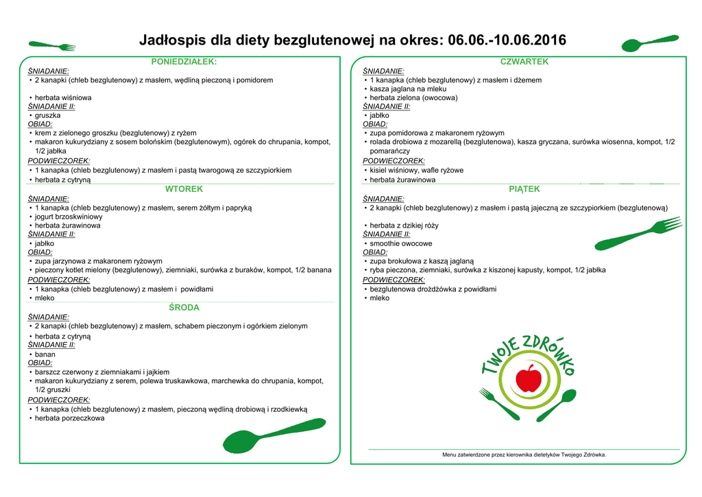 Jadłospis dla diety bezglutenowej na okres: 06.06.-10.06.2016 PONIEDZIAŁEK: ŚNIADANIE: • 2 kanapki (chleb bezglutenowy) z masłem, wędliną pieczoną i pomidorem • herbata wiśniowa ŚNIADANIE II: • gruszka OBIAD: • krem z zielonego groszku (bezglutenowy) z ryżem • makaron kukurydziany z sosem bolońskim (bezglutenowym), ogórek do chrupania, kompot, 1/2 jabłka PODWIECZOREK: • 1 kanapka (chleb bezglutenowy) z masłem i pastą twarogową ze szczypiorkiem • herbata z cytryną WTOREK ŚNIADANIE: • 1 kanapka (chleb bezglutenowy) z masłem, serem żółtym i papryką • jogurt brzoskwiniowy • herbata żurawinowa ŚNIADANIE II: • jabłko OBIAD: • zupa jarzynowa z makaronem ryżowym • pieczony kotlet mielony (bezglutenowy), ziemniaki, surówka z buraków, kompot, 1/2 banana PODWIECZOREK: • 1 kanapka (chleb bezglutenowy) z masłem i powidłami • mleko CZWARTEK ŚNIADANIE: • 1 kanapka (chleb bezglutenowy) z masłem i dżemem • kasza jaglana na mleku • herbata zielona (owocowa) ŚNIADANIE II: • jabłko OBIAD: • zupa pomidorowa z makaronem ryżowym • rolada drobiowa z mozarellą (bezglutenowa), kasza gryczana, surówka wiosenna, kompot, 1/2 pomarańczy PODWIECZOREK: • kisiel wiśniowy, wafle ryżowe • herbata żurawinowa PIĄTEK ŚNIADANIE: • 2 kanapki (chleb bezglutenowy) z masłem i pastą jajeczną ze szczypiorkiem (bezglutenową) • herbata z dzikiej róży ŚNIADANIE II: • smoothie owocowe OBIAD: • zupa brokułowa z kaszą jaglaną • ryba pieczona, ziemniaki, surówka z kiszonej kapusty, kompot, 1/2 jabłka PODWIECZOREK: • bezglutenowa drożdżówka z powidłami • mleko ŚRODA ŚNIADANIE: • 2 kanapki (chleb bezglutenowy) z masłem, schabem pieczonym i ogórkiem zielonym • herbata z cytryną ŚNIADANIE II: • banan OBIAD: • barszcz czerwony z ziemniakami i jajkiem • makaron kukurydziany z serem, polewa truskawkowa, marchewka do chrupania, kompot, 1/2 gruszki PODWIECZOREK: • 1 kanapka (chleb bezglutenowy) z masłem, pieczoną wędliną drobiową i rzodkiewką • herbata porzeczkowa Menu zatwierdzone przez kierownika dietetyków Twojego Zdrówka.