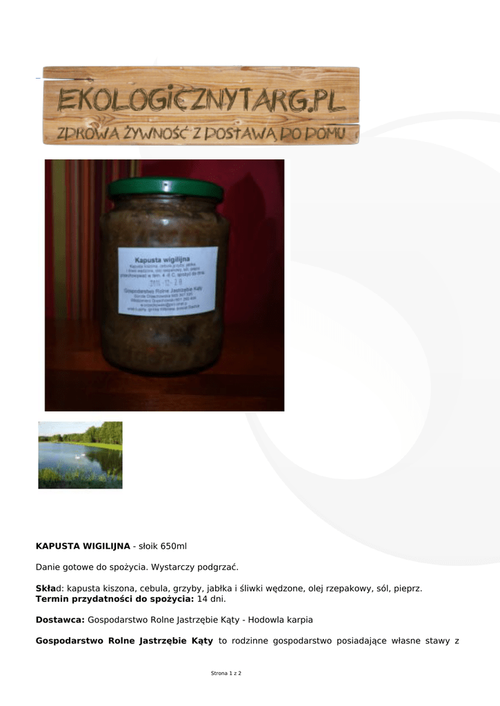 KAPUSTA WIGILIJNA - słoik 650ml Danie gotowe do spożycia. Wystarczy podgrzać. Skład: kapusta kiszona, cebula, grzyby, jabłka i śliwki wędzone, olej rzepakowy, sól, pieprz. Termin przydatności do spożycia: 14 dni. Dostawca: Gospodarstwo Rolne Jastrzębie Kąty - Hodowla karpia Gospodarstwo Rolne Jastrzębie Kąty to rodzinne gospodarstwo posiadające własne stawy z Strona 1 z 2 karpiem. Dania z karpia wytwarzane są ręcznie przez Panią Dorotę i Pana Włodka, którzy z pasją i miłością podchodzą do swojej pracy. Ma to odzwierciedlenie w niesamowitym smaku ich wyrobów. Pasztet z karpia, karp po grecku, po żydowsku, w kapuście, w galarecie oraz w marynacie zachwyca podniebienia klientów znanego warszawskiego targu zdrowej żywności. Wysoką jakość surowca potwierdzają także badania Zakładu Toksykologii i Ochrony Środowiska na Uniwersytecie Przyrodniczym w Lublinie. Natomiast pulpety z karpia to hit na stoliku naszych dzieci, które są naprawdę wybrednymi konsumentami. Warzywa dodawane do dań pochodzą z ogródka Pani Doroty, dla których Państwo Dorota i Włodek starają się o zdobycie ekologicznego certyfikatu. Oprócz przetworów z karpia, Pani Dorota gotuje pyszne domowe zupy. Nie zawierają one żadnych konserwantów, ani polepszaczy smaku. Po prostu tuż po ich przygotowaniu są wekowane w słoiki. Jak od mamy. Na Państwa stół trafią na drugi dzień po ugotowaniu. Czyli jak od mamy :) Produkt niepolecany do wysyłki kurierem. Strona 2 z 2