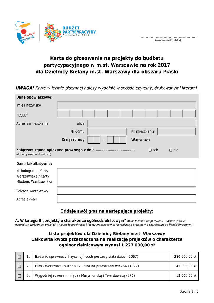 ..................................................................... (miejscowość, data) Karta do głosowania na projekty do budżetu partycypacyjnego w m.st. Warszawie na rok 2017 dla Dzielnicy Bielany m.st. Warszawy dla obszaru Piaski UWAGA! Kartę w formie pisemnej należy wypełnić w sposób czytelny, drukowanymi literami. Dane obowiązkowe: Imię i nazwisko PESEL1) Adres zamieszkania ulica Nr domu Kod pocztowy Nr mieszkania - Warszawa Załączam zgodę opiekuna prawnego z dnia ……………………………… tak nie (dotyczy osób małoletnich) Dane fakultatywne: Nr hologramu Karty Warszawiaka / Karty Młodego Warszawiaka Telefon kontaktowy Adres e-mail Oddaję swój głos na następujące projekty: A. W kategorii „projekty o charakterze ogólnodzielnicowym” (pole wielokrotnego wyboru - całkowity koszt wszystkich wybranych projektów nie może przekraczać kwoty przeznaczonej na realizację projektów o charakterze ogólnodzielnicowym) Lista projektów dla Dzielnicy Bielany m.st. Warszawy Całkowita kwota przeznaczona na realizację projektów o charakterze ogólnodzielnicowym wynosi 1 227 000,00 zł □ 1. Badanie sprawności fizycznej i cech postawy ciała dzieci (1067) 280 000,00 zł □ 2. Film - Warszawa, historia i kultura na przestrzeni wieków (1077) 45 000,00 zł □ 3. Wygodniej rowerem między Marymoncką i Twardowską (876) 13 000,00 zł Strona 1 / 5 □ 4. Kino b-bezpłatne w Bibliotece i na Bielanach (299) 45 120,00 zł □ 5. Doświetlenie przejścia dla pieszych - ul. Sokratesa x Balzaka (1114) 39 300,00 zł □ 6. Gimnastyczna Ścieżka Zdrowia (874) 72 200,00 zł □ 7. Niebieski Skatepark (869) □ 8. Narysowana Warszawa - Bielany (668) 33 413,00 zł □ 9. Miejsce rekreacyjne - Przystań Młociny (749) 10 000,00 zł □ 10. Bezpieczne przejście na ul. Estrady (298) □ 11. Wolna wola – nauka odpierania manipulacji dla mieszkańców Bielan (850) □ 12. Skwer bielański - Salonik Reymontowski (884) □ 13. Chodź na spacer! - audioprzewodnik po Bielanach (1457) 17 500,00 zł □ 14. Powstańcze śpiewanie-Bielany pamiętają i śpiewają dla nich (846) 40 000,00 zł □ 15. Życie zaczyna się po 60-ce (1800) □ 16. Aktywny kibic piłkarski (1083) □ 17. Uzupełnienie sieci tras rowerowych na Bielanach (229) 251 000,00 zł □ 18. Dofinansowanie zakupu książek, audiobooków i czytników dla Biblioteki Publicznej w Dzielnicy Bielany (2040) 137 500,00 zł □ 19. Telewizja Bielany (2328) 286 285,00 zł □ 20. Sportowe Bielany (2247) 151 200,00 zł □ 21. Hutnik w służbie Dzielnicy - obchody 60-lecia (1081) □ 22. Boisko "D" Hutnik Warszawa (1035) □ 23. Nowa hala na Bielanach (291) □ 24. Jak rozpoznać zagrożenie? - profilaktyka raka na Bielanach (1230) □ 25. Plac zabaw dla młodszych dzieci - Dantego 7/Szekspira 4 (581) 300 000,00 zł □ 26. Biblioteka dla seniora - mówiące i powiększone książki (1376) 96 270,00 zł □ 27. Aktywni i kreatywni (1680) 44 400,00 zł □ 28. Kompleks boisk G75 (2329) □ 29. Zewnętrzna ścianka wspinaczkowa (1364) □ 30. Projekt 50+ - kurs języka angielskiego dla dorosłych (1463) 120 000,00 zł 250 000,00 zł 44 950,00 zł 255 000,00 zł 153 400,00 zł 60 000,00 zł 46 000,00 zł 1 000 000,00 zł 799 500,00 zł 10 000,00 zł 1 001 170,00 zł 421 650,00 zł 14 512,00 zł Strona 2 / 5 □ 31. Montaż wyświetlaczy informujących o najbliższych odjazdach pojazdów komunikacji naziemnej na peronach stacji metra Słodowiec (2094) □ 32. Budowa ścieżki rowerowej wzdłuż ulicy Wólczyńskiej - od ronda Peszkowskiego (skrzyżowanie Wólczyńskiej z Arkuszową) do torów (1532) □ 33. "Ruch to zdrowie" - zajęcia sportowe dla osób 50+: fitness, aquaaerobik, siłownia oraz wykłady - profilaktyka prozdrowotna (2326) □ 34. Las bielański - miejsce rodzinnej rekreacji (102) □ 35. Życzliwość wobec kobiet w ciąży dla mieszkanek Bielan (1150) □ 36. Słoń bielański przy Stawach Brustmana (1340) 63 000,00 zł □ 37. Doświetlenie przejścia dla pieszych ul. Sokratesa nr 9 (1104) 39 300,00 zł □ 38. Zestaw boisk do mini golfa 18 stanowisk (1018) 375 100,00 zł □ 39. "Słowowskazy" na Bielanach. Obiekty małej architektury wprowadzające element kulturalny w przestrzeń dzielnicy (1814) 214 000,00 zł □ 40. Wielka piramida linowa w Parku Młocińskim (782) □ 41. Rewitalizacja Placu zabaw dla dzieci przy Stawach Brustmana na Wawrzyszewie (598) 851 000,00 zł □ 42. Rewitalizacja terenu przy budynku Straży Pożarnej (1591) 158 500,00 zł □ 43. "Zjednoczenia 25" - Oddolna Bielańska Inicjatywa Społeczna (1321) 299 000,00 zł □ 44. Młodzi Bielańczycy (1024) Wybrałam(/-łem) 72 000,00 zł 1 175 000,00 zł 145 130,00 zł 50 000,00 zł 2 900,00 zł 90 000,00 zł 47 697,00 zł projekt(y/-ów) o charakterze ogólnodzielnicowym, (liczba słownie) których łączny koszt realizacji wynosi zł (kwota liczbowa) B. W kategorii „projekty o charakterze lokalnym” (pole wielokrotnego wyboru - całkowity koszt wszystkich wybranych projektów nie może przekraczać kwoty przeznaczone na realizację projektów o charakterze lokalnym w obszarze terytorialnym) Lista projektów dla Dzielnicy Bielany m.st. Warszawy dla obszaru Piaski Całkowita kwota przeznaczona na realizację projektów o charakterze lokalnym w obszarze terytorialnym wynosi 900 000,00 zł □ 1. Zatoczka autobusowa na przystanku przy ulicy Lucjana Rudnickiego (przystanek Kochanowskiego 01 dla linii 103, 122, 180, 197, 409) (29) □ 2. Równo na Reymonta rowerem (239) □ 3. Siłownia zewnętrzna ul. Kochanowskiego 13A (1188) 30 000,00 zł 500 000,00 zł 40 000,00 zł Strona 3 / 5 □ 4. Program "Słowo i obraz - czytam i rysuję" (1193) 13 400,00 zł □ 5. Zestaw boisk do gry w mini golfa 18 stanowisk (1020) 69 000,00 zł □ 6. Rewitalizacja placu zabaw o powierzchni 650m kw. (588) □ 7. Scena z zadaszeniem na placu zabaw Kochanowskiego 22 (1185) Wybrałam(/-łem) 257 339,00 zł 98 000,00 zł projekt(y/-ów) o charakterze 