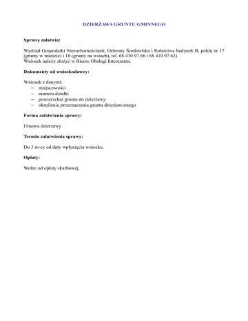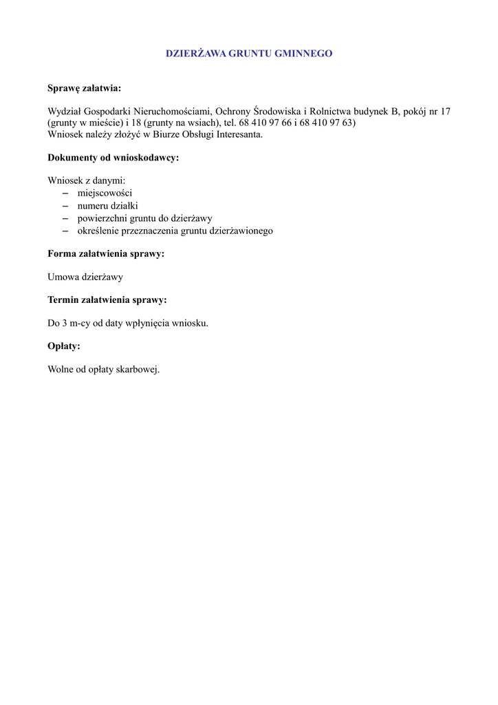 DZIERŻAWA GRUNTU GMINNEGO Sprawę załatwia: Wydział Gospodarki Nieruchomościami, Ochrony Środowiska i Rolnictwa budynek B, pokój nr 17 (grunty w mieście) i 18 (grunty na wsiach), tel. 68 410 97 66 i 68 410 97 63) Wniosek należy złożyć w Biurze Obsługi Interesanta. Dokumenty od wnioskodawcy: Wniosek z danymi: – miejscowości – numeru działki – powierzchni gruntu do dzierżawy – określenie przeznaczenia gruntu dzierżawionego Forma załatwienia sprawy: Umowa dzierżawy Termin załatwienia sprawy: Do 3 m-cy od daty wpłynięcia wniosku. Opłaty: Wolne od opłaty skarbowej.