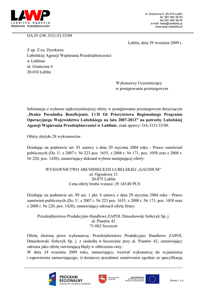 ul. Graniczna 4, 20-010 Lublin tel. 081 462 38 00 fax 081 462 38 40 e-mail: [email protected] www.lawp.lubelskie.pl OA.IV.GW.3331/23-53/09 Lublin, dnia 29 września 2009 r. Z up. Z-ca. Dyrektora Lubelskiej Agencji Wspierania Przedsiębiorczości w Lublinie ul. Graniczna 4 20-010 Lublin Wykonawcy Uczestniczący w postępowaniu przetargowym Informacja o wyborze najkorzystniejszej oferty w postępowaniu przetargowym dotyczącym „Druku Poradnika Beneficjenta. I i II Oś Priorytetowa Regionalnego Programu Operacyjnego Województwa Lubelskiego na lata 2007-2013” na potrzeby Lubelskiej Agencji Wspierania Przedsiębiorczości w Lublinie; znak sprawy: OA.3331/23/09. Oferty złoŜyło 28 wykonawców. Działając na podstawie art. 91 ustawy z dnia 29 stycznia 2004 roku - Prawo zamówień publicznych (Dz. U. z 2007 r. Nr 223 poz. 1655, z 2008 r. Nr 171, poz. 1058 oraz z 2008 r. Nr 220, poz. 1420), zamawiający dokonał wyboru następującej oferty: WYDAWNICTWO ARCHIDIECEZJI LUBELSKIEJ „GAUDIUM” ul. Ogrodowa 12 20-075 Lublin Cena oferty brutto wynosi: 29 145,80 PLN Działając na podstawie art. 89 ust. 1 pkt. 6 ustawy z dnia 29 stycznia 2004 roku - Prawo zamówień publicznych (Dz. U. z 2007 r. Nr 223 poz. 1655, z 2008 r. Nr 171, poz. 1058 oraz z 2008 r. Nr 220, poz. 1420), zamawiający odrzucił ofertę firmy: Przedsiębiorstwo Produkcyjno Handlowe ZAPOL Dmochowski Sobczyk Sp. j. al. Piastów 42 71-062 Szczecin Ofertę złoŜoną przez wykonawcę: Przedsiębiorstwo Produkcyjno Handlowe ZAPOL Dmochowski Sobczyk Sp. j. z siedzibą w Szczecinie przy al. Piastów 42, zamawiający odrzuca jako ofertę zawierającą błędy w obliczeniu ceny. W dniu 24 września 2009 roku, zamawiający, wezwał wykonawcę do wyjaśnienia i zapewnienia zamawiającego, iŜ dostarczy przedmiot zamówienia zgodnie ze specyfikacją Strona 1 z 6 ul. Graniczna 4, 20-010 Lublin tel. 081 462 38 00 fax 081 462 38 40 e-mail: [email protected] www.lawp.lubelskie.pl istotnych warunków zamówienia. W celu ustalenia czy oferta zawiera raŜąco niską cenę w stosunku do przedmiotu zamówienia, zamawiający, wezwał wykonawcę do złoŜenia wyjaśnień dotyczących elementów oferty mających wpływ na wysokość ceny. W wyznaczonym terminie, wykonawca, zgodnie z wezwaniem zamawiającego informacji udzielił. Z przedstawionych wyjaśnień wynika, iŜ wykonawca w kalkulacji ceny oferty uwzględnił zerową stawkę podatku VAT (netto równe jest brutto). Zgodnie z informacją Naczelnika Pierwszego Urzędu Skarbowego w Kielcach z dnia 18 października 2004 roku, sygnatura: OG/005/321/PP2-443/109/2004, na podstawie art. 14a § 1 i art. 14b § 1 ustawy z dnia 29 sierpnia 1997 roku Ordynacja podatkowa (Dz. U. Nr 137 poz. 926 ze zm.): „w przypadku wykonywania usług polegających na drukowaniu ksiąŜek – usługa ta winna być opodatkowana stawką podatku VAT w wysokości 22%”. Działając na podstawie art. 89 ust. 1 pkt. 1 oraz 8 ustawy z dnia 29 stycznia 2004 roku Prawo zamówień publicznych (Dz. U. z 2007 r. Nr 223 poz. 1655, z 2008 r. Nr 171, poz. 1058 oraz z 2008 r. Nr 220, poz. 1420), zamawiający odrzucił ofertę firmy: OFICYNA DRUKARSKA Jacek Chmielewski ul. Sokołowska 12A 01-142 Warszawa Ofertę złoŜoną przez wykonawcę: OFICYNA DRUKARSKA Jacek Chmielewski z siedzibą w Warszawie przy ul. Sokołowskiej 12A, zamawiający odrzuca jako ofertę, która jest niezgodna z ustawą oraz jest niewaŜna na podstawie odrębnych przepisów. W dniu 24 września 2009 roku, zamawiający, wezwał wykonawcę do odpowiedzi na pytanie: czy złoŜona przez wykonawcę oferta została podpisana przy uŜyciu faksymile, podpisu odbitego stampilą lub innym mechanicznym sposobem? W wyznaczonym terminie, wykonawca, zgodnie z wezwaniem zamawiającego udzielił informacji, iŜ podpisy zostały dokonane za pomocą faksymili. Zgodnie z art. 82 ust. 2 ustawy z dnia 29 stycznia 2004 roku - Prawo zamówień publicznych (Dz. U. z 2007 r. Nr 223 poz. 1655, z 2008 r. Nr 171, poz. 1058 oraz z 2008 r. Nr 220, poz. 1420), ofertę składa się, pod rygorem niewaŜności, w formie pisemnej albo, za zgodą zamawiającego, w postaci elektronicznej, opatrzoną bezpiecznym podpisem elektronicznym weryfikowanym przy pomocy waŜnego kwalifikowanego certyfikatu. Zgodnie z art. 78 § 1 ustawy z dnia 23 kwietnia 1964 roku Kodeks cywilny (Dz. U. z 1964 r. Nr 16 poz. 93) – do zachowania pisemnej formy czynności prawnej wystarcza złoŜenie własnoręcznego podpisu na dokumencie obejmującym treść oświadczenia woli. Za komentarzem do ustawy z dnia 23 kwietnia 1964 roku Kodeks cywilny pod red. A. Kidyby (Kodeks cywilny. Komentarz. Tom I. Część ogólna, LEX, 2009) – „Nie jest nigdy podpisem w rozumieniu przepisu art. 78 § 1 k.c. tzw. faksymile (facsimile), …”. Strona 2 z 6 ul. Graniczna 4, 20-010 Lublin tel. 081 462 38 00 fax 081 462 38 40 e-mail: [email protected] www.lawp.lubelskie.pl Zamawiający nie wykluczył Ŝadnego wykonawcy z postępowania. Ponadto oferty złoŜyli następujący wykonawcy: K&K reklama poligrafia ul. Kasprowicza 8a/5 31-523 Kraków Wartość oferty brutto: 29 607,00 PLN; oferta otrzymała 98,44 pkt. w jedynym kryterium jakim była cena. BIMART s.c. M. Mulawa, A. Mulawa, P. Sokołowski ul. Dąbrowskiego 9A 58-304 Wałbrzych Wartość oferty brutto: 30 256,00 PLN; oferta otrzymała 96,33 pkt. w jedynym kryterium jakim była cena. Instytut Technologii Eksploatacji – Państwowy Instytut Badawczy ul. Pułaskiego 6/10 26-600 Radom Wartość oferty brutto: 31 662,42 PLN; oferta otrzymała 92,05 pkt. w jedynym kryterium jakim była cena. ABAKUS Tomasz Brząkała ul. Perłowa 7 55-200 Oława Wartość oferty brutto: 31 959,12 PLN; oferta otrzymała 91,20 pkt. w jedynym kryterium jakim była cena. DRUKARNIA KOLEJOWA KRAKÓW Sp. z o.o. ul. Bosacka 6 31-505 Kraków Wartość oferty brutto: 32 208,00 PLN; oferta otrzymała 90,49 pkt. w jedynym kryterium jakim była cena. OMEKO Jan Dworzański ul. Zawiła 65 d 30-390 Kraków Wartość ofer