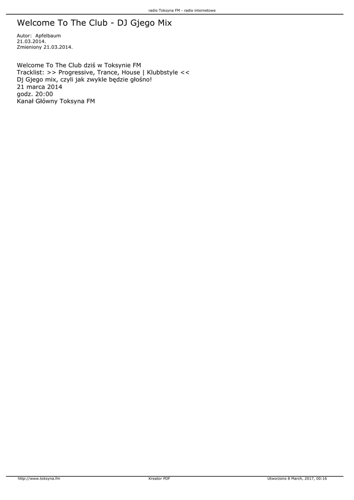 radio Toksyna FM - radio internetowe Welcome To The Club - DJ Gjego Mix Autor: Apfelbaum 21.03.2014. Zmieniony 21.03.2014. Welcome To The Club dziś w Toksynie FM Tracklist: >> Progressive, Trance, House | Klubbstyle << Dj Gjego mix, czyli jak zwykle będzie głośno! 21 marca 2014 godz. 20:00 Kanał Główny Toksyna FM http://www.toksyna.fm Kreator PDF Utworzono 8 March, 2017, 00:16