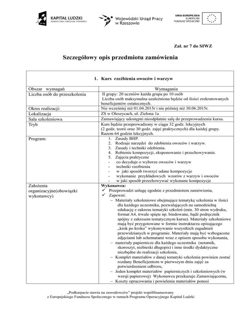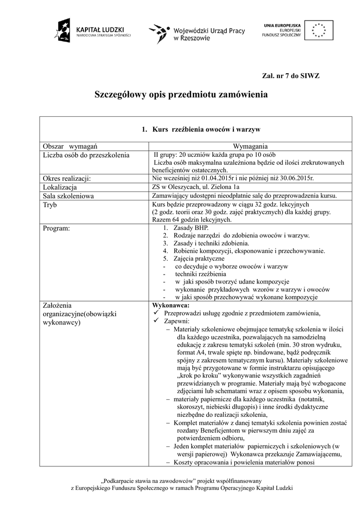 Zał. nr 7 do SIWZ Szczegółowy opis przedmiotu zamówienia 1. Kurs rzeźbienia owoców i warzyw Obszar wymagań Liczba osób do przeszkolenia Okres realizacji: Lokalizacja Sala szkoleniowa Tryb Program: Założenia organizacyjne(obowiązki wykonawcy) Wymagania II grupy: 20 uczniów każda grupa po 10 osób Liczba osób maksymalna uzależniona będzie od ilości zrekrutowanych beneficjentów ostatecznych. Nie wcześniej niż 01.04.2015r i nie później niż 30.06.2015r. ZS w Oleszycach, ul. Zielona 1a Zamawiający udostępni nieodpłatnie salę do przeprowadzenia kursu. Kurs będzie przeprowadzony w ciągu 32 godz. lekcyjnych (2 godz. teorii oraz 30 godz. zajęć praktycznych) dla każdej grupy. Razem 64 godzin lekcyjnych. 1. Zasady BHP. 2. Rodzaje narzędzi do zdobienia owoców i warzyw. 3. Zasady i techniki zdobienia. 4. Robienie kompozycji, eksponowanie i przechowywanie. 5. Zajęcia praktyczne - co decyduje o wyborze owoców i warzyw - techniki rzeźbienia - w jaki sposób tworzyć udane kompozycje - wykonanie przykładowych wzorów z warzyw i owoców - w jaki sposób przechowywać wykonane kompozycje Wykonawca: Przeprowadzi usługę zgodnie z przedmiotem zamówienia, Zapewni: Materiały szkoleniowe obejmujące tematykę szkolenia w ilości dla każdego uczestnika, pozwalających na samodzielną edukację z zakresu tematyki szkoleń (min. 30 stron wydruku, format A4, trwale spięte np. bindowane, bądź podręcznik spójny z zakresem tematycznym kursu). Materiały szkoleniowe mają być przygotowane w formie instruktarzu opisującego „krok po kroku” wykonywanie wszystkich zagadnień przewidzianych w programie. Materiały mają być wzbogacone zdjęciami lub schematami wraz z opisem sposobu wykonania, materiały papiernicze dla każdego uczestnika (notatnik, skoroszyt, niebieski długopis) i inne środki dydaktyczne niezbędne do realizacji szkolenia, Komplet materiałów z danej tematyki szkolenia powinien zostać rozdany Beneficjentom w pierwszym dniu zajęć za potwierdzeniem odbioru, Jeden komplet materiałów papierniczych i szkoleniowych (w wersji papierowej) Wykonawca przekazuje Zamawiającemu, Koszty opracowania i powielenia materiałów ponosi „Podkarpacie stawia na zawodowców” projekt współfinansowany z Europejskiego Funduszu Społecznego w ramach Programu Operacyjnego Kapitał Ludzki Wykonawca. Kurs będzie prowadzony zgodnie z harmonogramem uzgodnionym z Kierownikiem projektu , harmonogram musi być dostosowany do zajęć szkolnych uczestników oraz uwag Zamawiającego Ubezpieczy uczniów/uczennice od następstw nieszczęśliwych wypadków w czasie trwania kursu; ubezpieczenie winno obejmować uczestnictwo w szkoleniu, drogę do miejsca szkolenia oraz powrót do domu. Nieubezpieczenie spowoduje pełną odpowiedzialność Wykonawcy z tego tytułu. Wyda uczestnikom/uczestniczkom szkolenia, zaświadczenia o ukończeniu kursu na drukach MEN, zgodnie z § 18 ust. 2 rozporządzenia Ministra Edukacji i Nauki z dnia 11 stycznia 2012 r. w sprawie kształcenia ustawicznego w formach pozaszkolnych oraz certyfikaty o ukończeniu kursu. Certyfikaty powinny zawierać: logotyp w języku polskim, nazwę firmy szkolącej, numer certyfikatu, imię i nazwisko osoby, dla której został wystawiony, datę i miejsce urodzenia uczestnika kursu, nazwę szkolenia, informację o kursie: ilość godzin, datę szkolenia, miejscowość i datę wystawienia, nazwę projektu, informację o współfinansowaniu, pieczątkę i podpis wykonawcy. Przeprowadzi 2 ankiety (początkową i końcową) wśród uczestników szkolenia wraz z końcową ewaluacją, Zapewni w ramach usługi dla każdego uczestnika kursu: Owoce(np.: banan, jabłko, melon, arbuz, kiwi, cytryna, winogrono, ananas, gruszka i inne), warzywa (por, cebula, burak, rzodkiewki, cukinia, ogórek, kapusta pekińska, marchew, kalarepa, biała rzodkiew i inne) niezbędne do realizacji każdego punktu programu kursu, Odzież ochronną ( co najmniej ;fartuch, rękawice bawełniane oraz gumowe rozmiar S i M) narzędzia do przeprowadzenia kursu oraz sprzęt do zaprezentowania wykonanych dekoracji, Zapewni catering dla każdego uczestnika: jeden ciepły posiłek(w formie II dania obiadowego)bufet kawowy - bez ograniczeń: herbata(czarna, owocowa), kawa, 3 rodzaje kruchych ciastek, woda mineralna, sok, cukier, śmietanka, cytryna w plasterkach) w każdym dniu szkolenia Zobowiązuje się do: prowadzenia ciągłego nadzoru i kontroli merytorycznej nad realizacją usługi, prowadzenia dziennika zajęć, bieżącego informowania Zamawiającego o pojawiających się problemach w realizacji usługi, wydruku i stosowania list obecności, list odbioru cateringu, list odbioru materiałów szkoleniowych, list odbioru Certyfikatów oraz zaświadczeń, dziennika zajęć, przestrzegania oznakowania unijnego na w/w dokumentach, oznaczenia sali oraz wszelkich materiałów szkoleniowych symbolami identyfikującymi projekty realizowane w ramach POKL-u, Przekaże Zamawiającemu każdorazowo w terminie 7 dni po zakończeniu zajęć przez daną grupę szkoleniową komplet „Podkarpacie stawia na zawodowców” projekt współfinansowany z Europejskiego Funduszu Społecznego w ramach Programu Operacyjnego Kapitał Ludzki dokumentacji (kserokopię polisy NNW z imiennym wykazem uczniów , harmonogram, podpisane oryginały list obecności, list odbioru cateringu, list odbioru materiałów szkoleniowych, list odbioru Certyfikatów, zaświadczeń, kserokopii Certyfikatów, wydanych zaświadczeń, dziennika zajęć, ankiet wraz z ich końcową ewaluacją), Wystawi fakturę z wyszczególnieniem liczby uczestników. Wynagrodzenie będzie płatne przelewem w terminie do 30 dni od daty otrzymania faktury przez Zamawiającego. W sytuacji rezygnacji Beneficjenta przed rozpoczęciem szkoleń kwota na tego Beneficjenta zostanie odjęta od kwoty zamówienia. „Podkarpacie stawia na zawodowców” projekt współfinansowany z Europejskiego Funduszu Społecznego w ramach Programu O