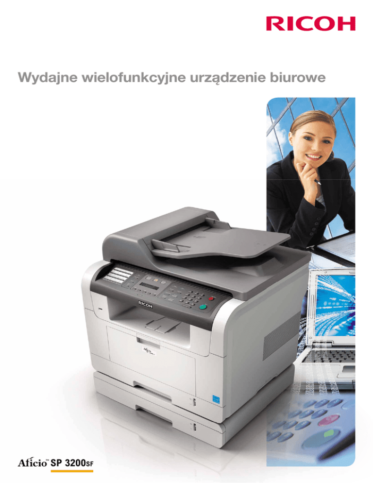 Wydajne wielofunkcyjne urządzenie biurowe SP 3200SF Nabiurkowe urządzenie wielofunkcyjne Kompaktowe urządzenie do zadań specjalnych Zwiększ wydajność dzięki zintegrowanej funkcjonalności drukowania, kopiowania, skanowania i faksowania. Najnowsze urządzenie wielofunkcyjne Ricoh formatu A4 AficioTMSP 3200SF to doskonałe rozwiązanie dla małych grup roboczych lub do zastosowań osobistych. Szeroka gama narzędzi zapewnia efektywną dystrybucję informacji: bezpośrednie drukowanie I skanowanie poprzez port USB, standardowa praca dwustronna, zdalne zarządzanie urządzeniem. Wbudowana karta sieciowa umożliwia w grupie roboczej a port USB pozwala na pracę indywidualną. Ponadto pełna funkcjonalność urządzenia w standardzie i zwarta budowa SP 3200SF nie wymaga praktycznie żadnej obsługi. • Uniwersalne urządzenie typu „wszystko-w-jednym”: drukarka, kopiarka, faks, kolorowy skaner • Wysoka wydajność: 28 stron na minutę (A4) • Praca dwustronna w standardzie • Bezpośrednie drukowanie i skanowanie z/do pamięci USB • Szeroka gama możliwości zarządzania dokumentami i urządzeniem Bezpośrednie podłączenie USB Zapisywanie dokumentów w pamięci USB sprawia, że mogą one być natychmiast przeniesione a ich obsługa niezwykle łatwa. AficioTMSP 3200SF sprawia, że praca z dokumentami jest jeszcze prostsza. Teraz nie trzeba już nawet włączać komputera aby wydrukować czy zeskanować dokument. Oprogramowanie do zarządzania dokumentami Przyjazny interfejs oprogramowania SmarThru4 umożliwia między innymi: • Łatwą edycję skanowanych dokumentów, zapisywanie, wysyłanie poprzez e-mail lub faks • Proste wykonanie częstych czynności dzięki funkcji ustawienia formatów kopiowania/skanowania, • Konwersję skanowanych dokumentów do pliku tekstowego w celu dalszej edycji, • Oszczędzać czas poprzez wysyłanie faksów bezpośrednio z komputera Poręczne drukowanie sieciowe Wielofunkcjonalność SP 3200SF może pochwalić się gotowością do pracy w sieci. Wielu użytkowników może zwiększyć swoją efektywność i zaoszczędzić przestrzeń biurową dzięki pracy sieciowej SP 3200SF. Standardowy interfejs zawiera Ethernet dla poprawnej instalacji w sieci, port równoległy oraz HIGH-SPEED USB 2.0 (połączenie lokalne) “Wszystko-w-jednym” AficioTMSP 3200SF jest naprawdę wielofunkcjonalne. Zautomatyzuj swoje codzienne zadania przy użyciu systemu obsługującego drukowanie PCL, kopiowanie, skanowanie najwyższej jakości oraz profesjonalne faksowanie biznesowe. Oszczędność miejsca, AficioTMSP 3200SF moża umieścić praktycznie w każdym miejscu bez naruszania ścisłej wyznaczonej przestrzeni biurowej. Szeroka gama wygodnych narzędzi • Sprawdź stan AficioTMSP 3200SF bez konieczności podchodzenia do niego używając przeglądarki internetowej (Web Image Monitor). • Utrzymuj wysoką jakość kopii podczas kopiowania dokumentów z obrazami w tle, takich jak gazety (Funkcja kasowania tła) • Korzystaj z poręcznych funkcjonalności “wyślij do”, teraz możesz wysłać zeskanowane dokumenty bezpośrednio na adres e-mail, do innego PC, wyznaczonego folderu w sieci lub na serwer FTP. Wysoka wydajność Zaoszczędzasz czas i pieniądze. Wysoka prędkość działania: 28 stron na minutę oraz maksymalna pojemność papieru 550 arkuszy sprawiają, że Twoje dokumenty będą gotowe w mgnieniu oka. Oszczędność papieru i większa niezawodność dzięki pracy możliwa jest dwustronnej pracy. Automatyczny podajnik oryginałów pojemności 50 arkuszy sprawia, że nawet duże pliki dokumentów będą obsługiwane szybciej. stron na minutę (A4) Z dbałością o środowisko Jak wszystkie produkty Ricoh, AficioTMSP 3200SF odzwierciedla zobowiązanie Ricoh wobec środowiska poprzez: • Wykorzystywanie nie toksycznych materiałów • Funkcjonalność dupleksu już standard • Ekstremalnie niskie pobory mocy; • Czysta i cicha praca * Zgodnie z normą Unii Europejskiej RoHS (RoHS: Restriction of Hazardous Substances, July 2006). SP 3200SF SPECYFIKACJA KOPIARKA SKANER Skanowanie wiązką lasera/druk elektrofotograficzny Proces wywoływania suchego tonera jednoskładnikowego Tryby skanowania: Kolorowe (24 bit), Czarno-białe (8 bit) Rozdzielczość: 600 x 1,200 dpi (maksymalnie 4,800 x 4,800 dpi z interpolacją) Prędkość kopiowania: 28 kopii na minutę (A4) Rozmiar oryginału: Maksymalnie A4 Rozdzielczość: Maksymalnie 600 x 600 dpi Załączone sterowniki: TWAIN Kopie wielokrotne: Do 99 Proces kopiowania: Nagrzewanie: Poniżej 20 sekund Pierwsza kopia: Poniżej 8.5 sekund Zoom: 25 - 400% (w krokach co 1%) Pamięć: Pojemność papieru: FAKS Standardowo: Maksymalnie: 96 MB 320 MB Standardowo: Taca na 250 arkuszy Podajnik ręczny na 50 arkuszy 550 arkuszy Sieć: PSTN, PABX Zgodność: ITU-T, Super G3 Prędkość modemu: Maksymalnie 33.6 Kbps Rozdzielczość: Maksymalnie: Metoda kompresji: MH, MR, MMR, JPEG, JBIG 300 x 300 dpi Prędkość skanowania: Ok. 2.5 sek.1 50 arkuszy Szybkie wybieranie: Maksymalnie 240 numerów Pojemność tacy wyjściowej: 150 arkuszy (taca wewnętrzna) Wybieranie jednoprzyciskowe: Maksymalnie 30 numerów Format papieru: A6 - A4 Gramatura papieru: Taca na papier: Podajnik ręczny: ADF: Dupleks: Maksymalnie: Pojemność podajnika ADF: 60 - 90 g/m2 60 - 163 g/m2 47 - 105 g/m2 75 - 90 g/m2 Wymiary (Szer. x Głęb. x Wys.): 466 x 435 x 458 mm Waga: Poniżej 22.0 kg Zasilanie: 220 - 240 V, 50/60 Hz Pobór prądu: Praca: Tryb oszczędny: Tryb czuwania: Poniżej 520 W Poniżej 20 W Poniżej 150 W Pojemność pamięci: 6 MB (600 stron1) Potrzymanie pamięci: Tak OPROGRAMOWANIE • Web Image Monitor • Printer Settings Utility • SmarThru4 • ScanClair • Set IP • Status Monitor MATERIAŁY EKSPLOATACYJNE DRUKARKA Prędkość drukowania: 28 wydruków na minutę (A4) Język opisu strony: PCL6, PS3 Rozdzielczość: Maksymalnie 1,200 x 1,200 dpi Podłączenie: Ethernet 10 base-T/100 base-TX USB 2.0 Bi-directional IEEE 128