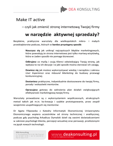 Make IT active – czyli jak zmienić stronę internetową Twojej firmy w narzędzie aktywnej sprzedaży? Bezpłatne, praktyczne warsztaty dla wielkopolskich mikro- i małych przedsiębiorstw podczas, których w bardzo przystępny sposób: Nauczysz się jak uniknąć najczęstszych błędów marketingowych, które powodują że strona internetowa jest tylko martwą wizytówką, która w żaden sposób nie pomaga biznesowi. Odkryjesz co myślą i czują Klienci odwiedzający Twoją stronę, jak wpływa to na ich decyzje i w jaki sposób można sterować ich uwagą. Dowiesz się jak możesz wykorzystywać wiedzę i narzędzia z zakresu User Experience oraz Inbound Marketing do budowy przewagi konkurencyjnej. Dostaniesz praktyczne, indywidualnie dostosowane do twojej firmy, porady i wskazówki mentorów. Opracujesz gotowy do wdrożenia plan działań zwiększających efektywność marketingową twojej firmy. Warsztaty prowadzone są z wykorzystaniem współczesnych, atrakcyjnych metod takich jak m.in. ko-kreacja i szybkie prototypowanie, przez zespół wzajemnie uzupełniających się mentorów: Dr Agata Filipowska z Katedry Informatyki Ekonomicznej Uniwersytetu Ekonomicznego wspiera uczestników od strony technicznej i analitycznej, podczas gdy psycholog Arkadiusz Dymalski dzieli się swoimi doświadczeniami w zakresie psychologii klienta, percepcji wizualnej oraz perswazji, przełożonymi na język nowych technologii. INFORMACJE ORGANIZACYJNE TERMIN: 24-27 września 2013 r. MIEJSCE: Concordia Design, ul Zwierzyniecka 3, Poznań RAMOWY HARMONOGRAM WARSZTATÓW: 24 WRZEŚNIA 10.00 – Wprowadzenie do warsztatów z udziałem Gościa Specjalnego 12.00-13.00 - Zainicjowanie pracy w trybie warsztatowymi: zapoznanie uczestników z zasadami i metodami pracy oraz komunikacji podczas warsztatów. 13.00 – Lunch 25 WRZEŚNIA 10.00 – Jak zaprząc stronę internetową do pracy – ABC User Experience 11.00 – Sesja ko-kreacji. Wykorzystanie checklisty do analizy własnej strony internetowej oraz zgromadzenia pomysłów na zmiany opartych o wyniki analizy uzyskane informacje zwrotne. 13.00 – Lunch 14.00 – Sesja szybkiego prototypowania. Przeprojektowanie strony internetowej z wykorzystaniem zdobytej wiedzy – zbudowanie papierowego mockupu. 26 WRZEŚNIA 10.00 – Inbound Marketing – przydatne narzędzia przyciągania i utrzymywania Klientów 11.00 – Sesja ko-kreacji. Wygenerowanie pomysłów i rozwiązań oraz dobór najbardziej optymalnych dla danego przedsiębiorstwa rozwiązań. 13.00 – Lunch 14.00 – Sesja szybkiego prototypowania. Zaprojektowanie połączeń poznanych technik z mockupem własnej strony. 27 WRZEŚNIA 09.00 – 18.00 - Indywidualne spotkania każdej uczestniczącej w warsztatach firmy z mentorami. Poświęcone szczegółom zastosowania poznanych na warsztacie rozwiązań w praktyce funkcjonowania ich firmy. W RAMACH WARSZTATÓW ZAPEWNIAMY: Dostęp do sieci Wi-FI, catering, certyfikat, materiały szkoleniowe i dużą dawkę inspiracji. Warsztaty odbywają się w ramach Światowych Dni Innowacji.