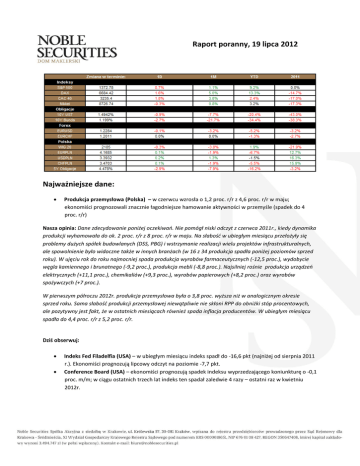 Raport poranny, 19 lipca 2012 Najważniejsze dane: Produkcja przemysłowa (Polska) – w czerwcu wzrosła o 1,2 proc. r/r z 4,6 proc. r/r w maju; ekonomiści prognozowali znacznie łagodniejsze hamowanie aktywności w przemyśle (spadek do 4 proc. r/r) Nasza opinia: Dane zdecydowanie poniżej oczekiwań. Nie pomógł niski odczyt z czerwca 2011r., kiedy dynamika produkcji wyhamowała do ok. 2 proc. r/r z 8 proc. r/r w maju. Na słabość w ubiegłym miesiącu przełożyły się problemy dużych spółek budowlanych (DSS, PBG) i wstrzymanie realizacji wielu projektów infrastrukturalnych, ale spowolnienie było widoczne także w innych branżach (w 16 z 34 produkcja spadła poniżej poziomów sprzed roku). W ujęciu rok do roku najmocniej spada produkcja wyrobów farmaceutycznych (-12,5 proc.), wydobycie węgla kamiennego i brunatnego (-9,2 proc.), produkcja mebli (-8,8 proc.). Najsilniej rośnie produkcja urządzeń elektrycznych (+11,1 proc.), chemikaliów (+9,3 proc.), wyrobów papierowych (+8,2 proc.) oraz wyrobów spożywczych (+7 proc.). W pierwszym półroczu 2012r. produkcja przemysłowa była o 3,8 proc. wyższa niż w analogicznym okresie sprzed roku. Sama słabość produkcji przemysłowej niewątpliwie nie skłoni RPP do obniżki stóp procentowych, ale pozytywny jest fakt, że w ostatnich miesiącach również spada inflacja producentów. W ubiegłym miesiącu spadła do 4,4 proc. r/r z 5,2 proc. r/r. Dziś obserwuj: Indeks Fed Filadelfia (USA) – w ubiegłym miesiącu indeks spadł do -16,6 pkt (najniżej od sierpnia 2011 r.). Ekonomiści prognozują lipcowy odczyt na poziomie -7,7 pkt. Conference Board (USA) – ekonomiści prognozują spadek indeksu wyprzedzającego koniunkturę o -0,1 proc. m/m; w ciągu ostatnich trzech lat indeks ten spadał zaledwie 4 razy – ostatni raz w kwietniu 2012r. Analiza techniczna: GPW FW20U12 Spadek, jaki pojawił się w przedpołudniowej fazie wczorajszej sesji kończy budowę 4.5-tygodniowej formacji RGR z linią sygnalną znajdującą się na poziomie 2 140 pkt. Wybicie w dół będzie się wiązać z sygnałem przedłużenia lipcowej korekty i uzyskaniem ok. 90-punktowego potencjału spadkowego. Szanse na realizację scenariusza opartego o formację RGR mocno spadną z chwilą wyjścia powyżej maksimów z pierwszej połowy tygodnia (2 179 pkt) – na dzień dzisiejszy takiemu rozwiązaniu sprzyja końcowy kształt wczorajszej świecy (młot). PKN Zapoczątkowana przed dwoma tygodniami korekta dynamicznej czerwcowej tendencji wzrostowej zaczęła przypominać formację zniżkującej chorągiewki. Potwierdzeniem jej byczej wymowy będzie wyjście ponad maksimum z ostatniej sesji (38.05). CD Red Korekta, która doprowadziła kurs w pobliże majowego dołka przyjęła formę opadającego rozszerzającego się klina. Wczorajsze wyjście ponad górne ramię klina sugeruje, iż korekta została zakończona i sygnalizuje możliwość ruchu w okolice punktu początkowego tej formacji (szczyt 5.13 z 29 czerwca). Analiza techniczna: Waluty EUR/USD Kurs eurodolara przebił w dniu dzisiejszym nowo wyrysowaną linię trendu spadkowego, a na wykresie dziennym wyrysowała się już trzecia z rzędu świeca w postaci młota, co daje szansę na kontynuację ruchu wzrostowego. Obecnie kurs kolejny raz walczy z poziomem 1,2296, od którego wcześniej odbił się już kilkukrotnie. Jeśli tym razem udałoby się trwale pokonać ten opór otworzyłoby to drogę do dalszych wzrostów do poziomów: 1,2333 (szczyt z 10 lipca), a następnie do 1,2363 (38,2% ostatniej fali spadkowej). Negacją powyższego scenariusza byłby powrót do spadków i przebicie linii trendu spadkowego, a w następnej kolejności ostatniego minimum z dnia wczorajszego na poziomie 1,2216. Jeszcze silniejsze wsparcie natomiast znajduje się przy ostatnim dołku z 13 lipca na poziomie 1,2162, którego przebicie mogłoby oznaczać silniejszą reakcję strony podażowej. EUR/PLN Kurs utrzymuje się wciąż w obrębie klina zniżkującego, przy jego dolnym ograniczeniu i jeśli poziom ten zostanie wybroniony kurs może zmierzać w kierunku górnego ograniczenia formacji w okolicach poziomu 4,1870. Trwałe wybicie tego miejsca, mogłoby być silnym sygnałem dla kupujących, a najbliższymi punktami oporu mogą okazać się okolice poprzednich szczytów: 4,2150 (szczyty z 12 i 13 lipca), a następnie 4,2560 (szczyty z 6 i 9 lipca). Jeśli jednak wyżej wspomniane wsparcie nie zostałoby obronione kurs ma szansę na dalsze spadki do poziomu 4,1465, przy którym znajduje się ostatni dołek z 1 i 2 maja. Przebicie tego poziomu mogłoby być silnym sygnałem dla sprzedających i dawałoby szansę na jeszcze większe umocnienie polskiego złotego, jednak do tego przydałoby się także silniejsze odreagowanie na eurodolarze. Departament Analiz Rynkowych Noble Securities S.A. Łukasz Wróbel , Główny Analityk [email protected] Tel: +48 600 942 105 Analiza techniczna – GPW: Krzysztof Ojczyk , Starszy Analityk [email protected] Tel: +48 12 422 31 00 w. 113 Analiza techniczna – waluty: Dominik Łebek, Departament Rynków Zagranicznych [email protected] Tel: +48 22 212 54 35 Jeżeli nie życzą sobie Państwo otrzymywać codziennego Przeglądu Rynków Noble Securities S.A., prosimy o odesłanie pustego maila z tematem "Wypisz_mnie". Niniejsze opracowanie jest jedynie materiałem informacyjnym do użytku odbiorcy. Materiał został przygotowany z należytą starannością i rzetelnością, na podstawie ogólnodostępnych informacji, ale ani autor, ani Noble Securities S.A. nie gwarantują jego kompletności i dokładności. Wszystkie opinie i prognozy przedstawione w tym opracowaniu są jedynie wyrazem opinii autora (autorów) w dniu publikacji i i nie są to opinie czy prognozy Noble Securities S.A., a opinie te lub prognozy mogą ulec zmianie bez zapowiedzi. Materiał nie został sporządzony zgodnie z wymogami określonymi w Rozporządzeniu Ministra Finansów z dnia 19 października 2005r. w 