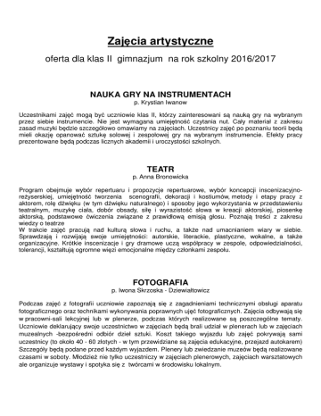 Zajęcia artystyczne oferta dla klas II gimnazjum na rok szkolny 2016/2017 NAUKA GRY NA INSTRUMENTACH p. Krystian Iwanow Uczestnikami zajęć mogą być uczniowie klas II, którzy zainteresowani są nauką gry na wybranym przez siebie instrumencie. Nie jest wymagana umiejętność czytania nut. Cały materiał z zakresu zasad muzyki będzie szczegółowo omawiamy na zajęciach. Uczestnicy zajęć po poznaniu teorii będą mieli okazję opanować sztukę solowej i zespołowej gry na wybranym instrumencie. Efekty pracy prezentowane będą podczas licznych akademii i uroczystości szkolnych. TEATR p. Anna Bronowicka Program obejmuje wybór repertuaru i propozycje repertuarowe, wybór koncepcji inscenizacyjnoreżyserskiej, umiejętność tworzenia scenografii, dekoracji i kostiumów, metody i etapy pracy z aktorem, rolę dźwięku (w tym dźwięku naturalnego) i sposoby jego wykorzystania w przedstawieniu teatralnym, muzykę ciała, dobór obsady, siłę i wyrazistość słowa w kreacji aktorskiej, piosenkę aktorską, podstawowe ćwiczenia związane z prawidłową emisją głosu. Poznają treści z zakresu wiedzy o teatrze W trakcie zajęć pracują nad kulturą słowa i ruchu, a także nad umacnianiem wiary w siebie. Sprawdzają i rozwijają swoje umiejętności: autorskie, literackie, plastyczne, wokalne, a także organizacyjne. Krótkie inscenizacje i gry dramowe uczą współpracy w zespole, odpowiedzialności, tolerancji, kształtują ogromne więzi emocjonalne między członkami zespołu. FOTOGRAFIA p. Iwona Skrzoska - Dziewiałtowicz Podczas zajęć z fotografii uczniowie zapoznają się z zagadnieniami technicznymi obsługi aparatu fotograficznego oraz technikami wykonywania poprawnych ujęć fotograficznych. Zajęcia odbywają się w pracowni-sali lekcyjnej lub w plenerze, podczas których realizowane są poszczególne tematy. Uczniowie deklarujący swoje uczestnictwo w zajęciach będą brali udział w plenerach lub w zajęciach muzealnych -bezpośredni odbiór dzieł sztuki. Koszt takiego wyjazdu lub zajęć pokrywają sami uczestnicy (to około 40 - 60 złotych - w tym przewidziane są zajęcia edukacyjne, przejazd autokarem) Szczegóły będą podane przed każdym wyjazdem. Plenery lub zwiedzanie muzeów będą realizowane czasami w soboty. Młodzież nie tylko uczestniczy w zajęciach plenerowych, zajęciach warsztatowych ale organizuje wystawy i spotyka się z twórcami w środowisku lokalnym. PROJEKTOWANIE SZTUKA W ŻYCIU –ŻYCIE W SZTUCE p. Iwona Skrzoska - Dziewiałtowicz Program zajęć artystycznych z projektowania przybliża uczniom techniki sztuki użytkowej, rysunku, i elementów grafiki. Pozwala na zapoznanie się z podstawami teorii różnorodnych zagadnień sztuki: (rysunku, sztuki użytkowej, grafiki i malarstwa). W głównej mierze zakłada ćwiczenia praktyczne z rysunku, malarstwa i grafiki na różnorodne tematy np.: portretu, przedmiotów użytkowych, mody, fryzur, ideałów piękna, architektury wnętrz, architektury budowli, architektury ogrodów, znaku i pisma w książce. Część teoretyczna ograniczona jest do niezbędnego minimum w zakresie historii sztuki oraz technik rysunkowych, malarskich i graficznych. Zdecydowana większość zajęć objętych programem ma charakter warsztatowo-praktyczny. Zajęcia odbywają się w pracowni-sali lekcyjnej lub w plenerze, podczas których realizowane są poszczególne tematy. Uczniowie deklarujący swoje uczestnictwo w zajęciach będą brali udział w plenerach lub w zajęciach muzealnych -bezpośredni odbiór dzieł sztuki. Koszt takiego wyjazdu lub zajęć pokrywają sami uczestnicy (to około 40 - 60 złotych - w tym przewidziane są zajęcia edukacyjne, wyżywienie w zależności od potrzeb, przejazd autokarem) Szczegóły będą podane przed każdym wyjazdem. Plenery lub zwiedzanie muzeów będą realizowane czasami w soboty. Młodzież nie tylko uczestniczy w zajęciach plenerowych, zajęciach warsztatowych ale organizuje wystawy i spotyka się z twórcami w środowisku lokalnym. ZAJĘCIA TECHNICZNE - MAJSTERKOWANIE p. Beata Kryża W trakcie cyklu zajęć uczniowie własnoręcznie wykonują różnego rodzaju dekoracje sceniczne do projektów szkolnych oraz tworzą własne projekty konstruktorskie. Istotnym elementem zajęć jest doskonalenie umiejętności manualnych oraz zapoznanie z podstawami stolarki, majsterkowania oraz budowania różnego rodzaju instalacji przestrzennych. Podczas zajęć uczniowie wykonują najróżniejsze czynności związane z majsterkowaniem. ZAJĘCIA TECHNICZNE Z ELEMENTAMI PROGRAMOWANIA p. Jarosław Affelt Celem zajęć jest wprowadzenie młodzieży w świat własnoręcznie budowanych robotów. Młodzież, która zechce uczestniczyć w zajęciach będzie mogła wykonać w ramach lekcji projekt gimnazjalny. Będzie on polegał na zbudowaniu i zaprogramowaniu sześcionożnego robota oraz przygotowaniu sprawozdania dokumentującego przebieg budowy. Ponadto uczniowie zapoznają się z podstawami elektroniki, nauczą się lutować i łączyć podstawowe schematy elektryczne. Zajęcia będą prowadzone w grupie TYLKO 10 osobowej. W przypadku większej liczby kandydatów uczestnicy zostaną wytypowani na podstawie testu kwalifikacyjnego.